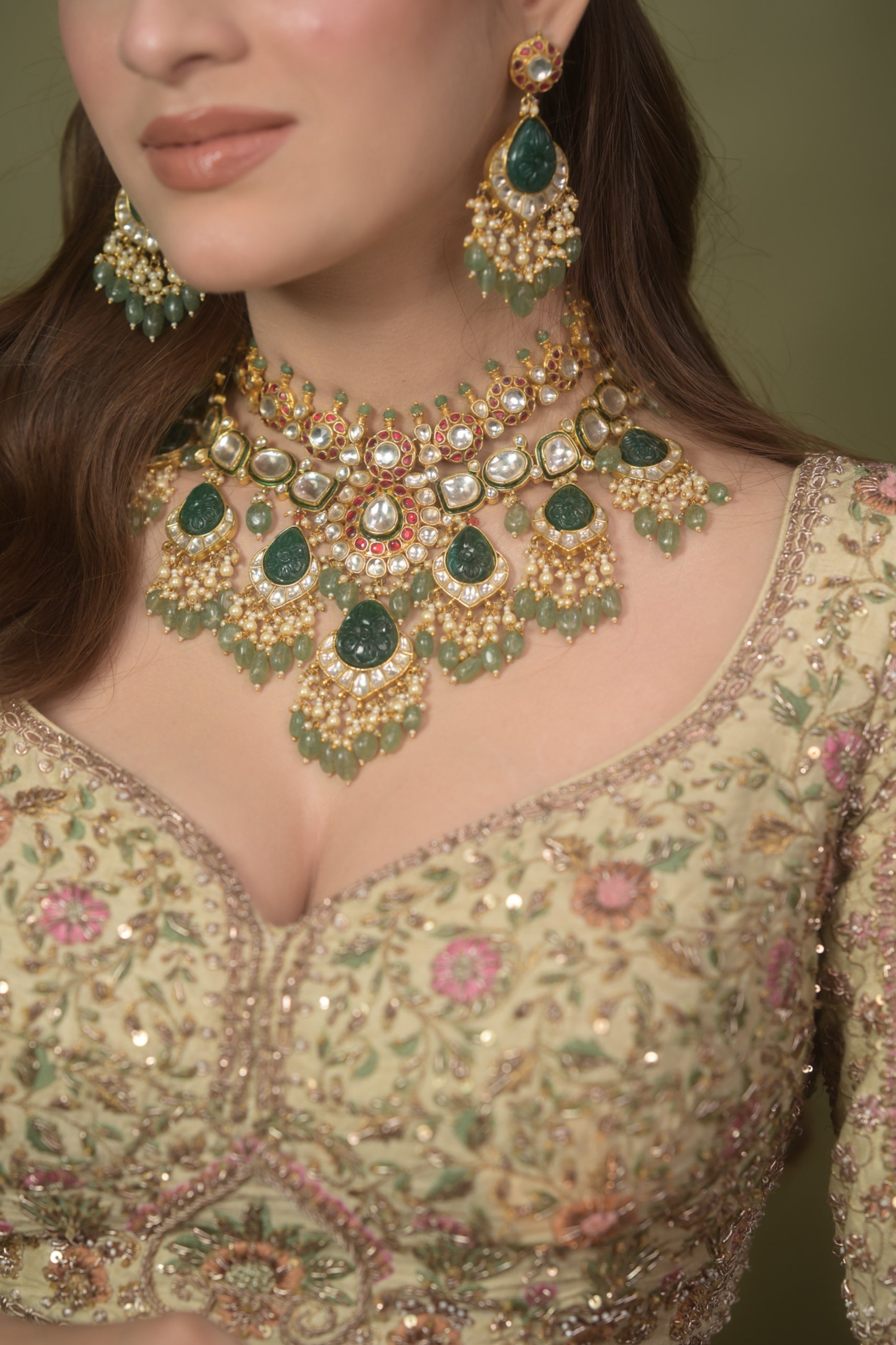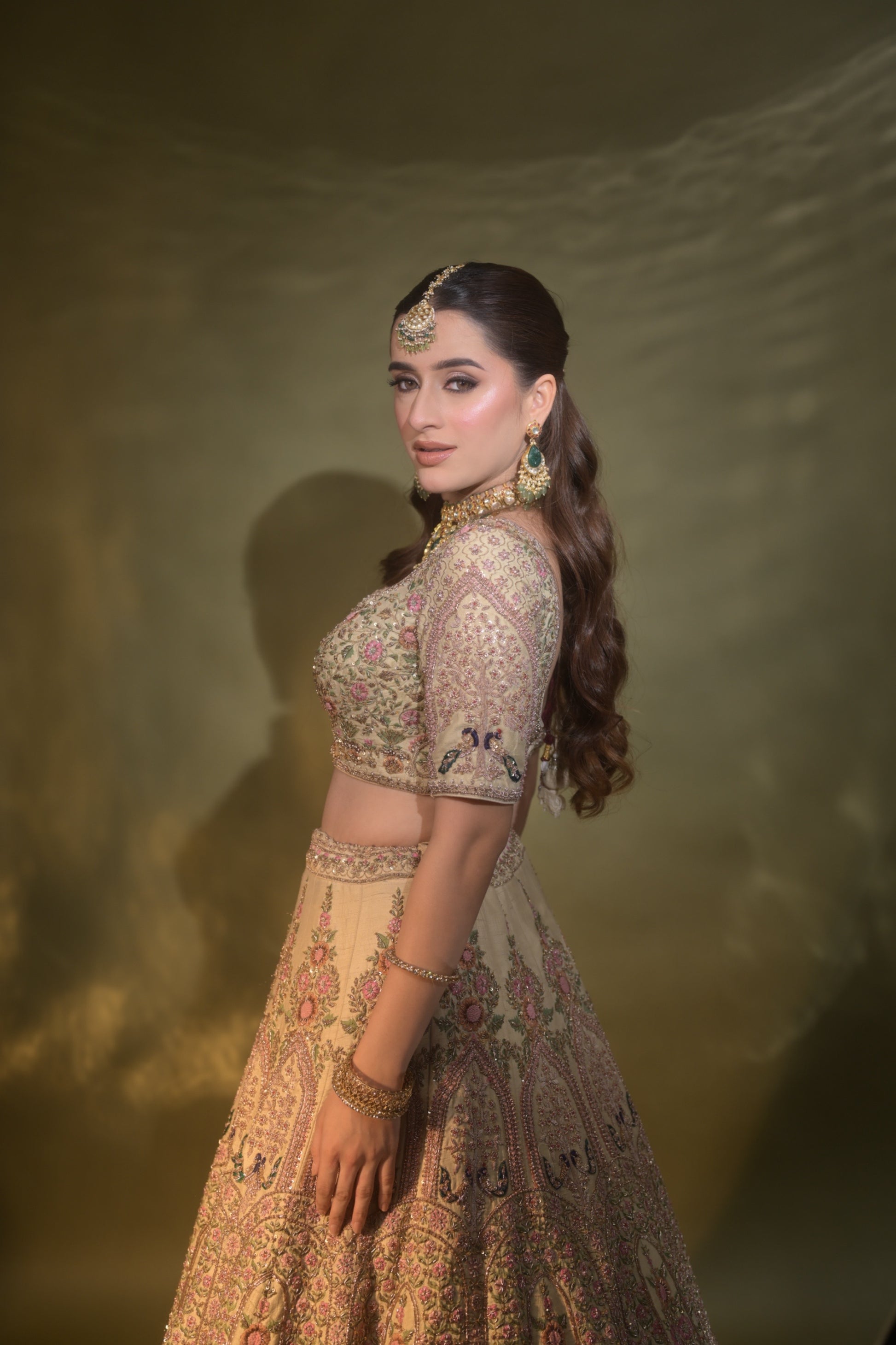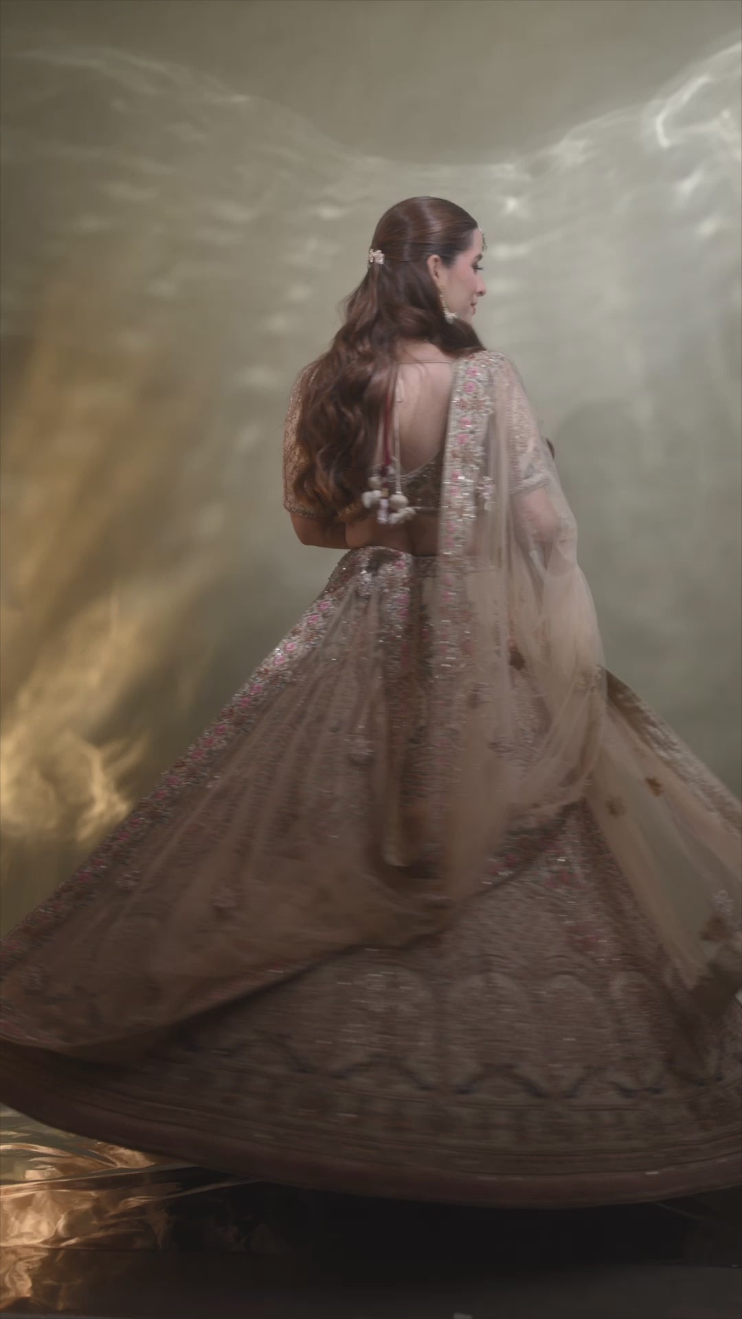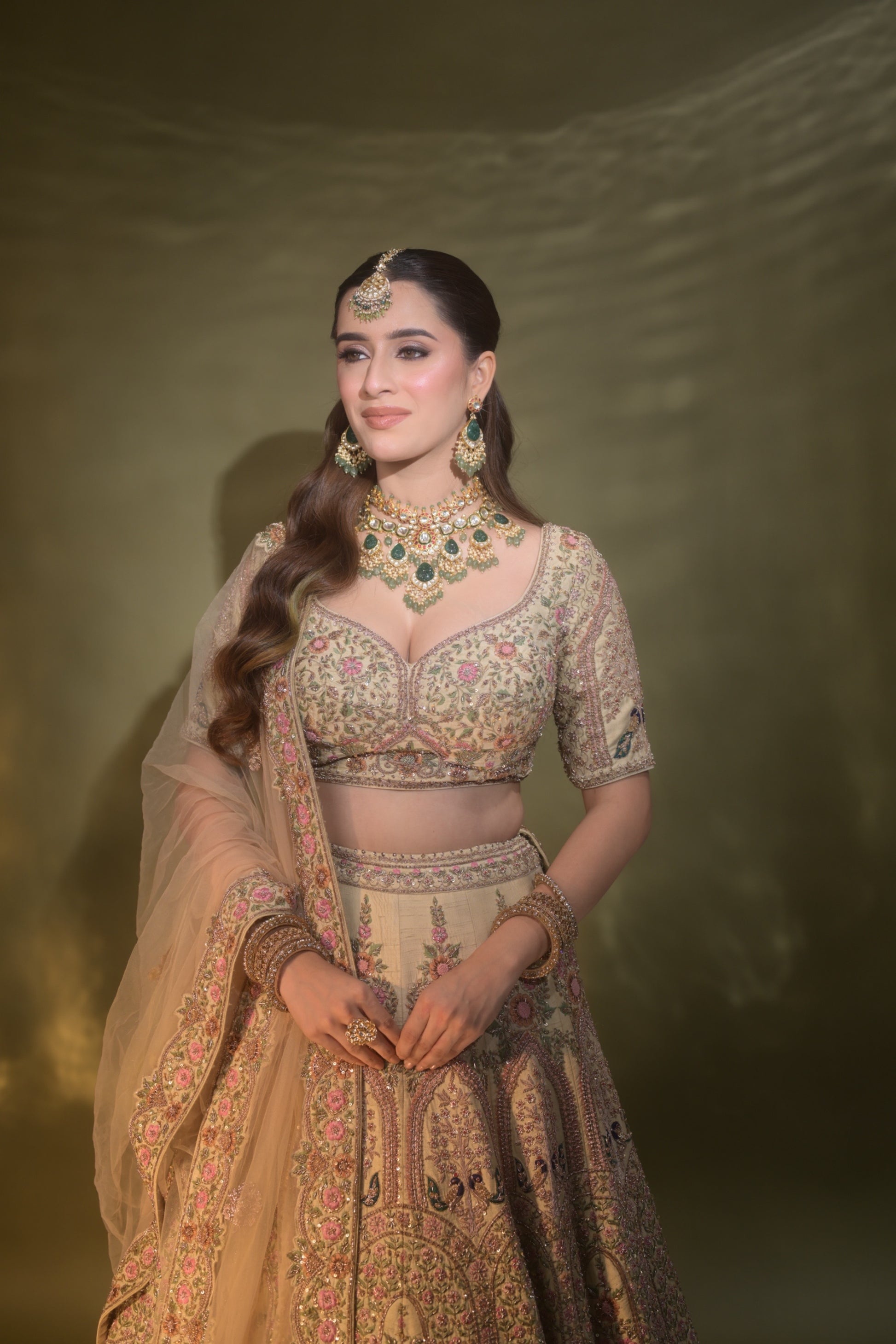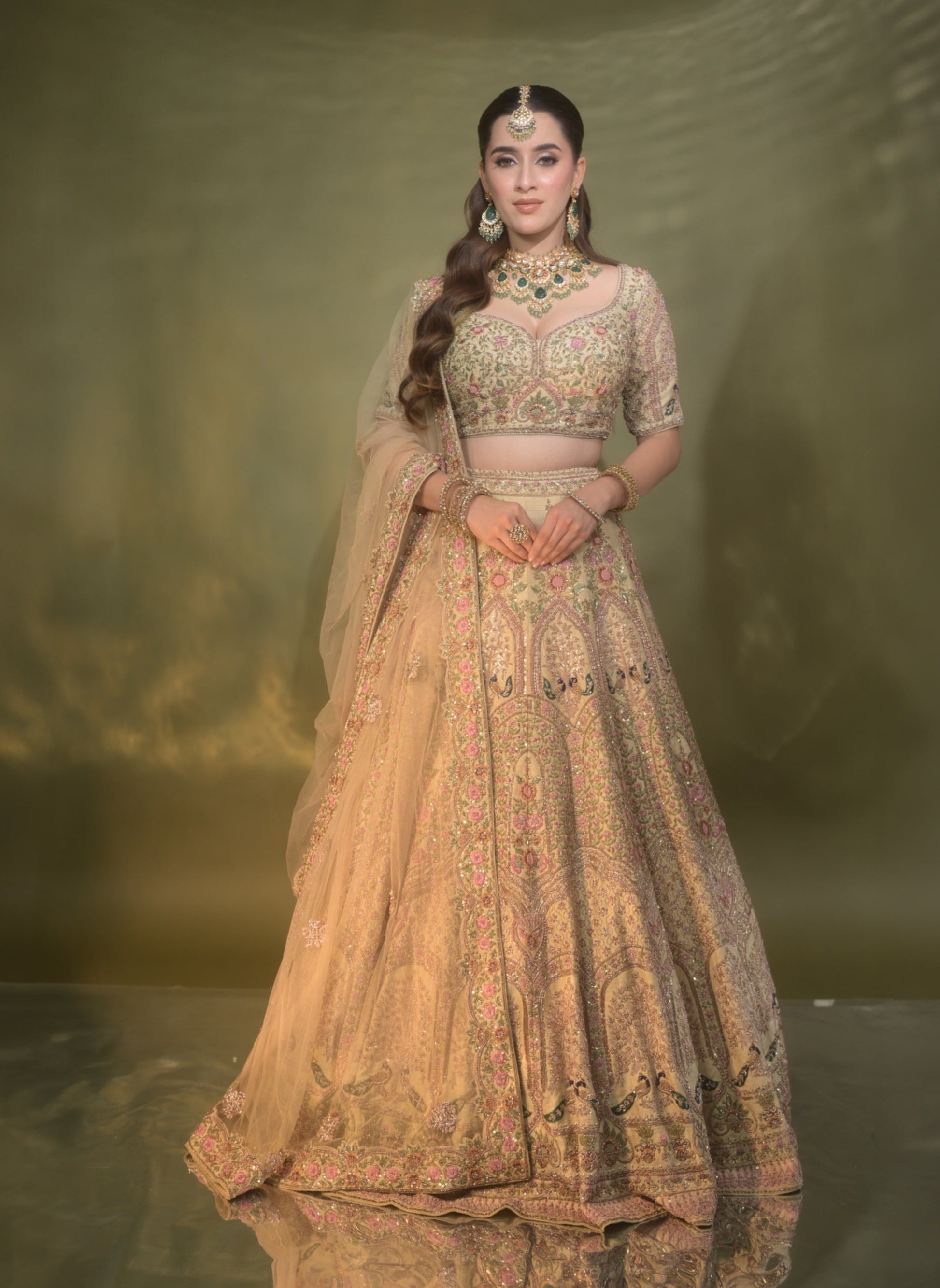 Delicate, dreamy, and designed to dazzle—this champagne gold lehenga features intricate floral embroidery with hints of pastel pink and green threadwork. The short-sleeved blouse and flowing dupatta with scalloped detailing add a romantic, feminine charm, perfect for daytime weddings, engagements, or garden receptions.