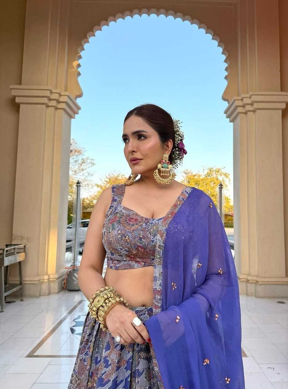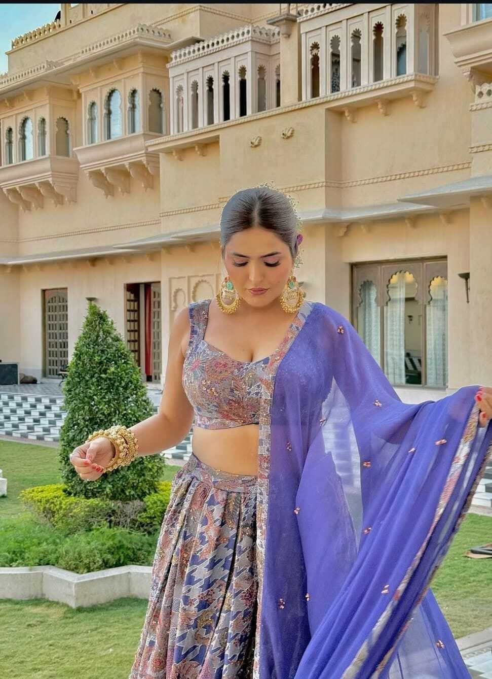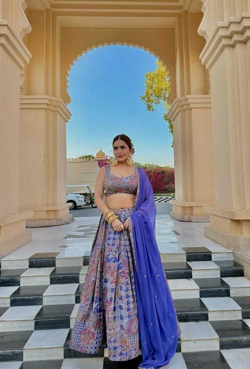 The lehenga features a unique pattern with a mix of blues, purples, and hints of red and gold, possibly depicting traditional motifs or contemporary designs. The fabric appears to have a subtle sheen. The choli is a sleeveless, cropped top with a scoop neckline, showcasing a contrasting or complementary pattern. A vibrant royal blue dupatta is draped over one shoulder and arm, adding a bold splash of color to the ensemble.