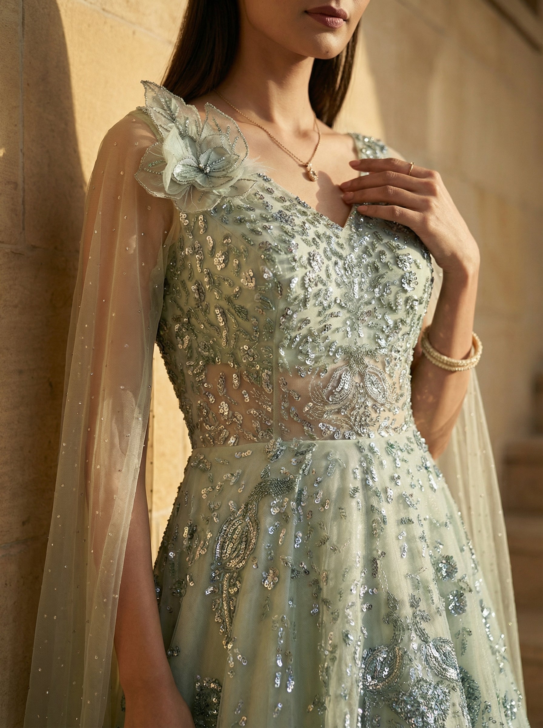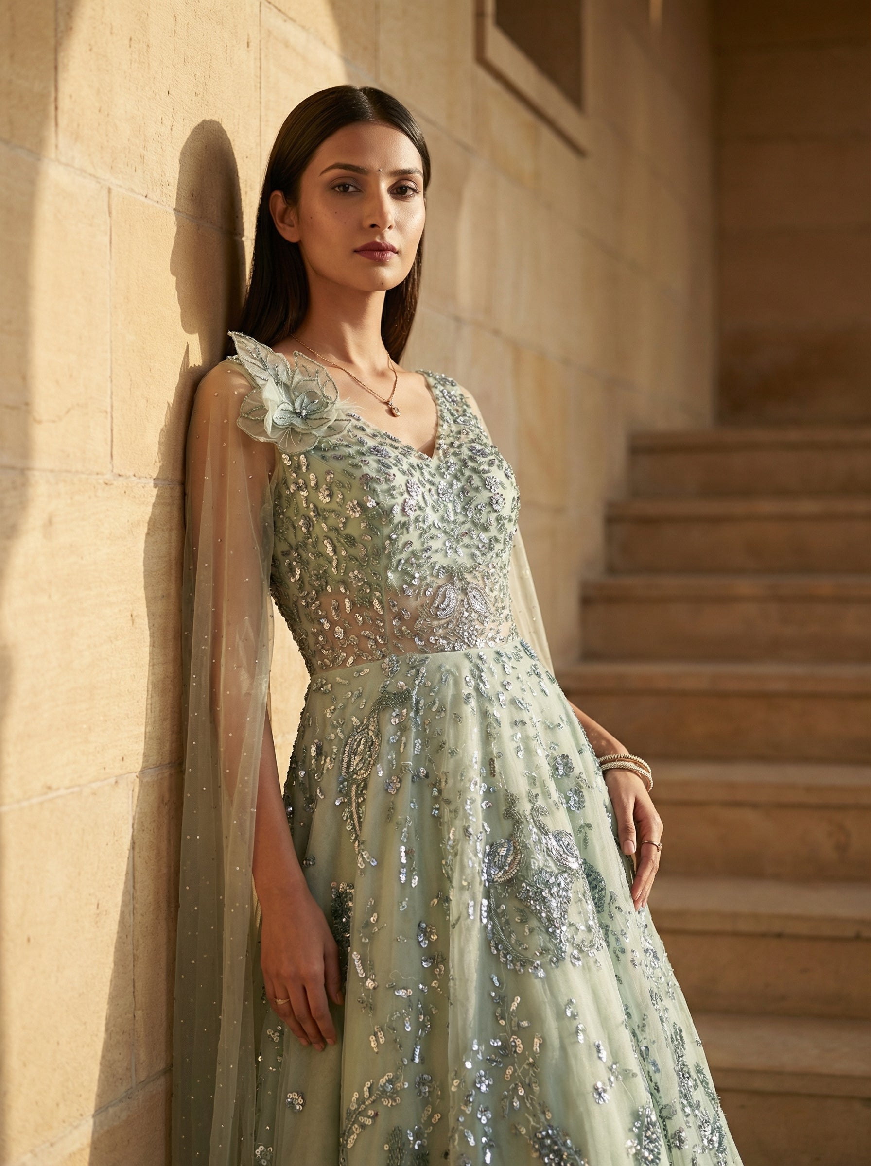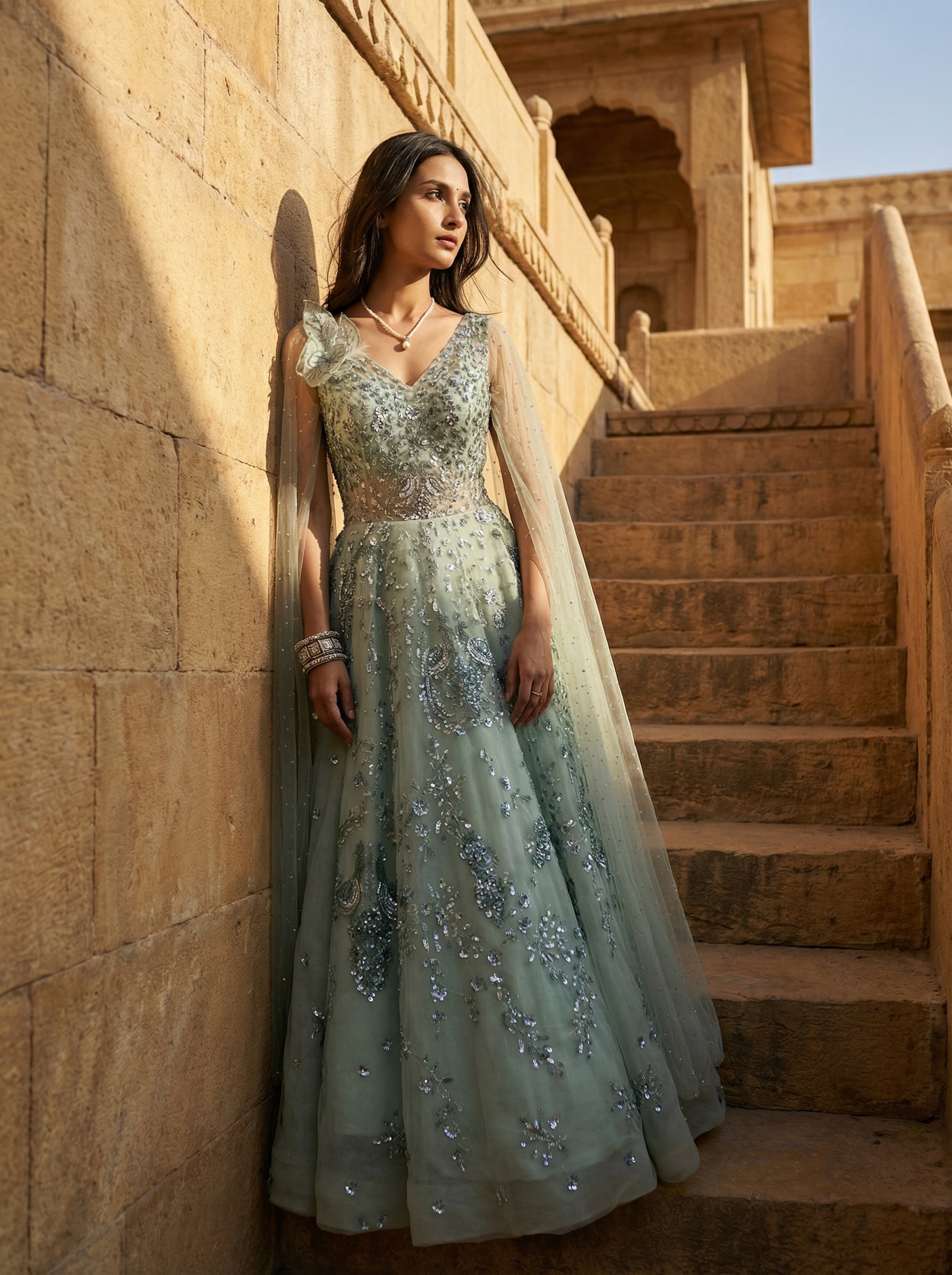 Aqua Marine captures the essence of coastal elegance with its refreshing palette and fluid silhouette. This expertly curated ensemble blends sophisticated draping with contemporary styling, perfect for those who appreciate understated luxury. The aquamarine tones evoke a sense of calm refinement, making it an ideal choice for elevated occasions or elevated everyday wear. Versatile enough to transition seamlessly from day to evening, this piece embodies timeless design with modern sensibility.