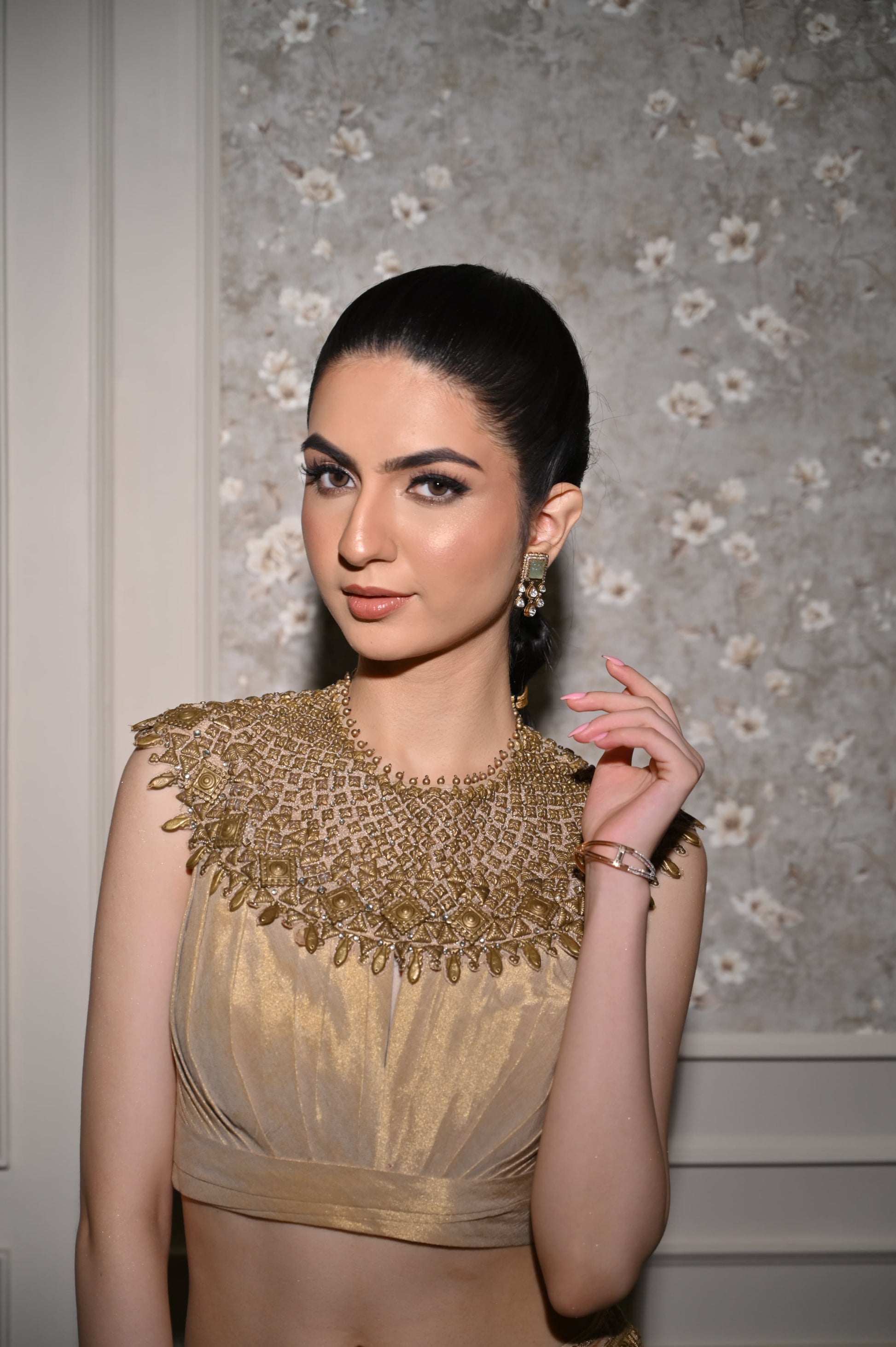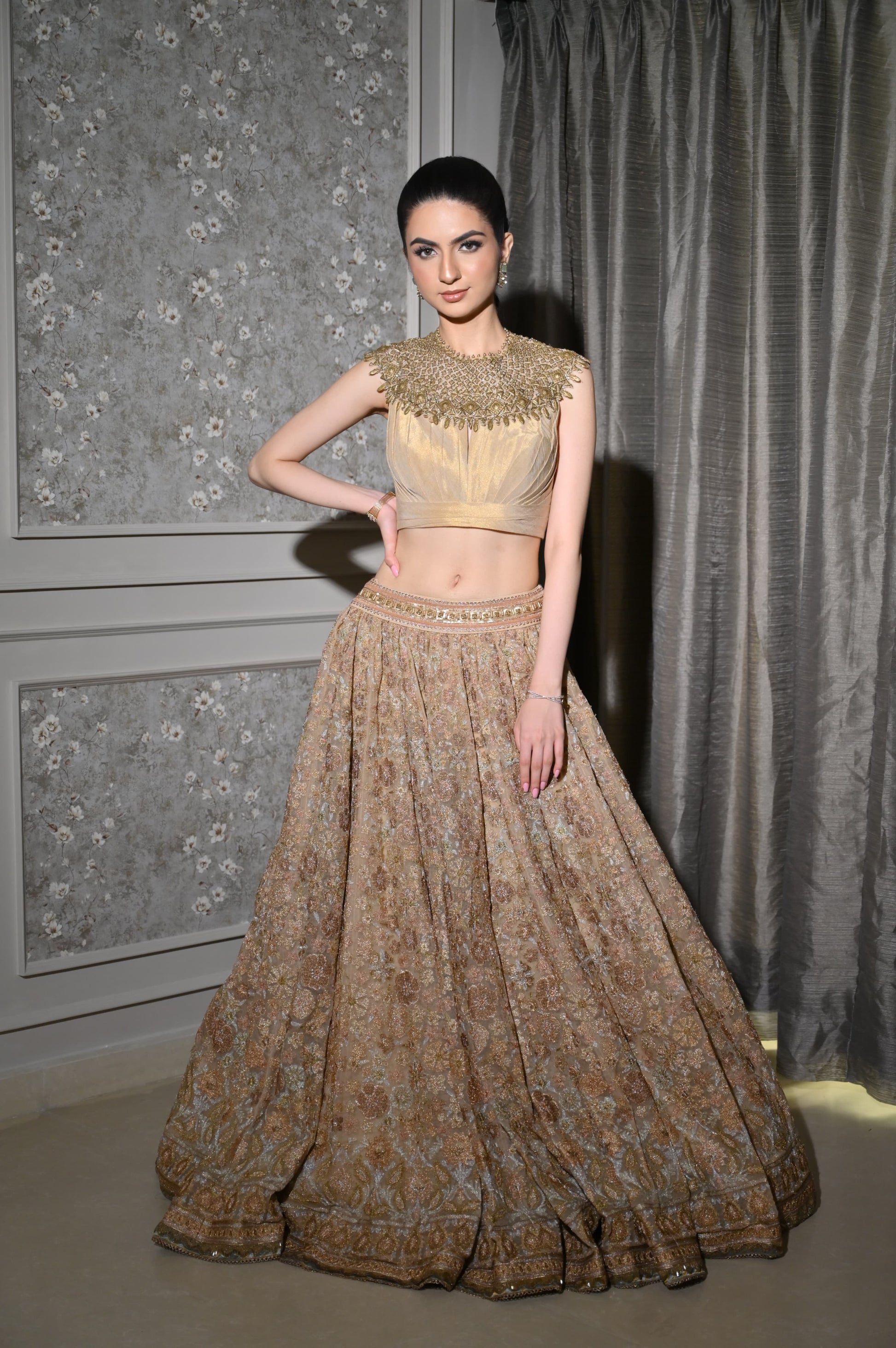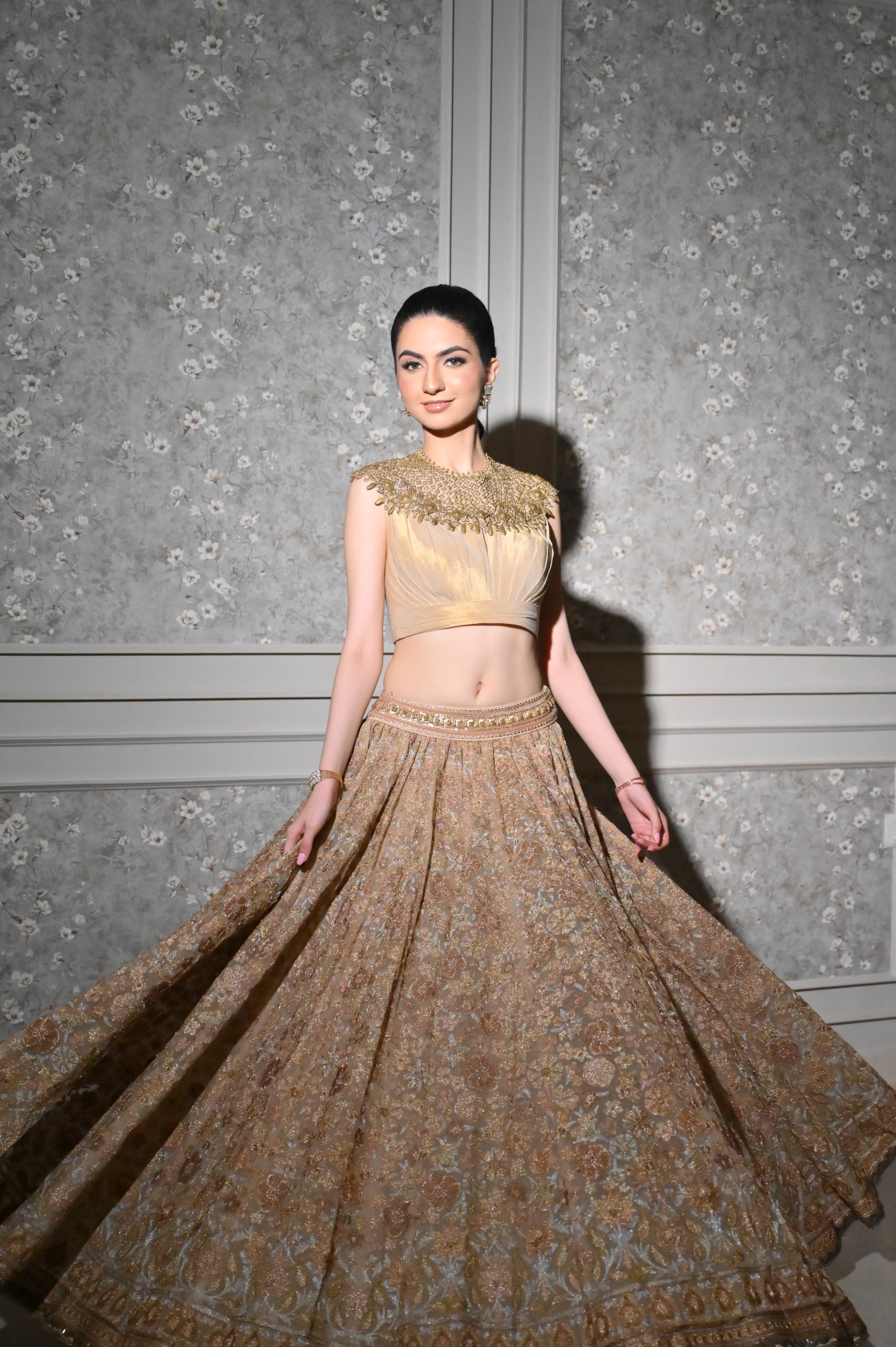 This outfit is a contemporary gold-embellished lehenga, blending modern elegance with traditional craftsmanship. It features: