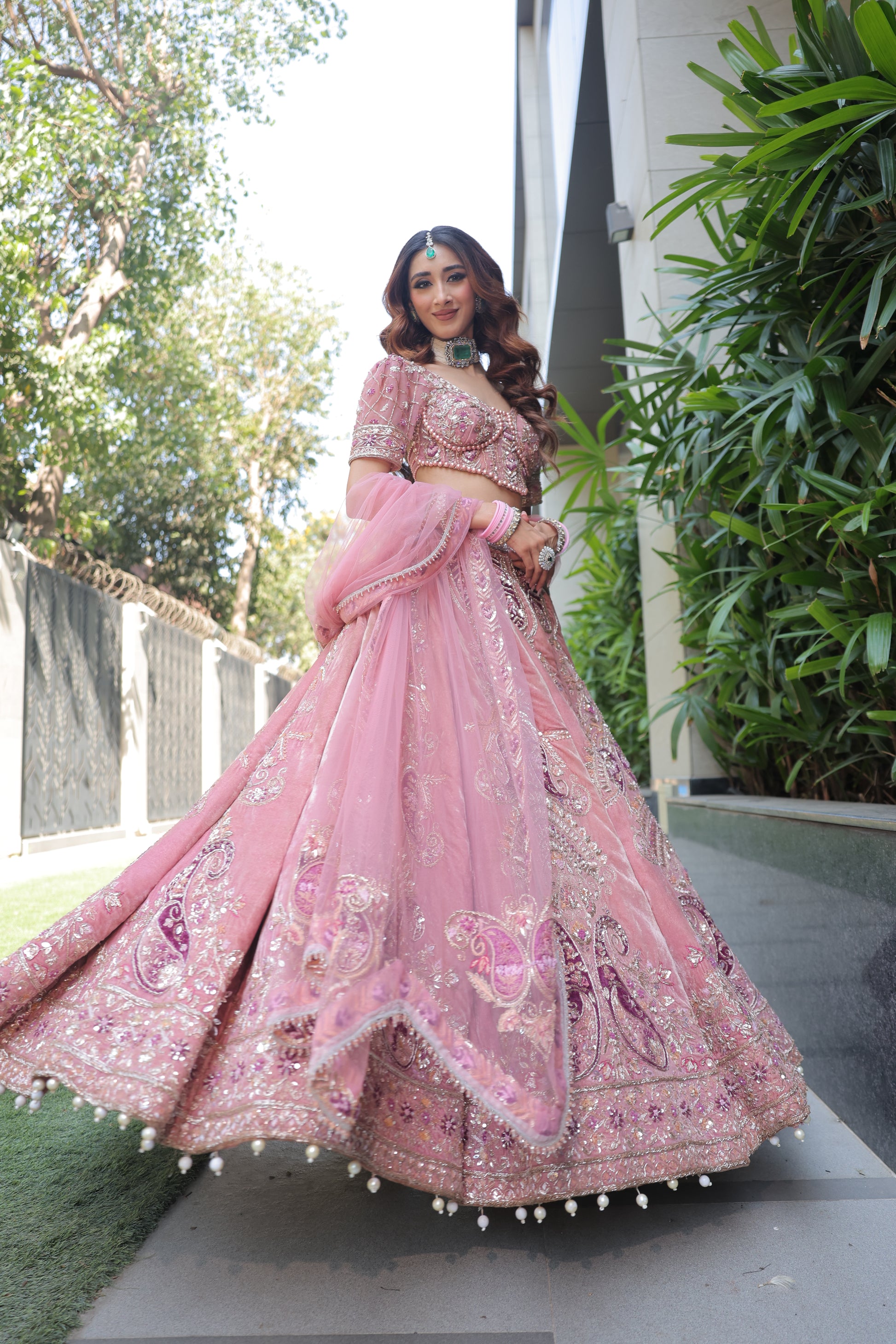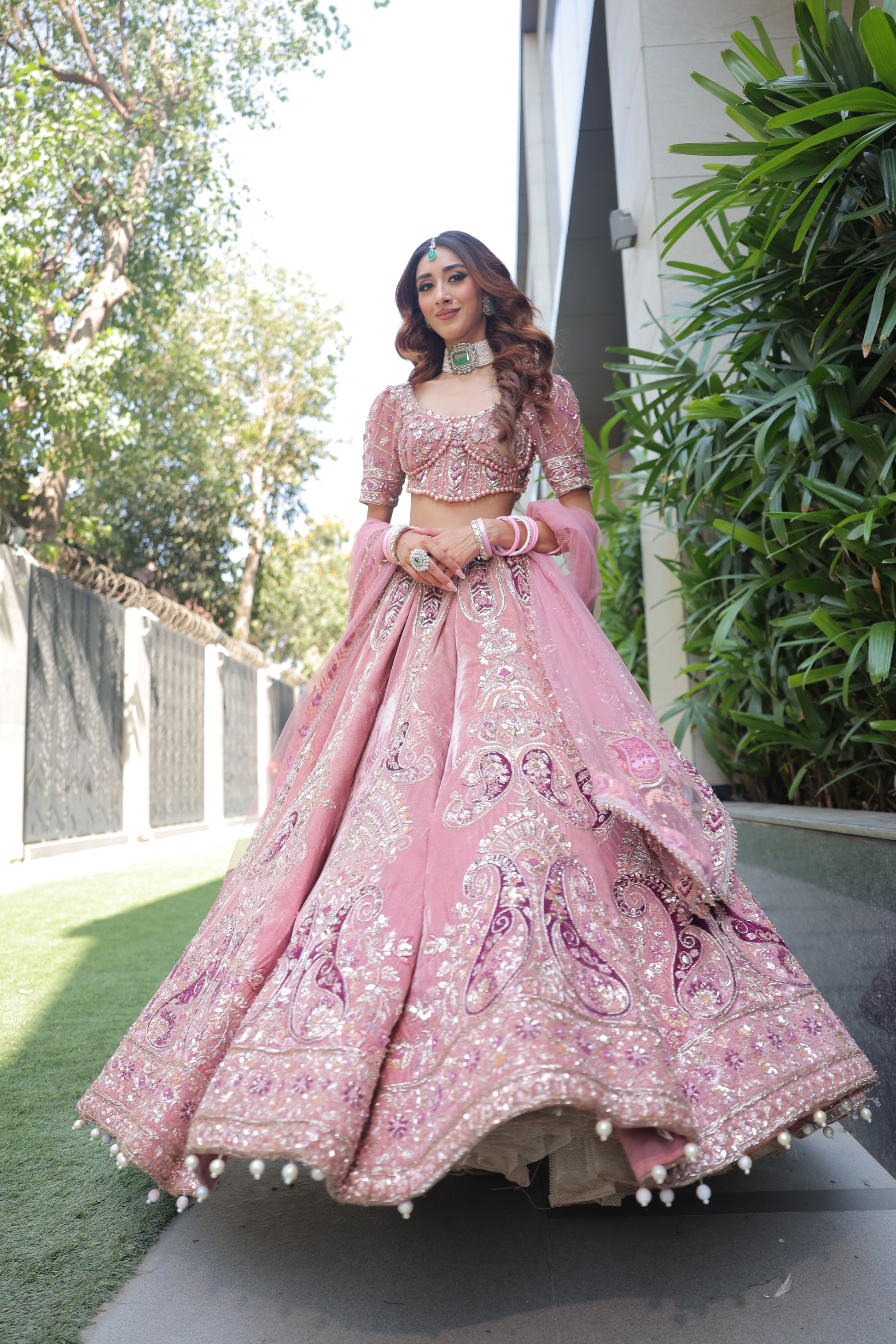 The Choli (Top): The top is a cropped blouse with a rounded neckline and short, slightly puffed sleeves. It is heavily adorned with detailed embroidery and embellishments, possibly including sequins, beads, and threadwork in shades of pink, gold, and silver. The intricate patterns cover the entire blouse, creating a rich and textured look.