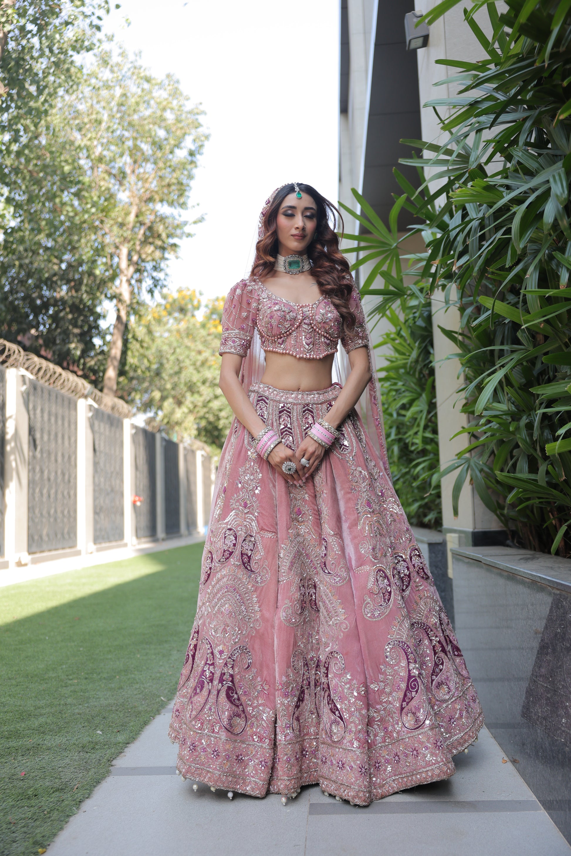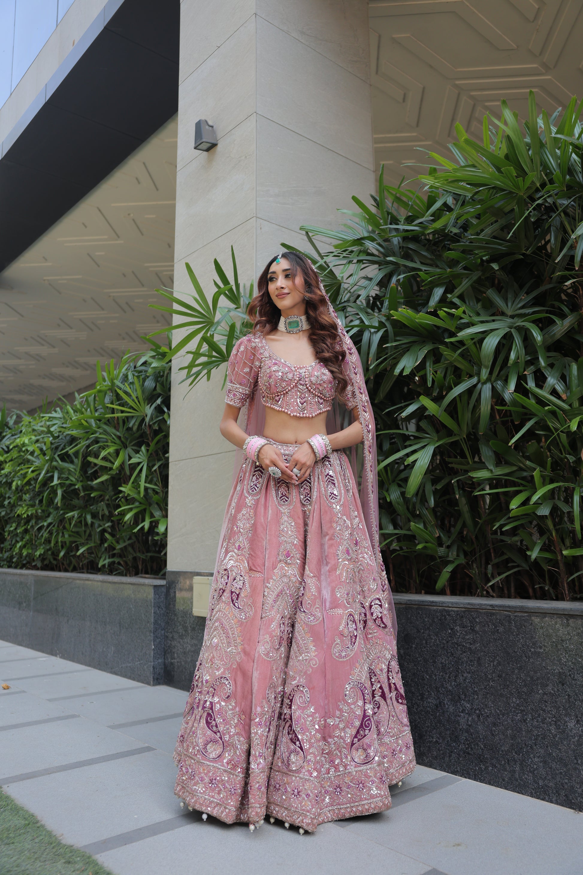 The Dupatta (Veil/Scarf): A lightweight dupatta in a matching dusty rose or mauve color completes the ensemble. It has a delicate embroidered or embellished border that ties it in with the lehenga and choli. The dupatta is sheer and adds an element of grace.