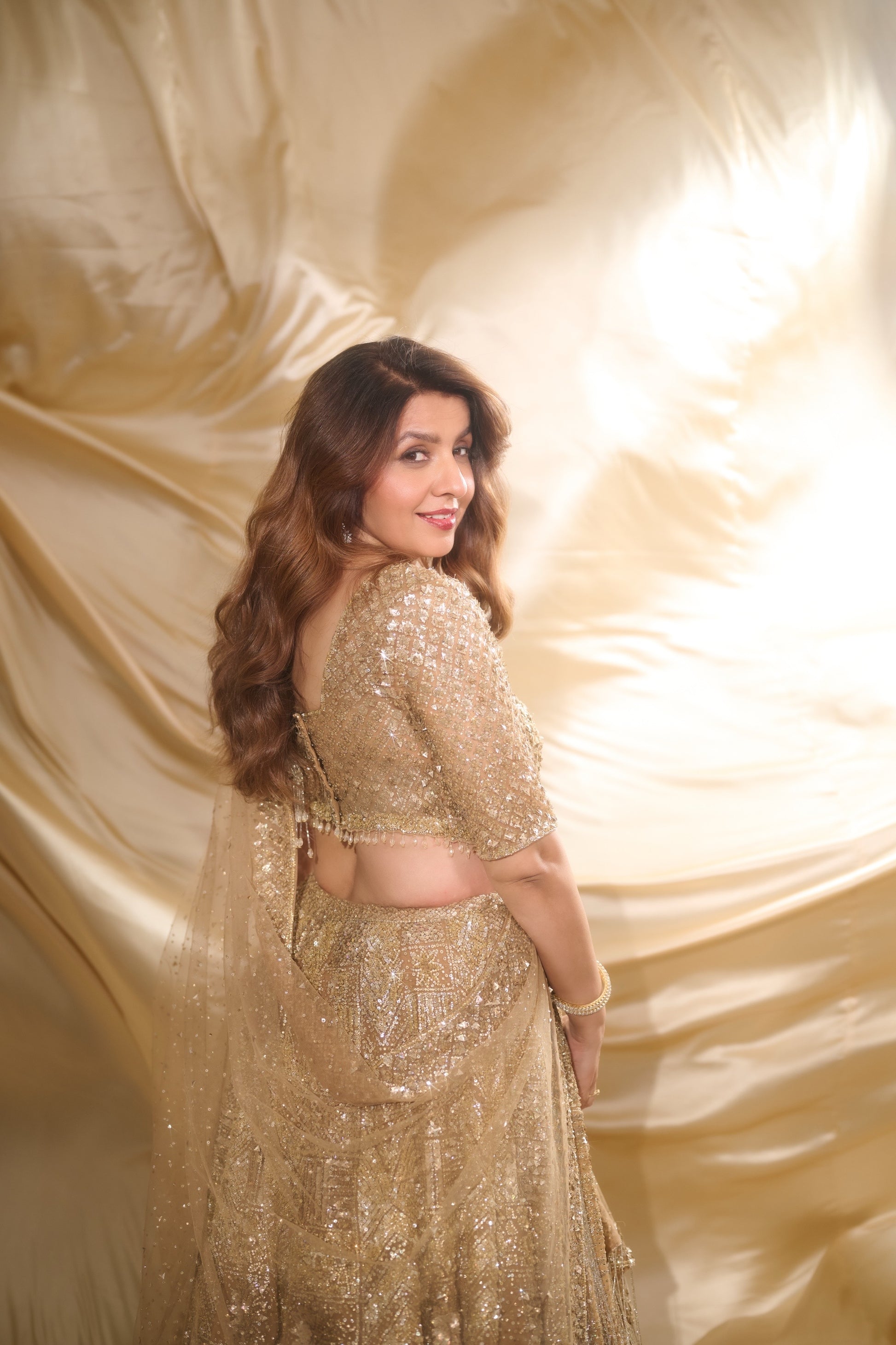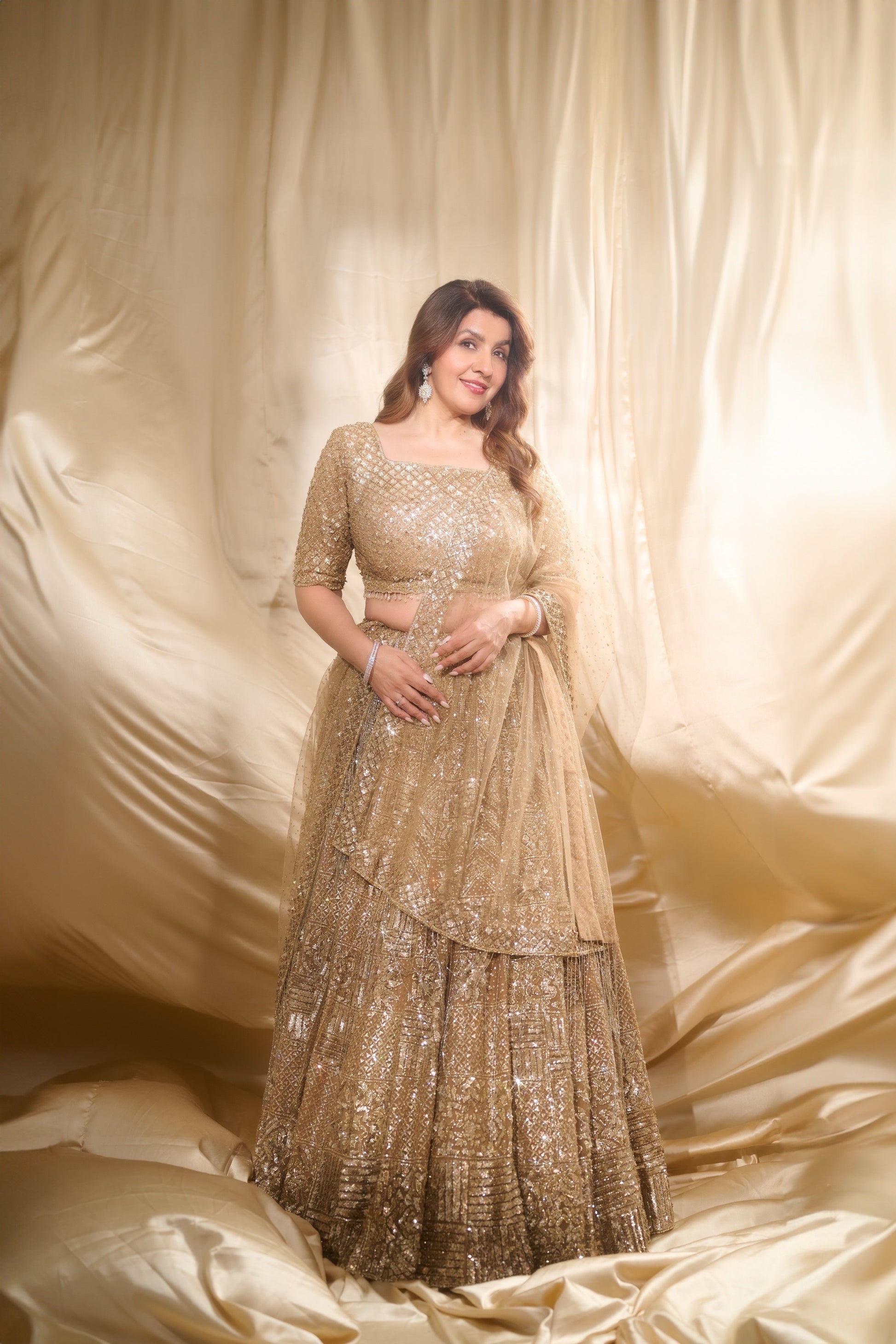 The Lehenga (Skirt): The skirt is a high-waisted, voluminous A-line maxi skirt made from a fabric that is also completely covered in the same gold or champagne-colored sequins as the choli. The consistent embellishment throughout both pieces creates a cohesive and radiant ensemble. The skirt has a wide flare, suggesting a significant amount of fabric and movement.
