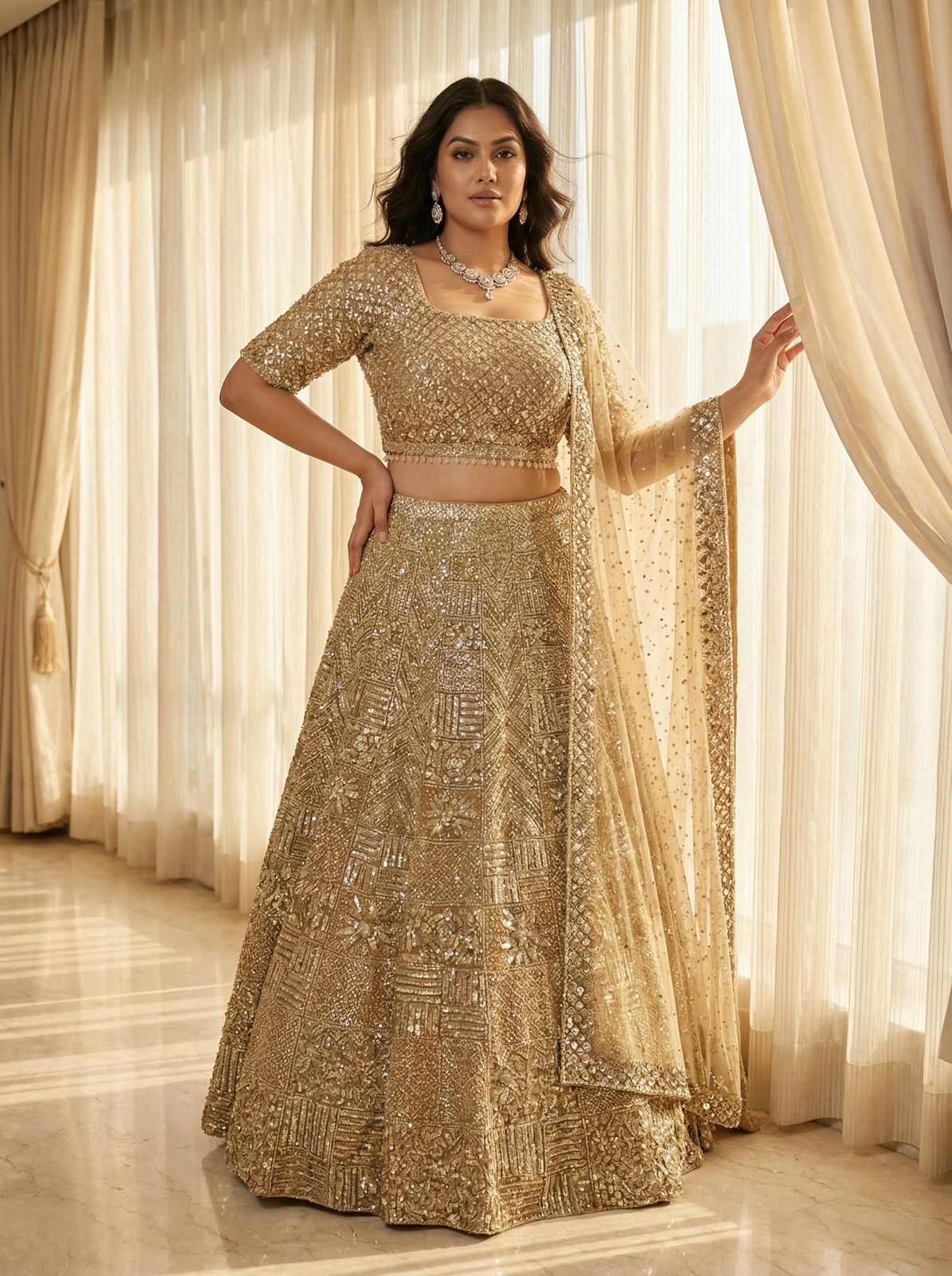 The Dupatta (Veil/Scarf): A sheer dupatta in a matching gold or champagne color completes the outfit. It also features sequin embellishments, possibly a border and scattered sequins throughout, tying it in with the lehenga and choli.