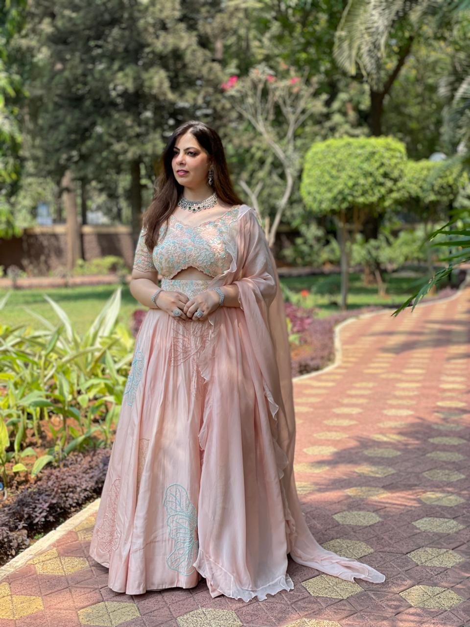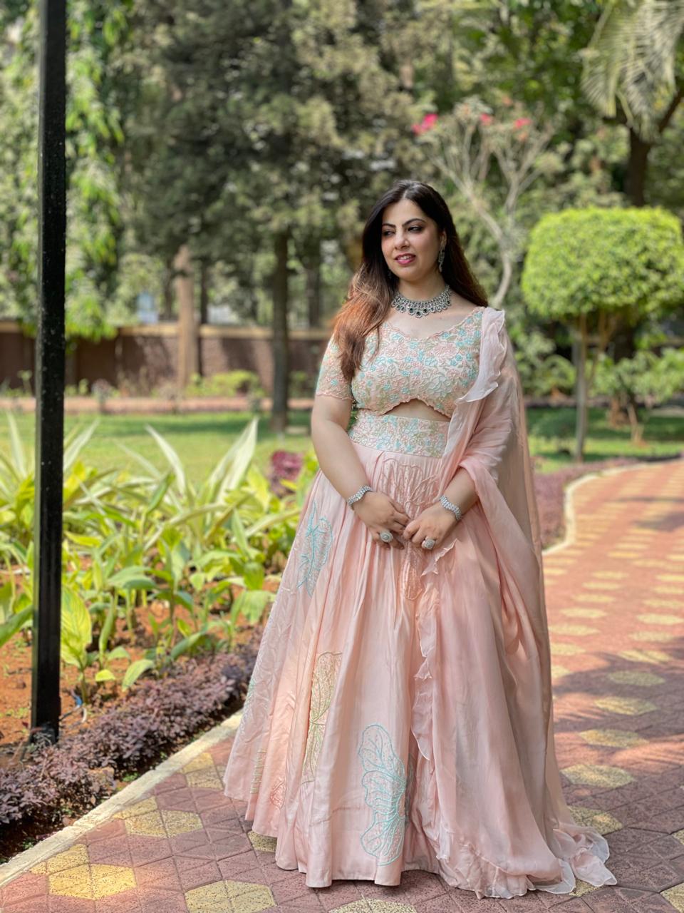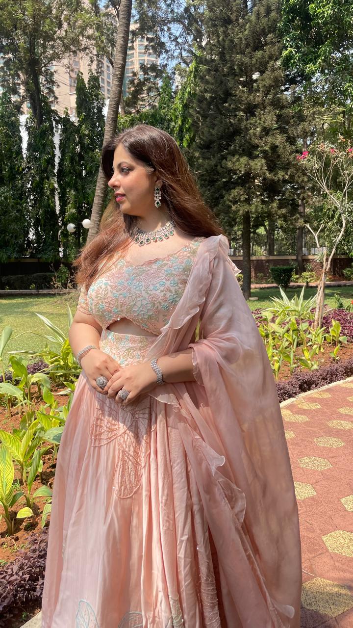The Lehenga (Skirt): The skirt is a high-waisted, flowing A-line maxi skirt in a soft, pale pink or peach fabric. It has a subtle sheen and features vertical ruffles or gathered detailing that add movement and texture. There might be faint, complementary embellishments scattered throughout the skirt.