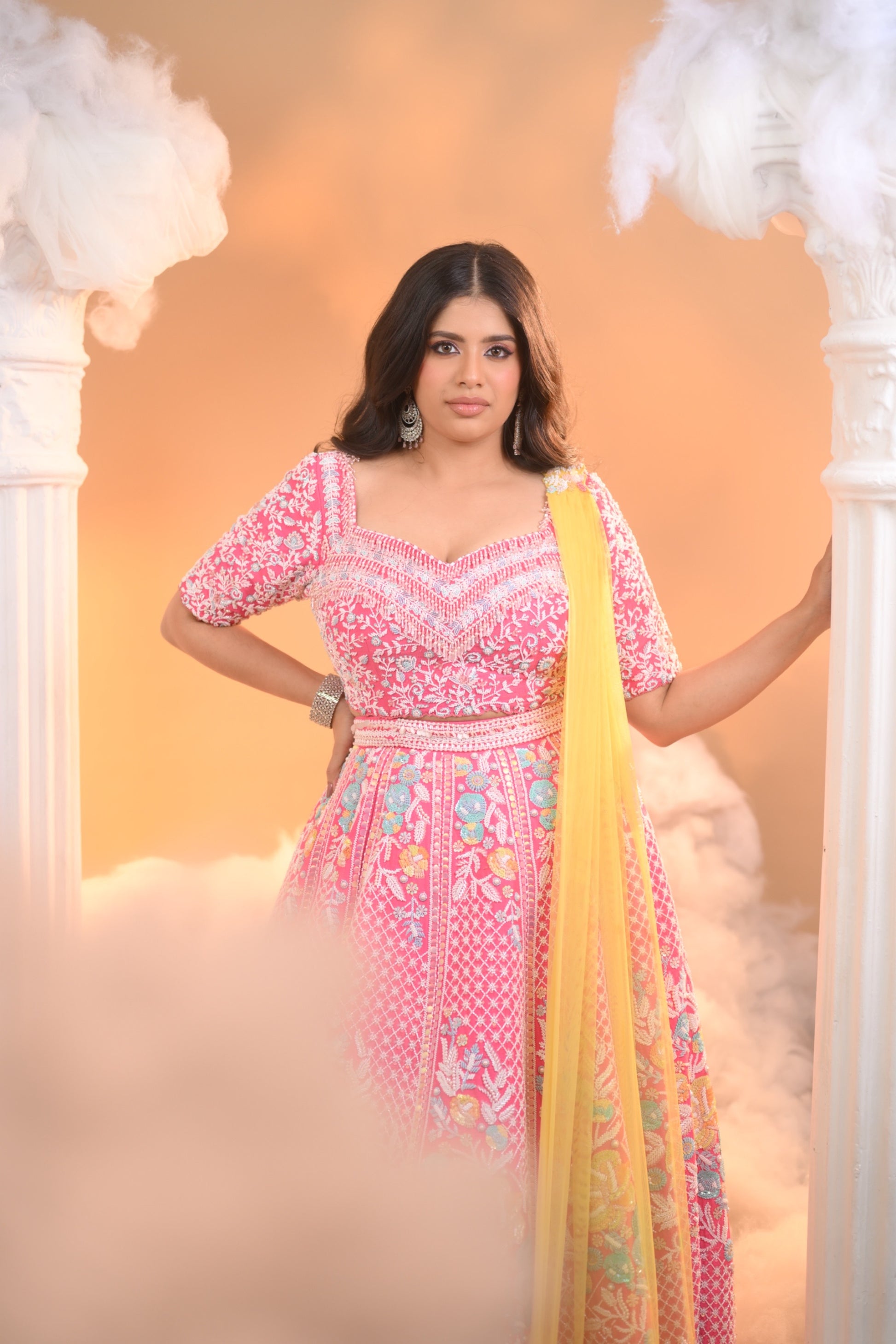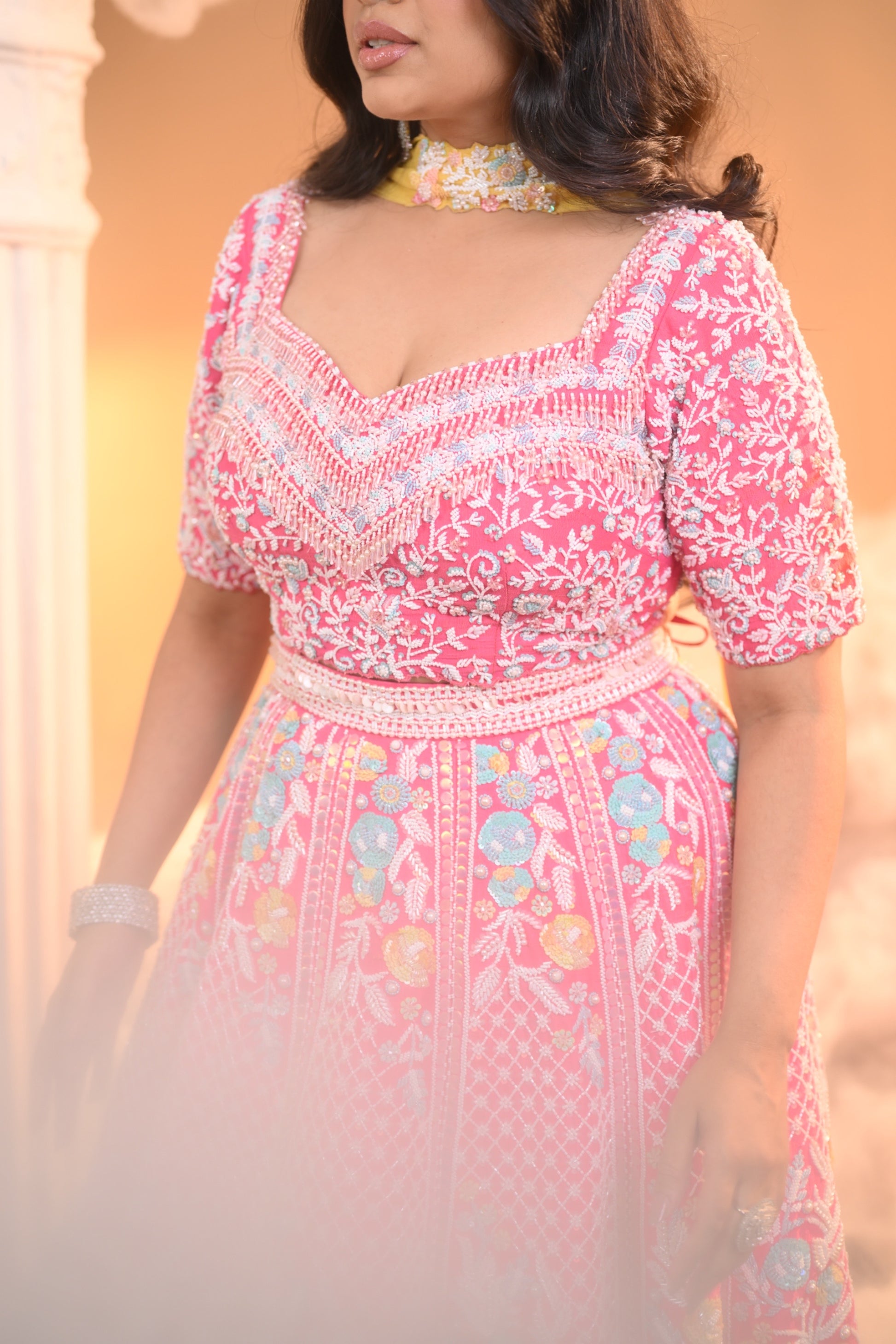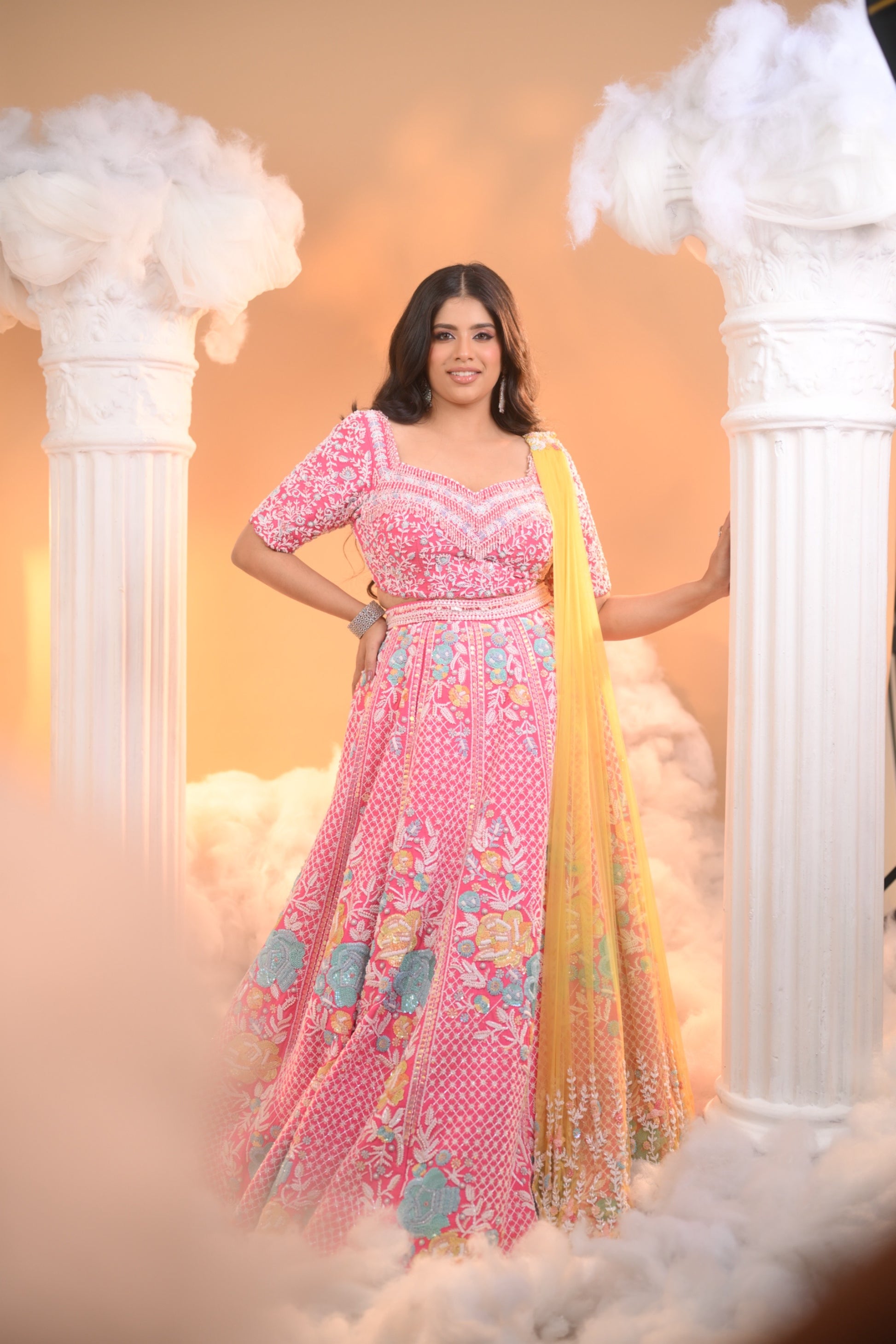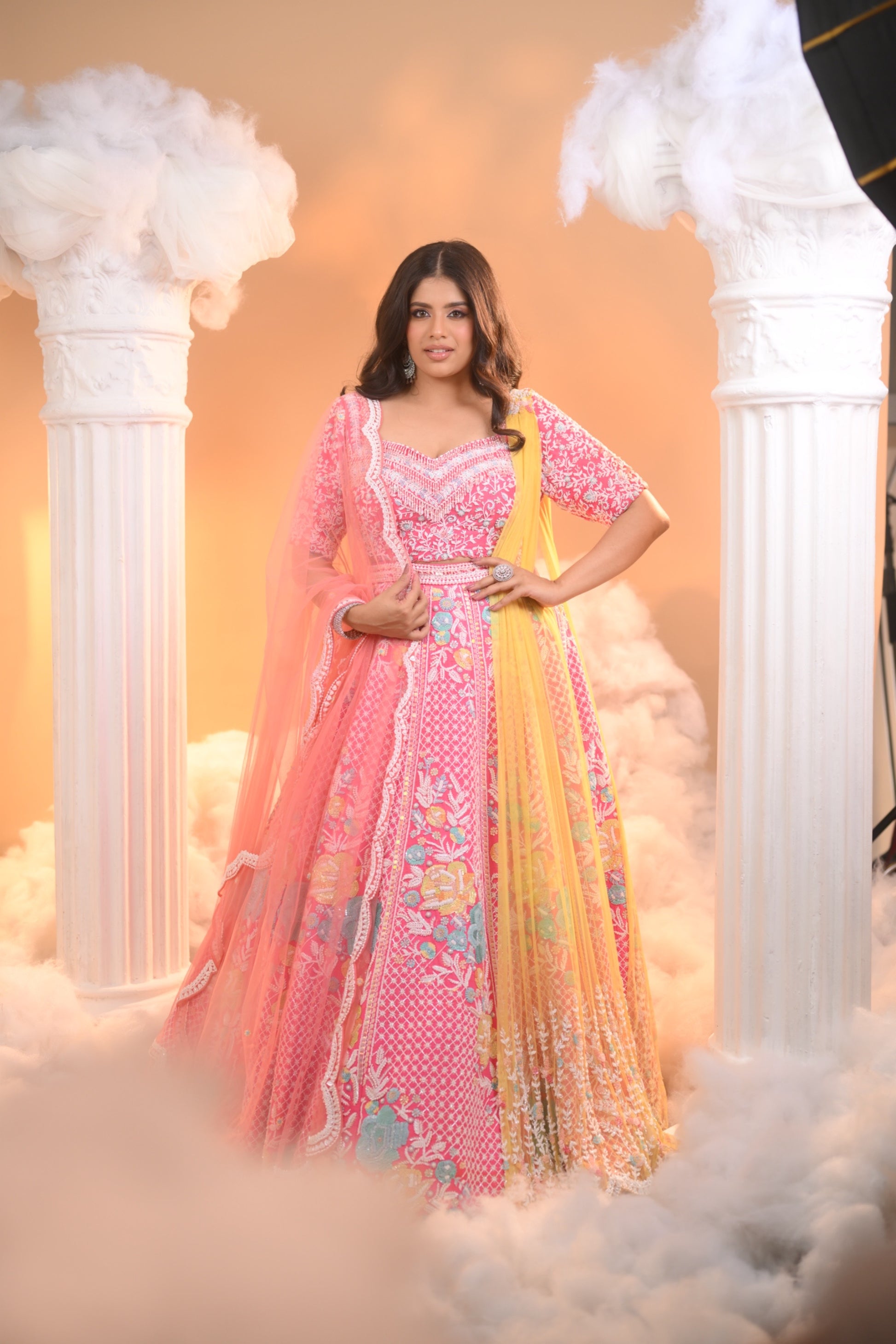 This vibrant coral pink floral lehenga is a breathtaking fusion of traditional and contemporary aesthetics, perfect for festive celebrations and wedding functions.