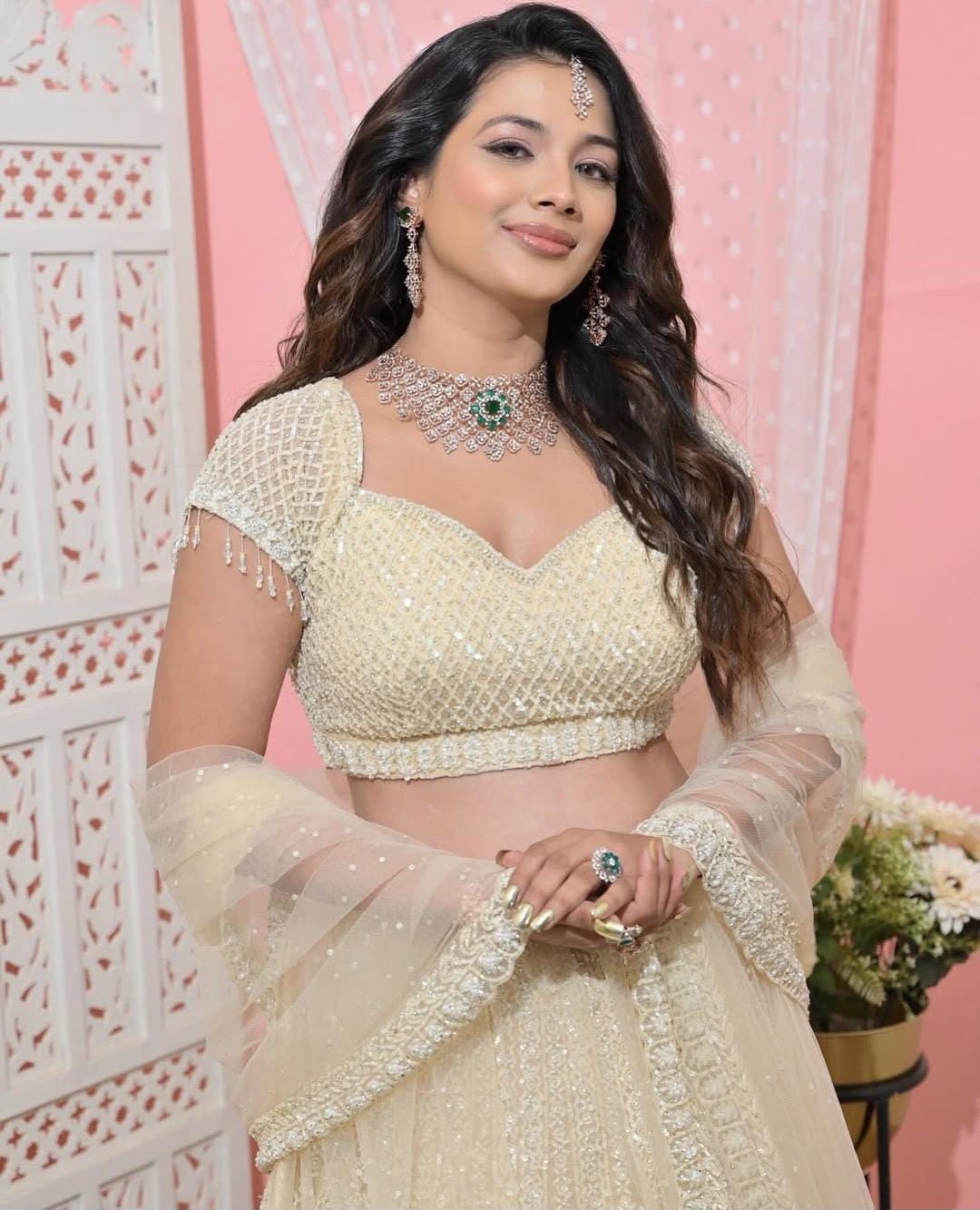Soft ivory shade enhances the regal feel, making it a perfect choice for brides and wedding attendees looking for an understated yet luxurious statement outfit.