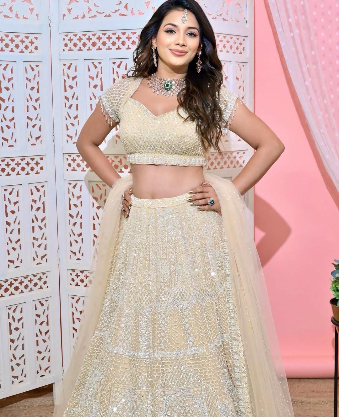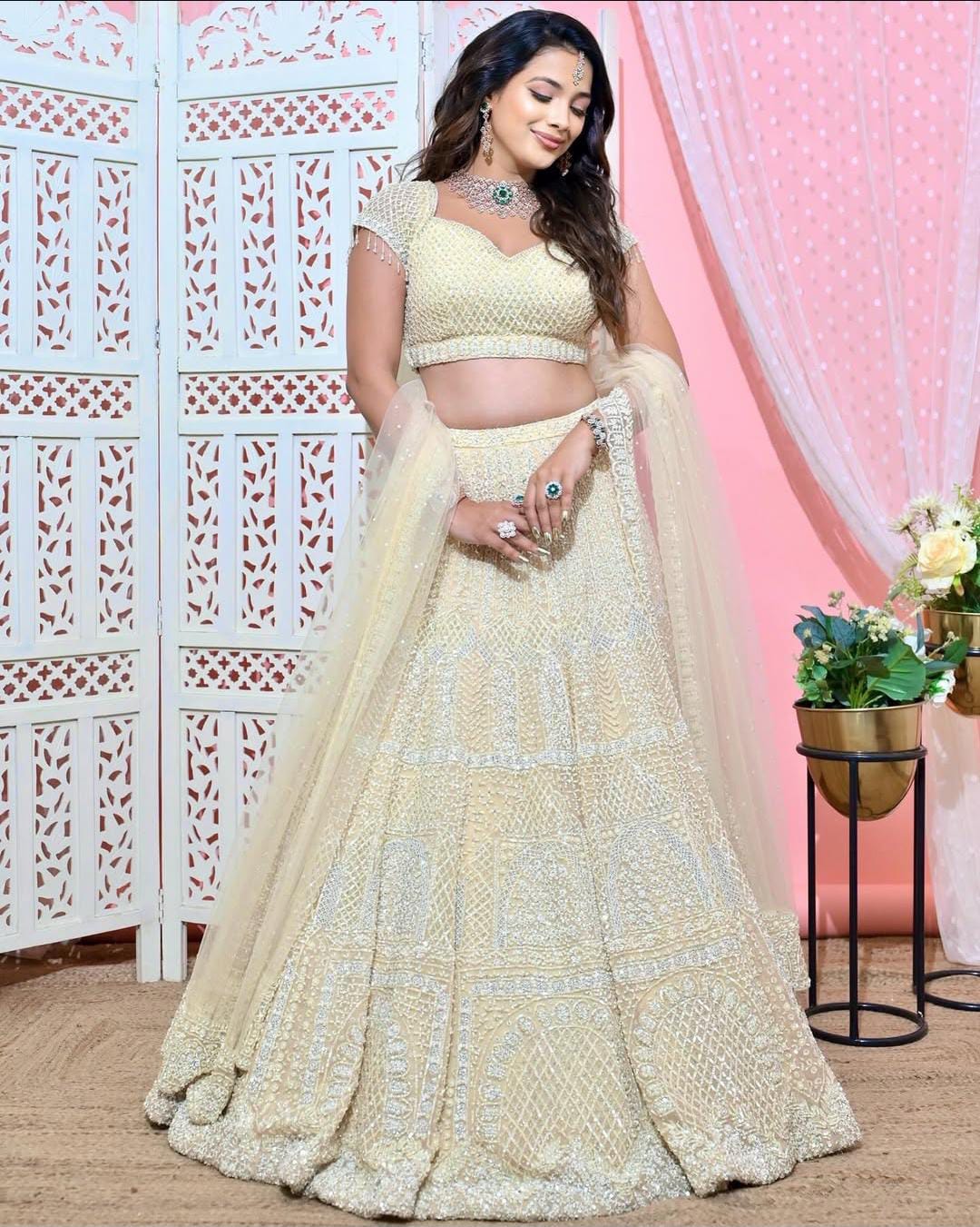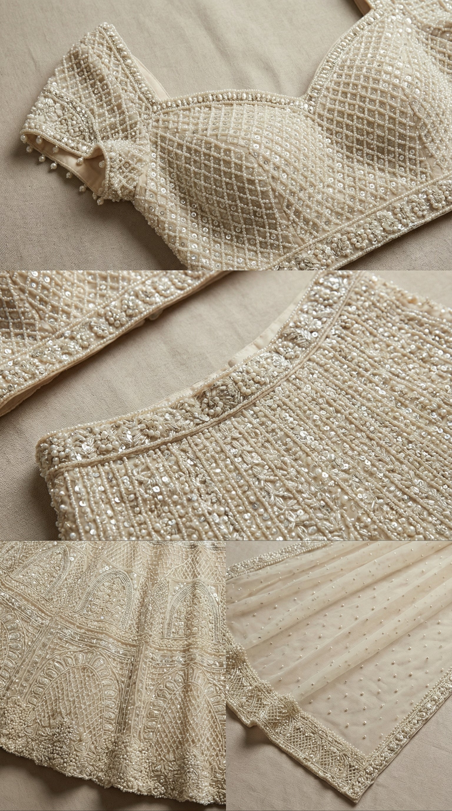 This ethereal ivory lehenga is a timeless masterpiece that exudes elegance and sophistication, perfect for bridal wear, receptions, and grand festivities.