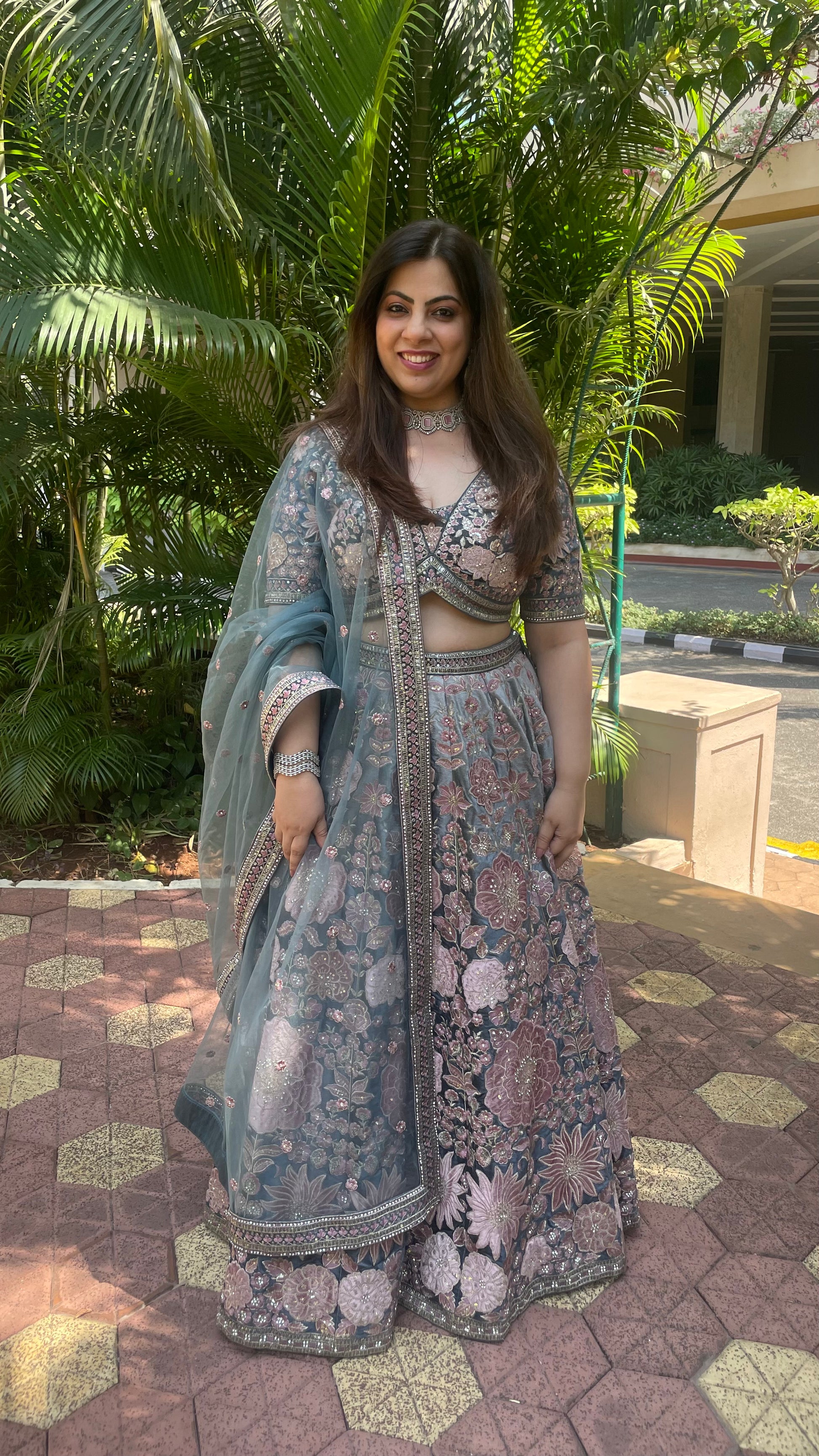 A flowing lehenga skirt, richly adorned with floral embroidery and shimmering embellishments, creating a balanced blend of tradition and contemporary elegance.