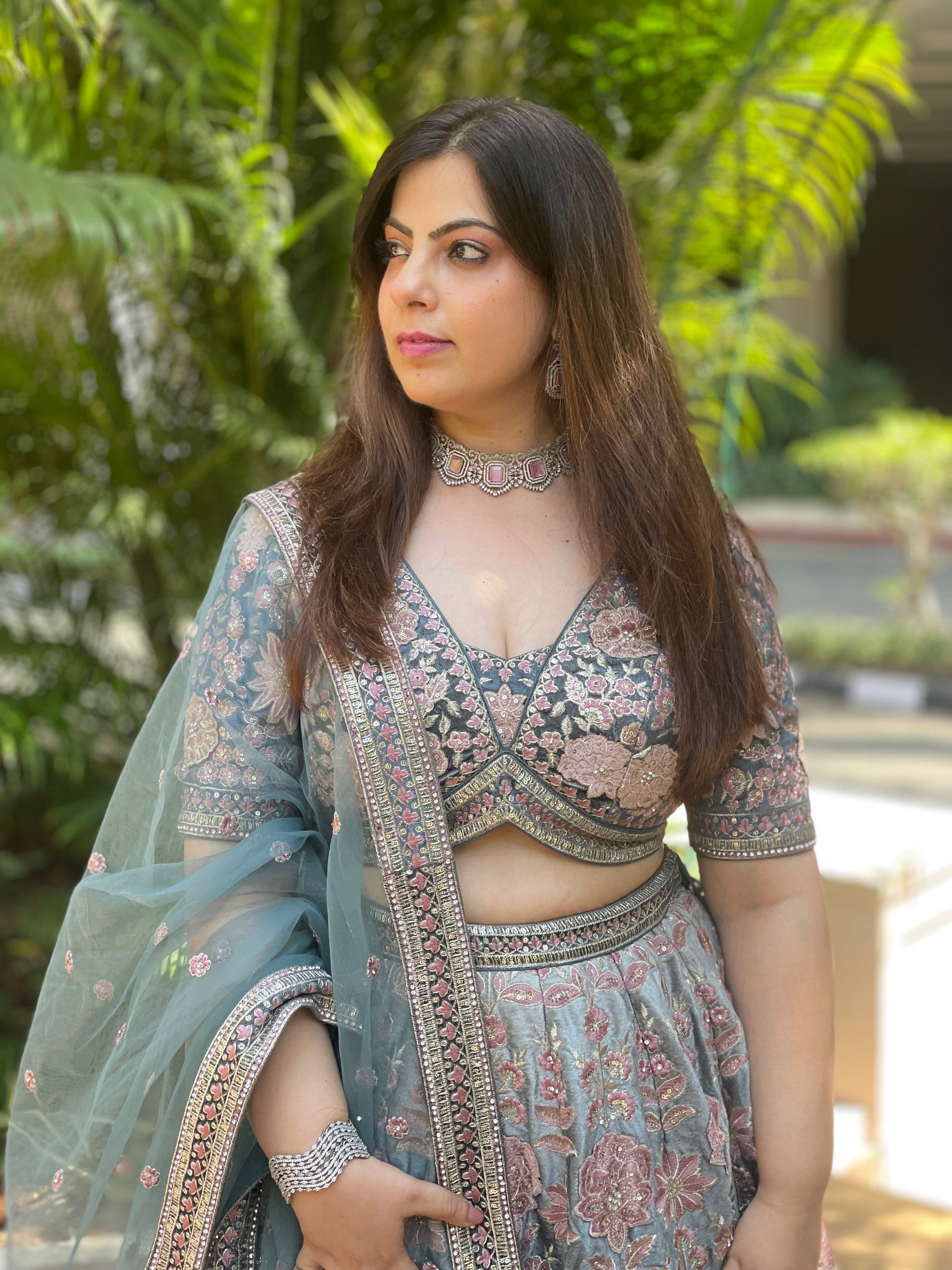 Exude grace and sophistication in this dusty teal embellished lehenga set, a perfect pick for daytime weddings, festive functions, or elegant soirées. This beautifully crafted ensemble features: