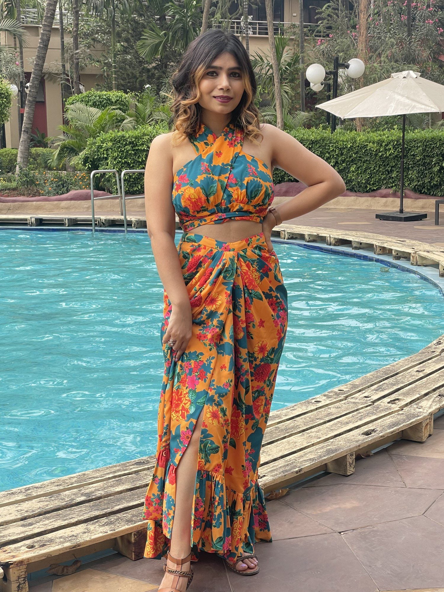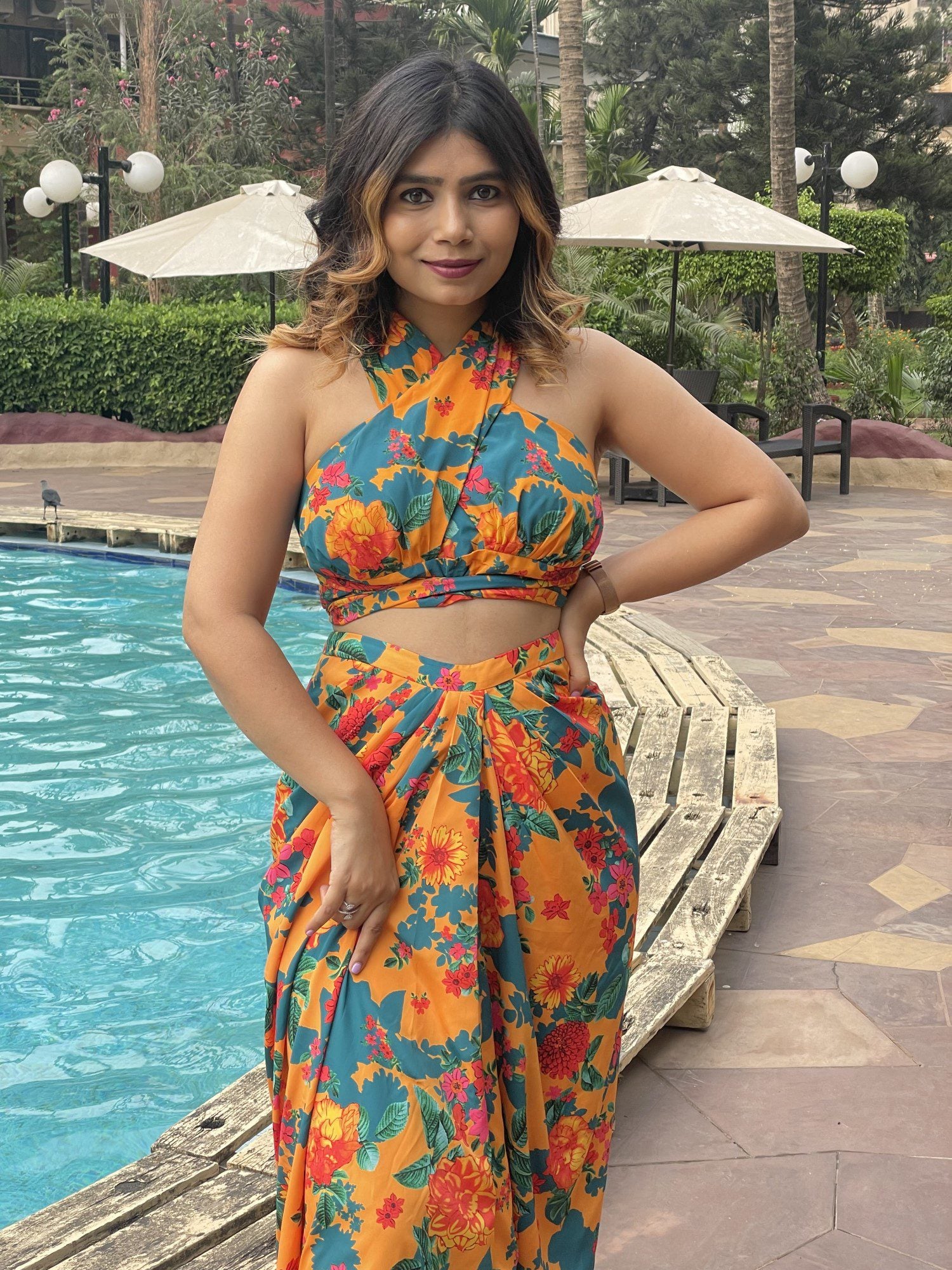 This Floral Dhoti Set is inspired by traditional Indian garments. The lightweight fabric is perfect for warmer weather, while the vibrant floral pattern adds a touch of color and elegance. The dhoti style allows for comfortable movement and can be dressed up or down for any occasion. Perfect for those looking to incorporate culture and style into their wardrobe.