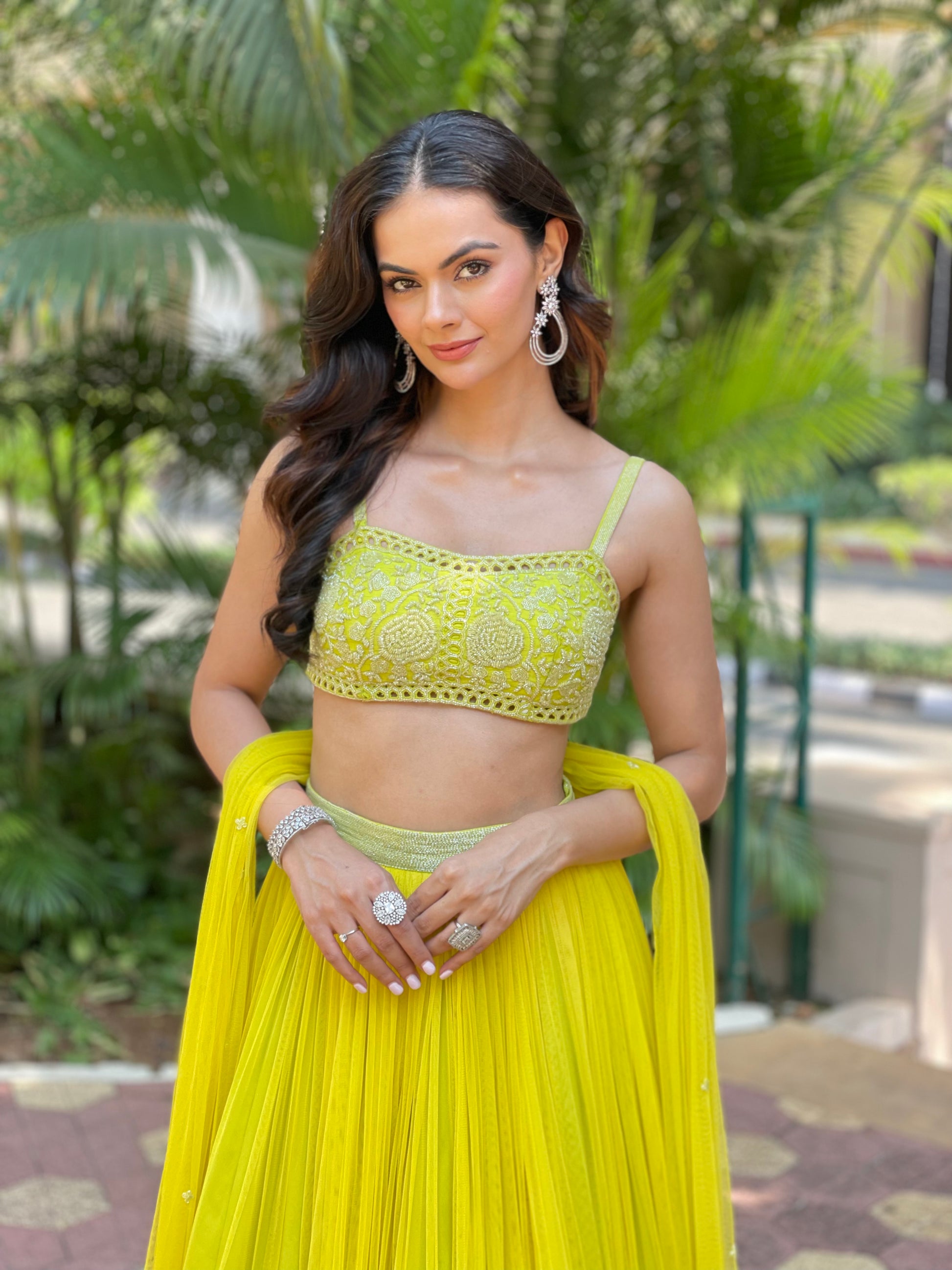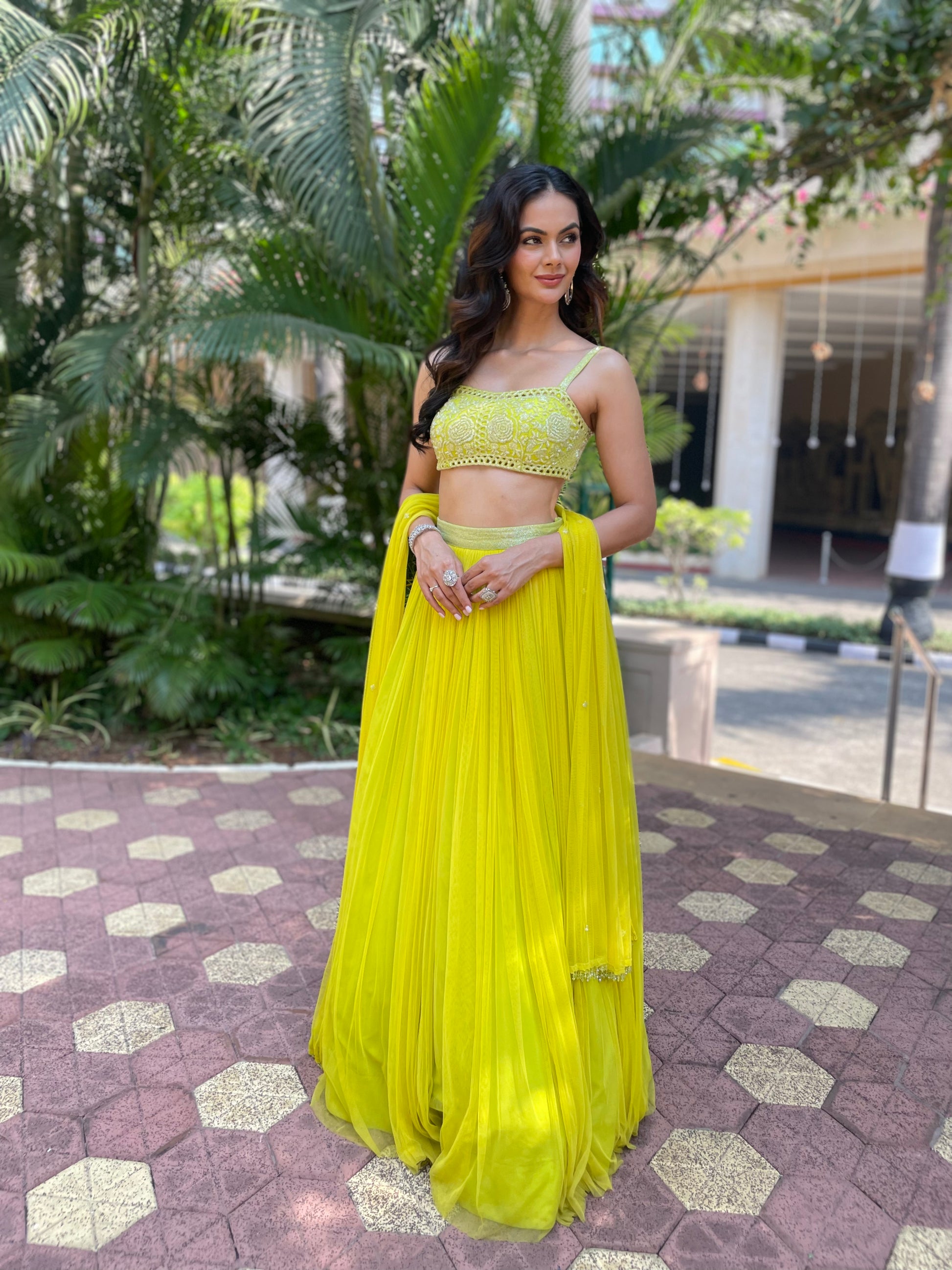 The skirt is a high-waisted, A-line maxi skirt in a matching bright yellow. It seems to be made of a lightweight and airy fabric, possibly tulle or a similar material, giving it a soft and flowing look. The waistband is defined and may also feature some subtle embellishments, creating a cohesive transition between the top and the skirt.