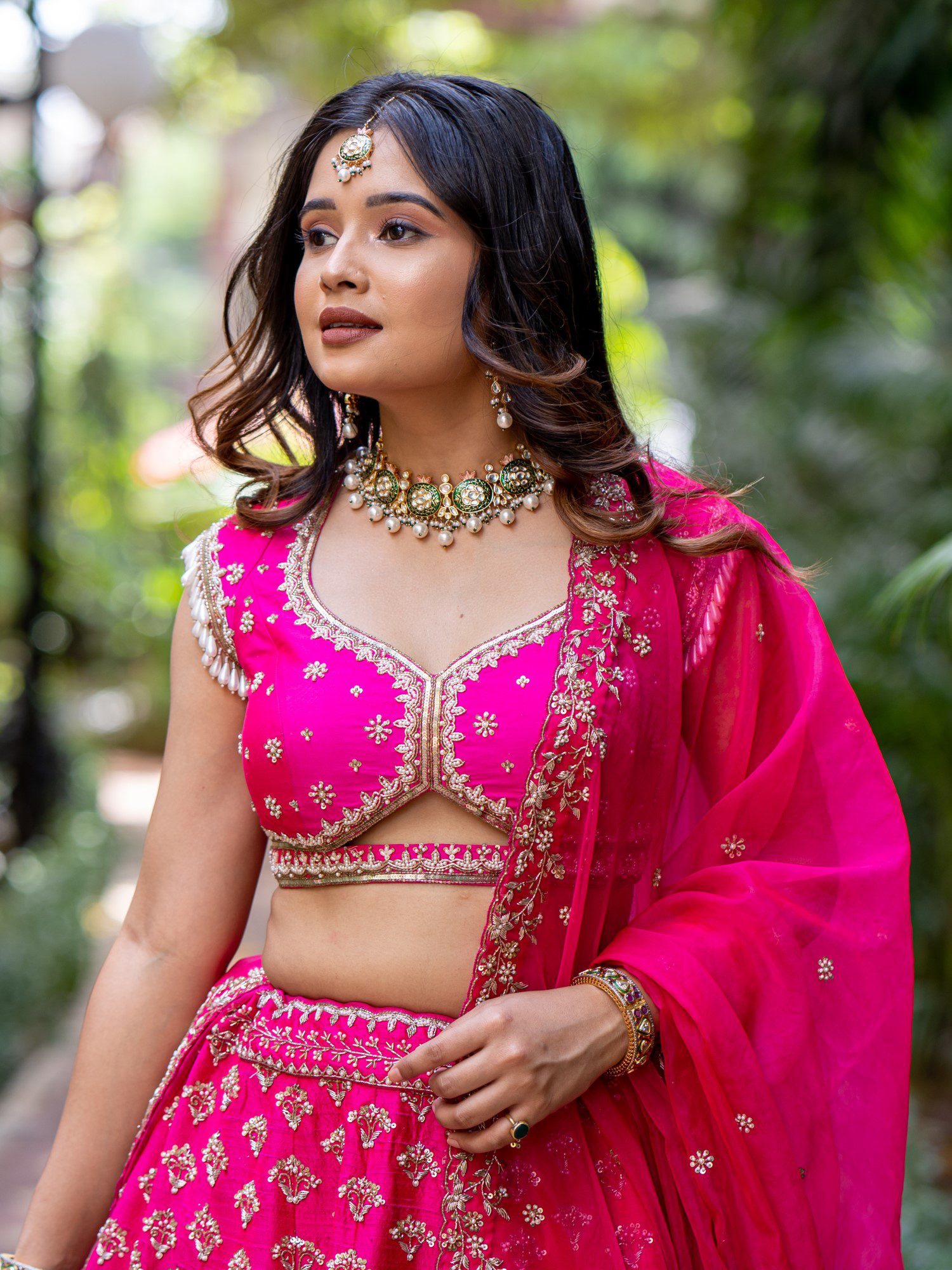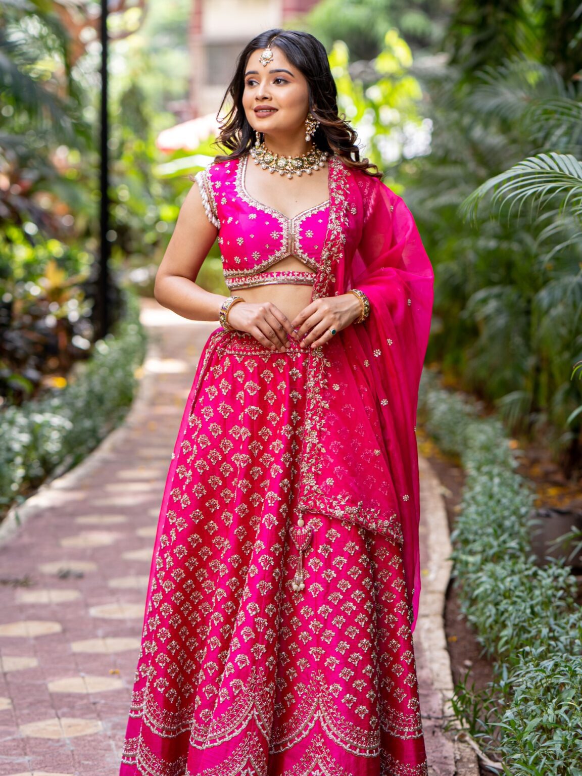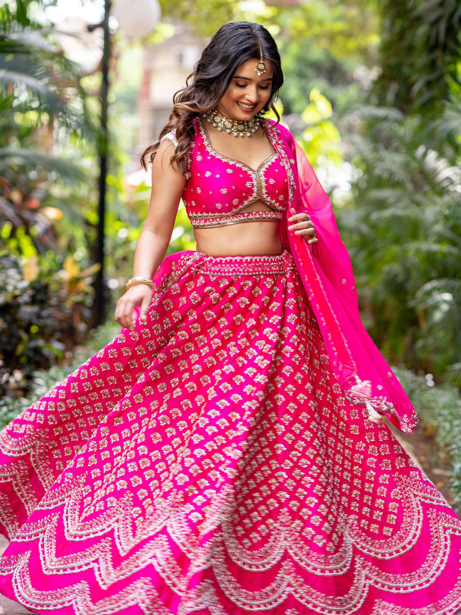 Dazzle in festive charm with this vibrant fuchsia pink lehenga set, designed to make you shine at every celebration. This striking ensemble features detailed mirror and thread work, capturing traditional craftsmanship with a modern twist.