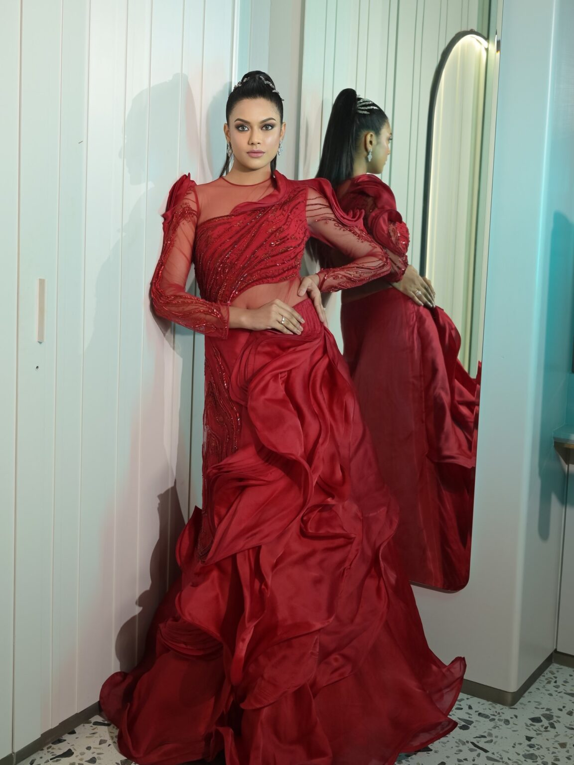 The skirt is a high-low style with cascading ruffles and folds, adding volume and movement. The rich red color makes a bold and glamorous statement.