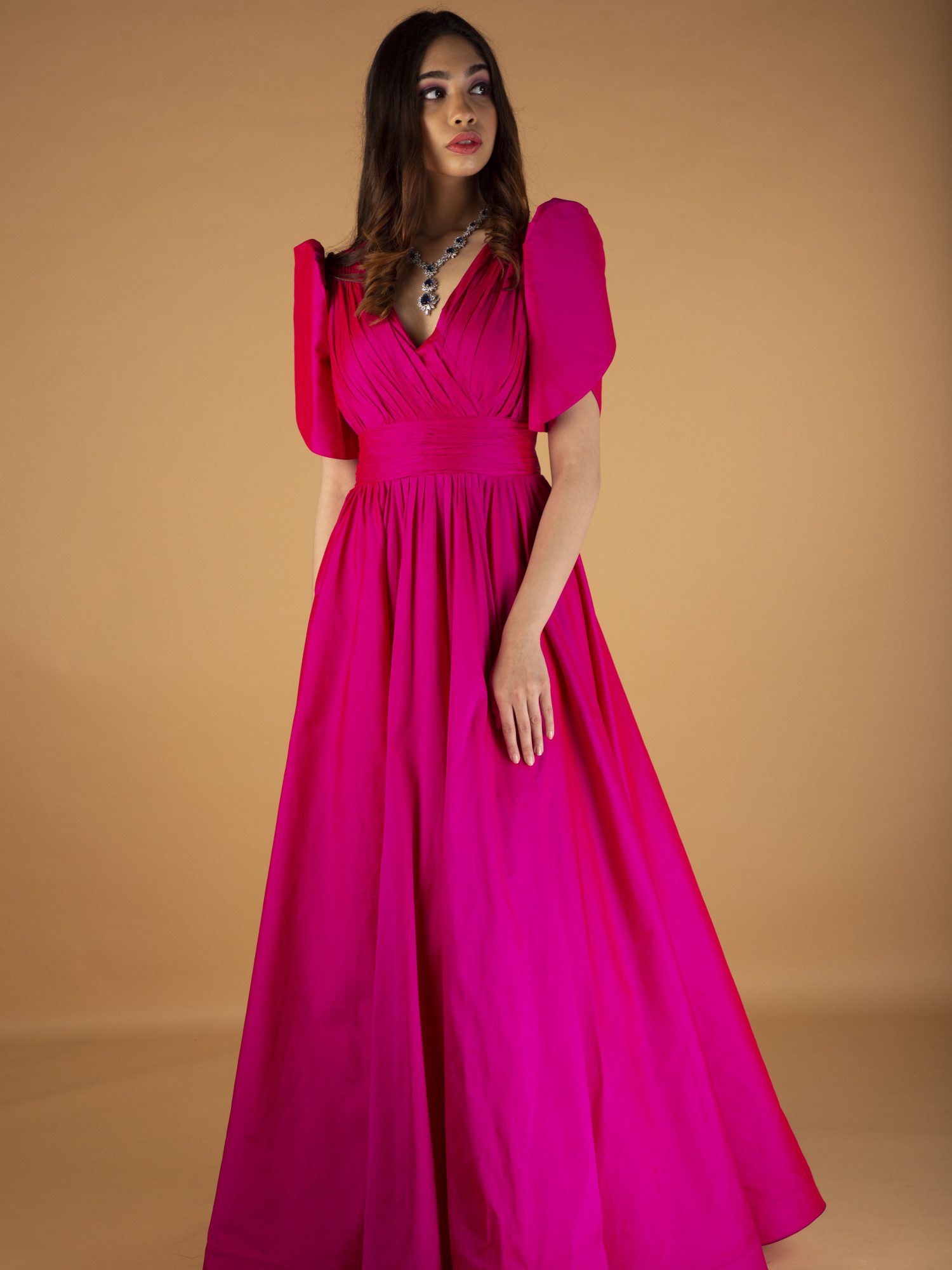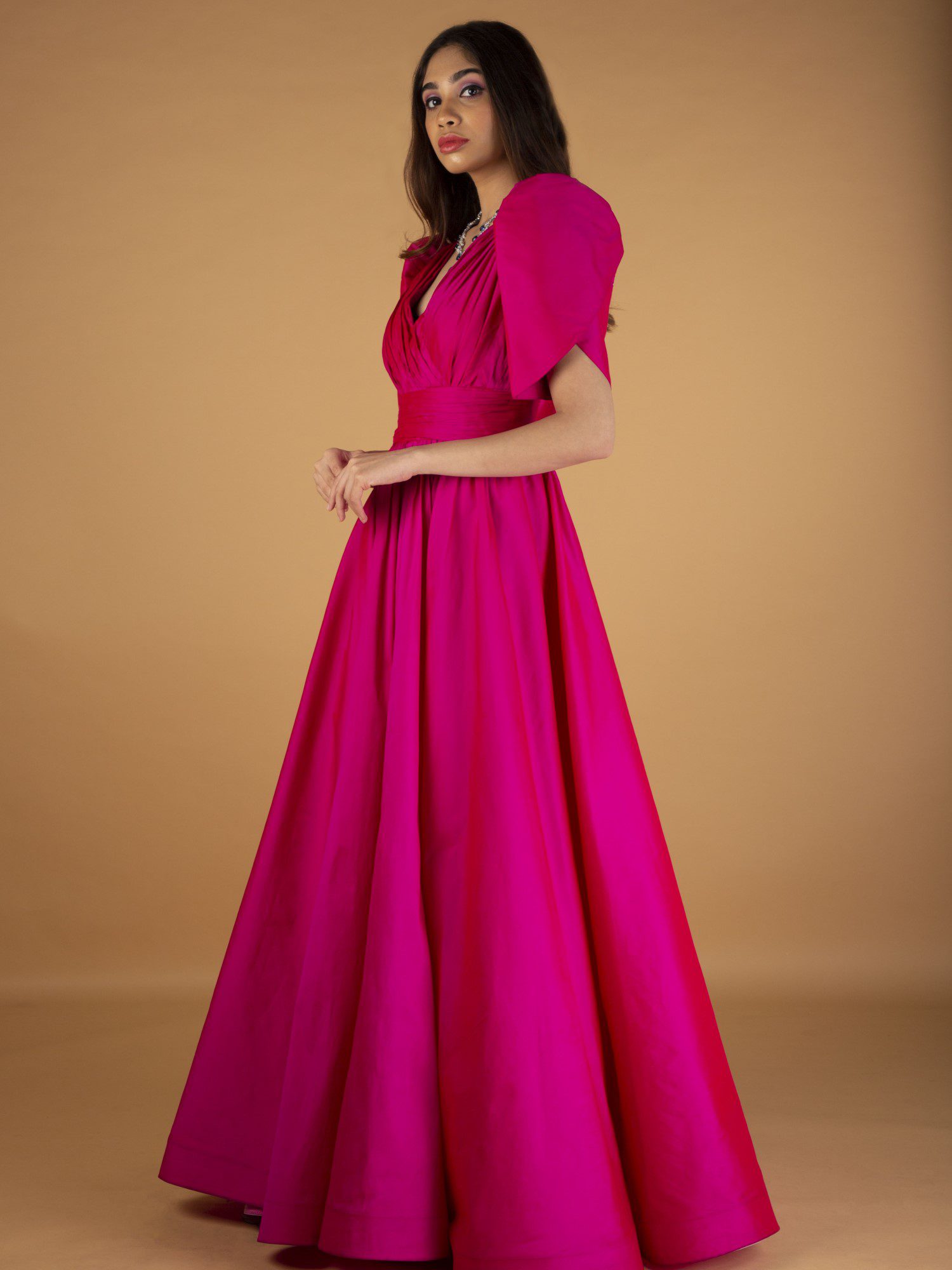 The skirt flows into a voluminous, floor-length A-line, offering both comfort and a regal presence. The vibrant magenta hue ensures the wearer will make a memorable statement. This gown is ideal for formal events, galas, or any occasion where a touch of glamour is desired.