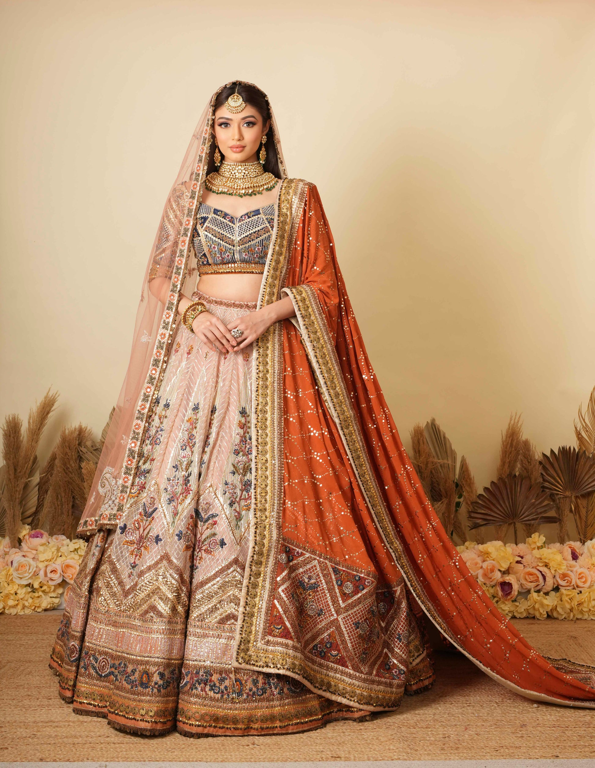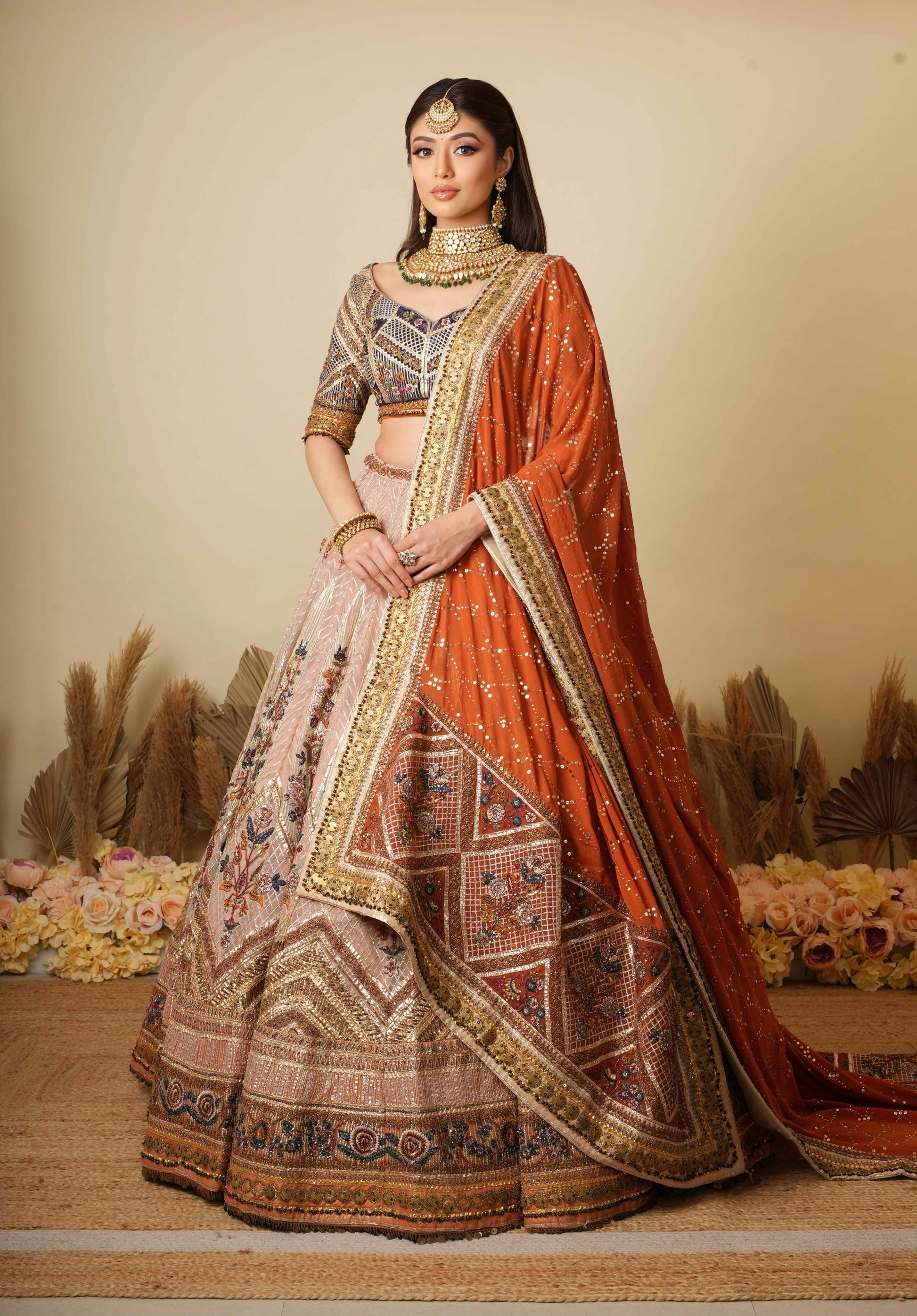 A regal celebration of Rajasthani heritage, the Ghoomer Lehenga by Marwar Couture features intricate thread and mirror work, traditional motifs, and a vibrant color palette. The navy blue embroidered blouse pairs beautifully with a blush gold skirt, while the rust-orange dupatta with heavy zardozi border adds a majestic finishing touch. Perfect for brides or bridesmaids looking to embrace ethnic elegance with modern flair.