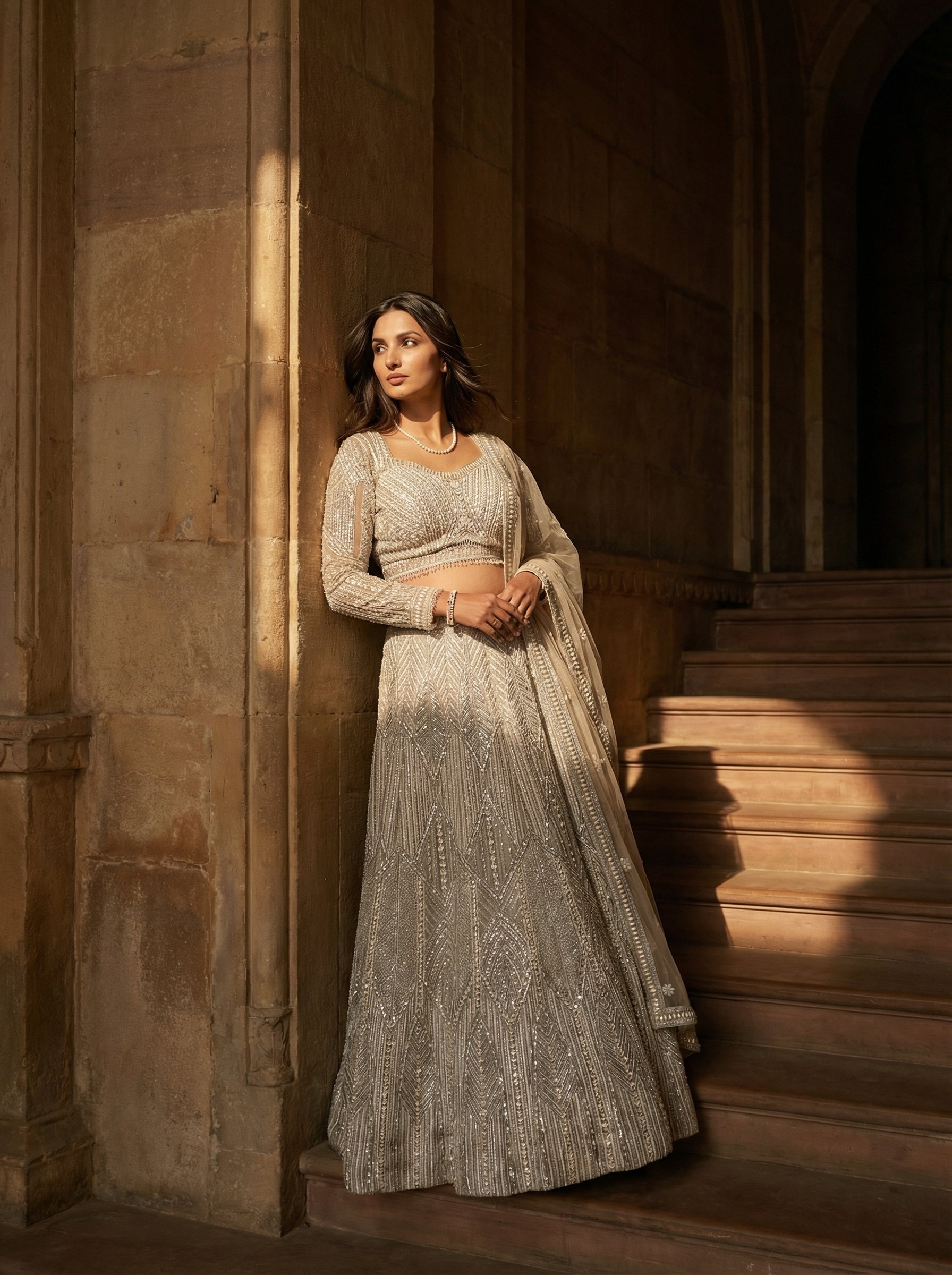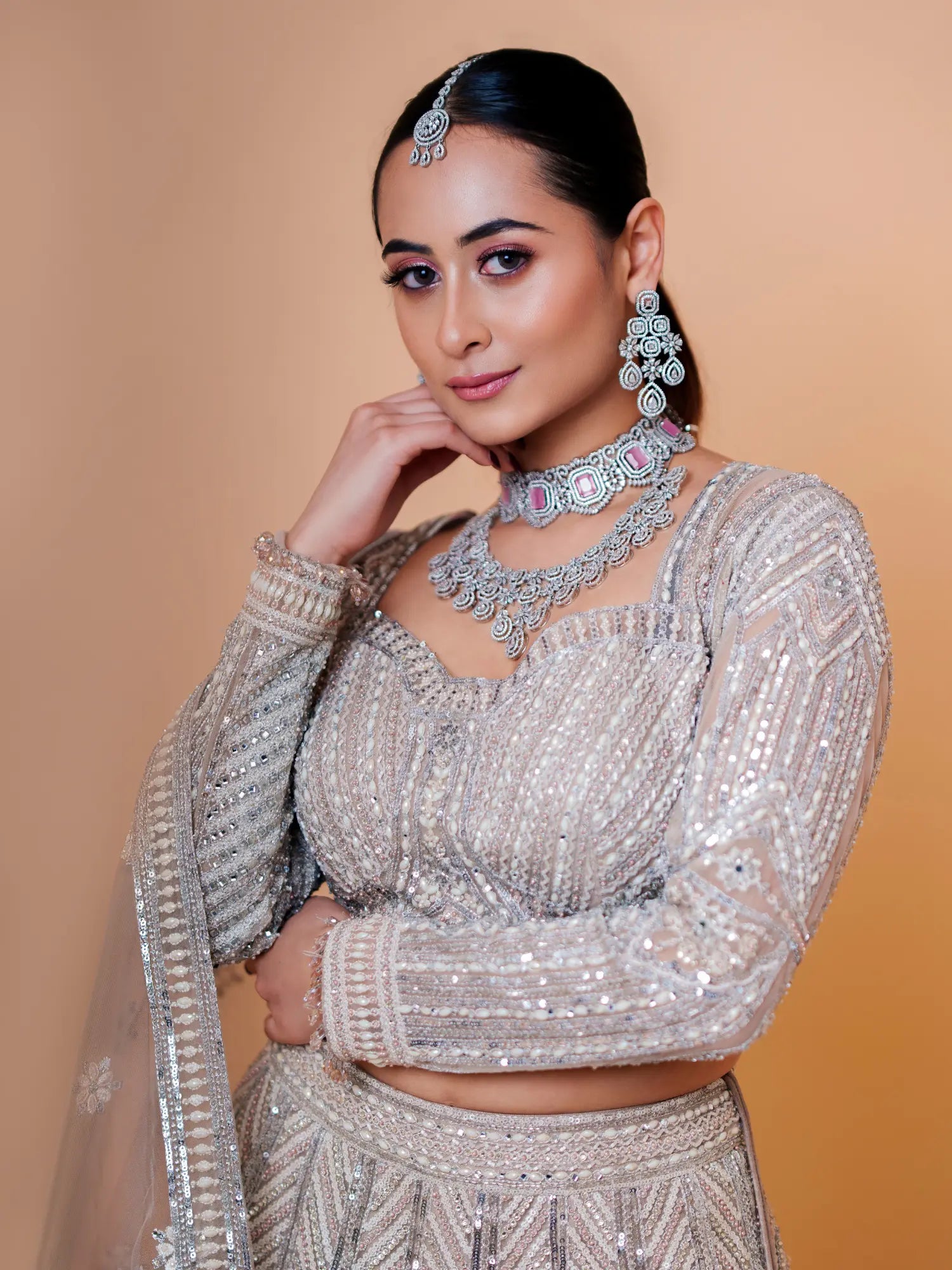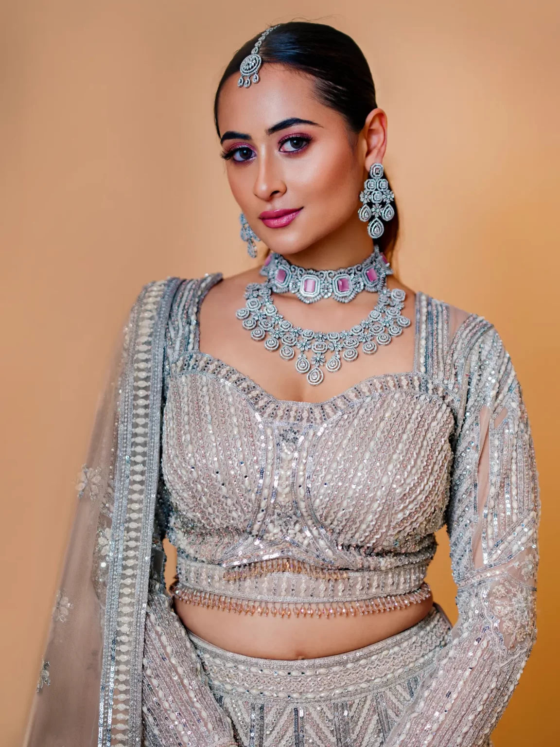 Lehenga: This voluminous lehenga is richly detailed with silver sequin, mirror, and zari work, creating a mesmerizing all-over shimmer effect. The structured silhouette adds a royal touch, making it ideal for grand occasions.
