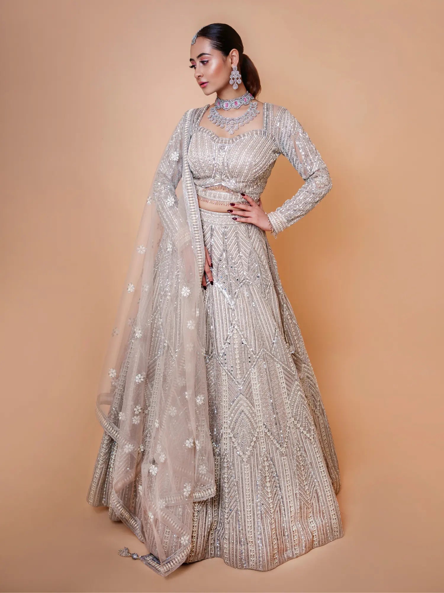 Channel pure opulence in this Luxe Silver Embellished Lehenga Set, a stunning ensemble that exudes grandeur and grace. Designed for the modern bride or wedding guest who wants to shine, this outfit is a celebration of intricate craftsmanship and contemporary elegance.