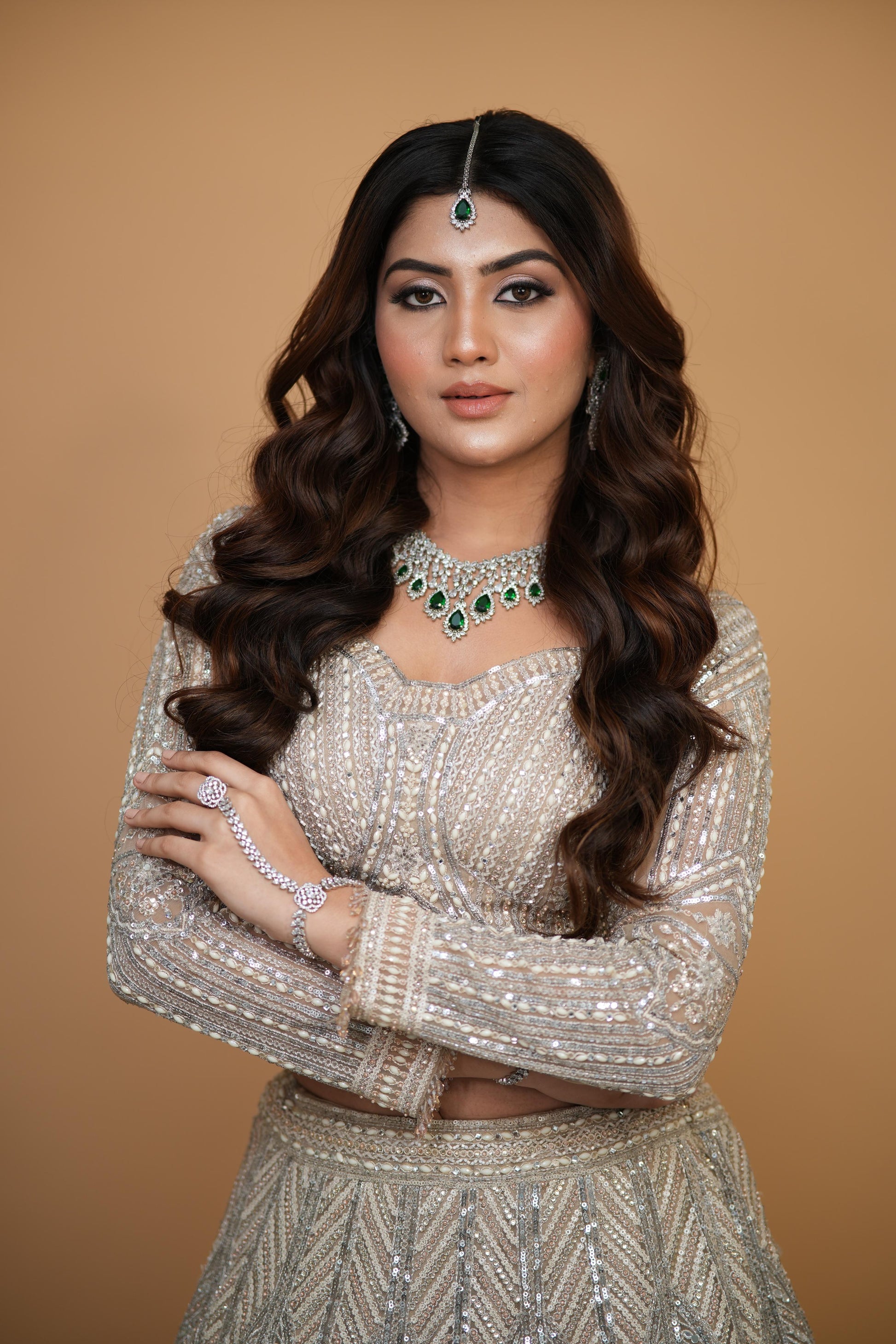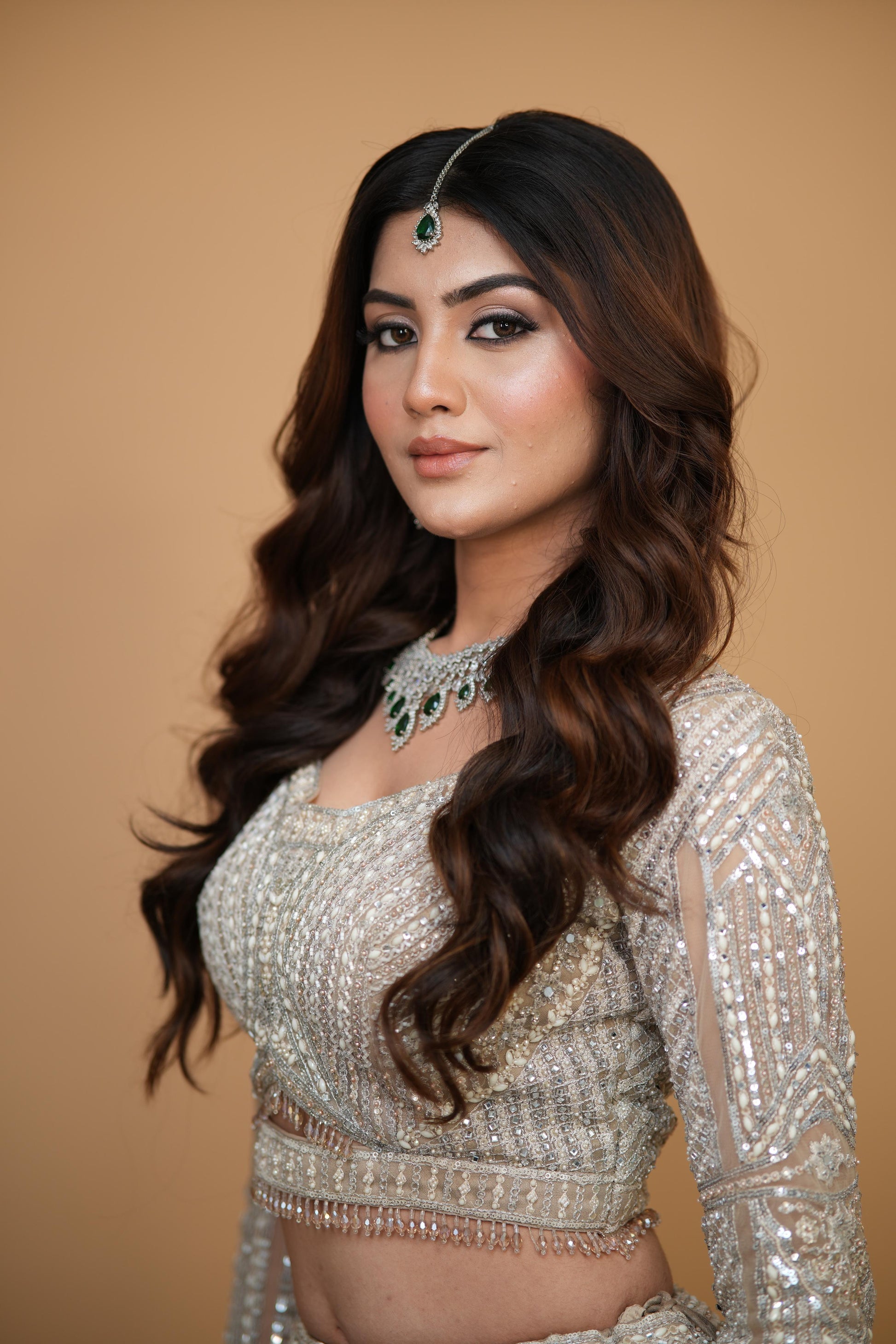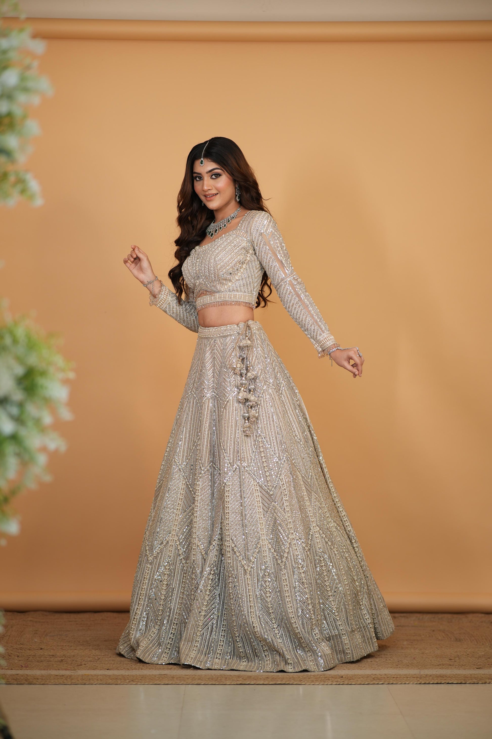 This elegant ensemble features a full-sleeved, heavily embellished blouse with sheer panel detailing on the arms, adding a modern twist to a traditional design. The lehenga skirt is voluminous and richly adorned with geometric and linear patterns in sequins, giving it a regal sparkle and texture. A statement tassel hangs at the waist for added charm.