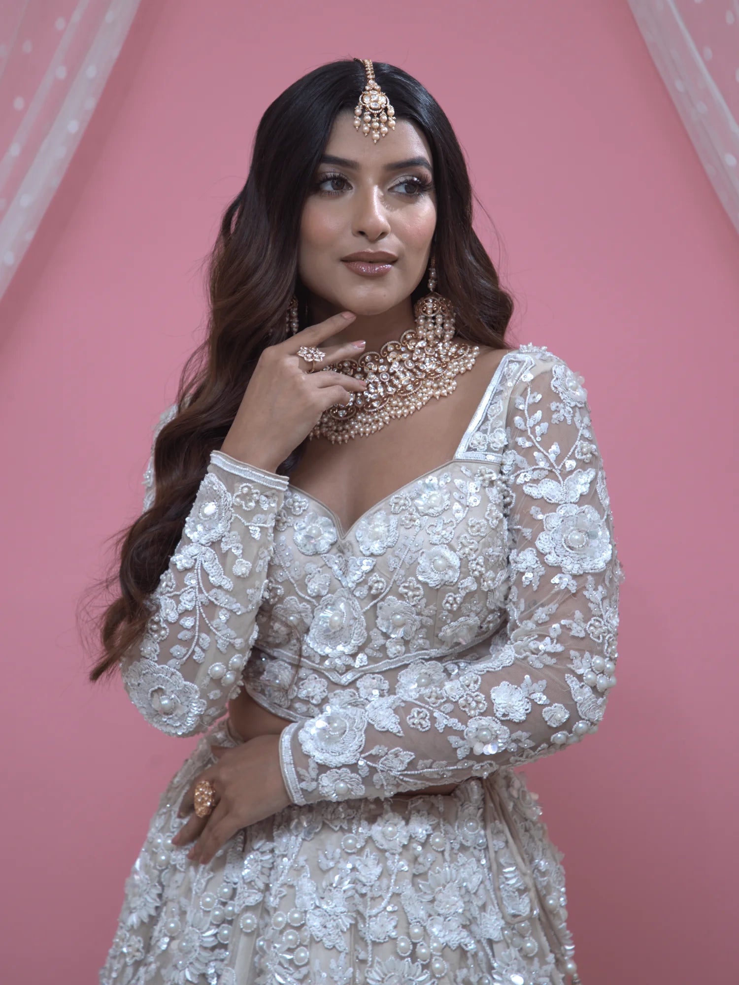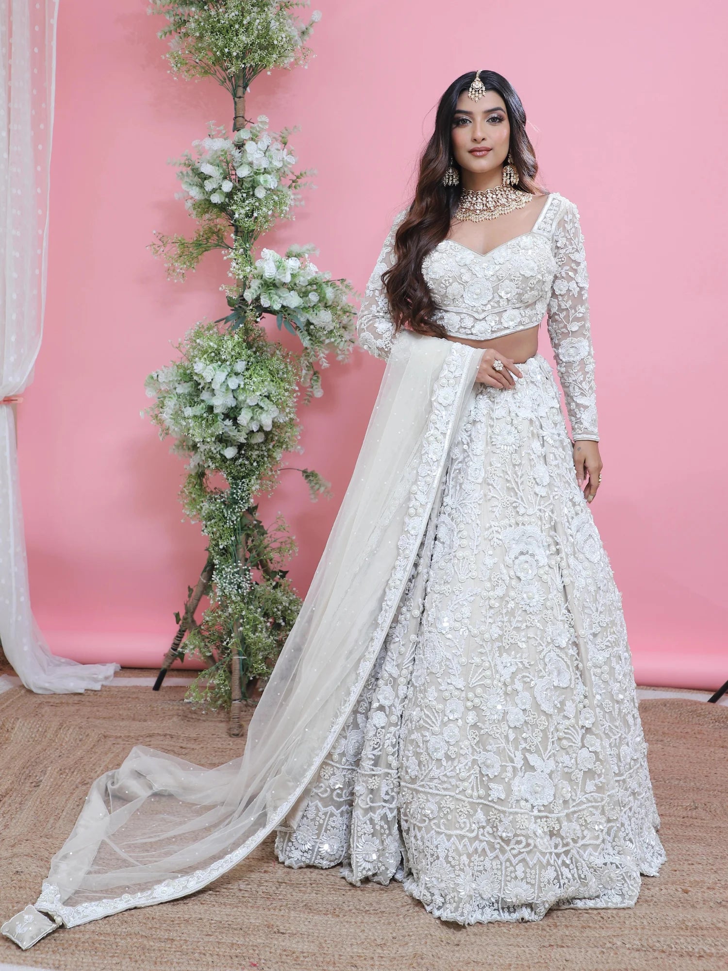 This ethereal white lehenga is a picture of delicate elegance and intricate craftsmanship. The ensemble features a full-sleeved, cropped choli (blouse) with a sweetheart neckline. The entire blouse is heavily embellished with what appears to be intricate white-on-white embroidery or lace, creating a textured and sophisticated look.