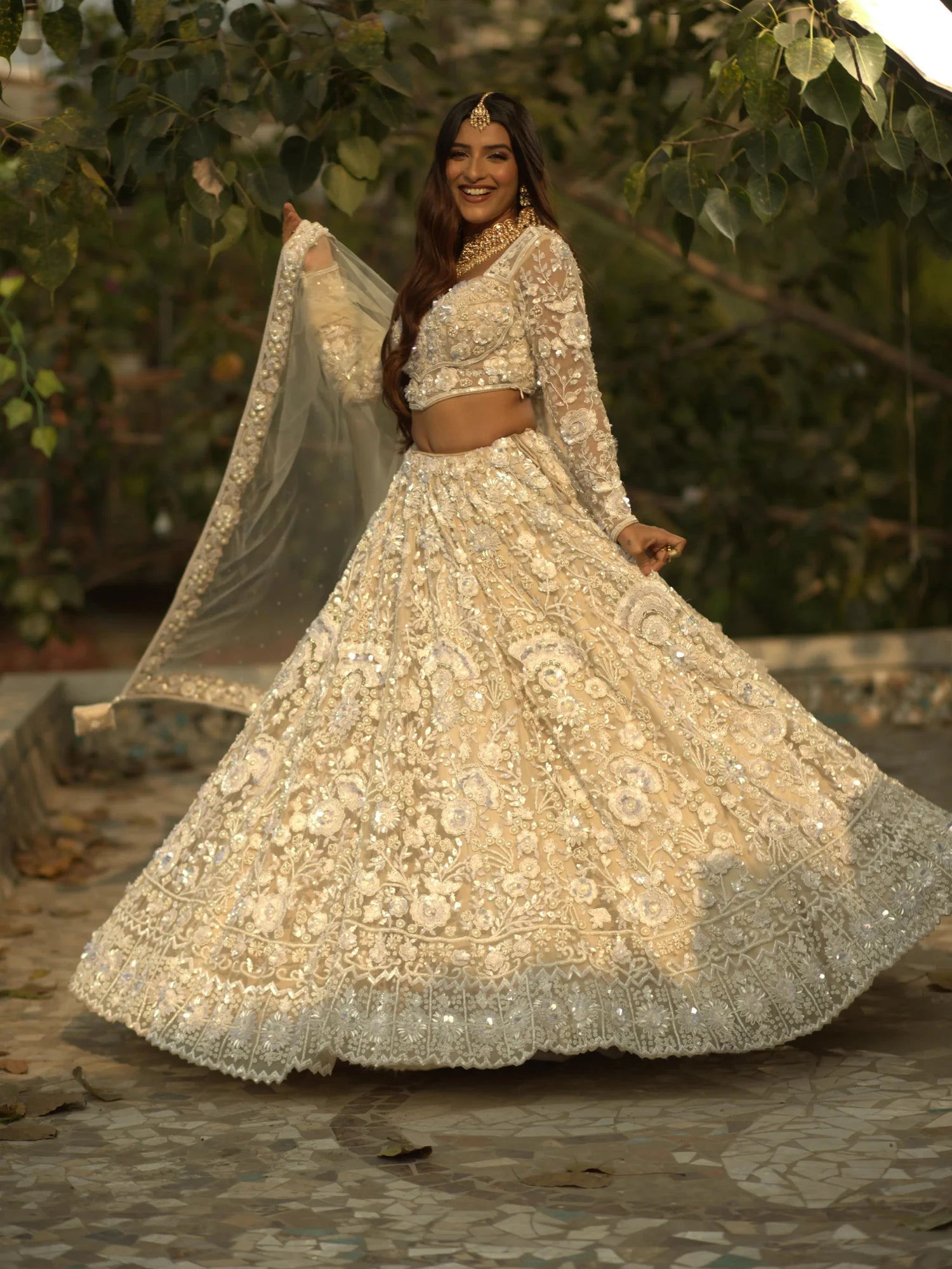 The high-waisted lehenga skirt flows into a voluminous A-line silhouette and is also entirely covered in the same delicate embroidery or lace as the blouse, ensuring a seamless and luxurious feel. The intricate patterns add depth and visual interest to the monochromatic outfit.