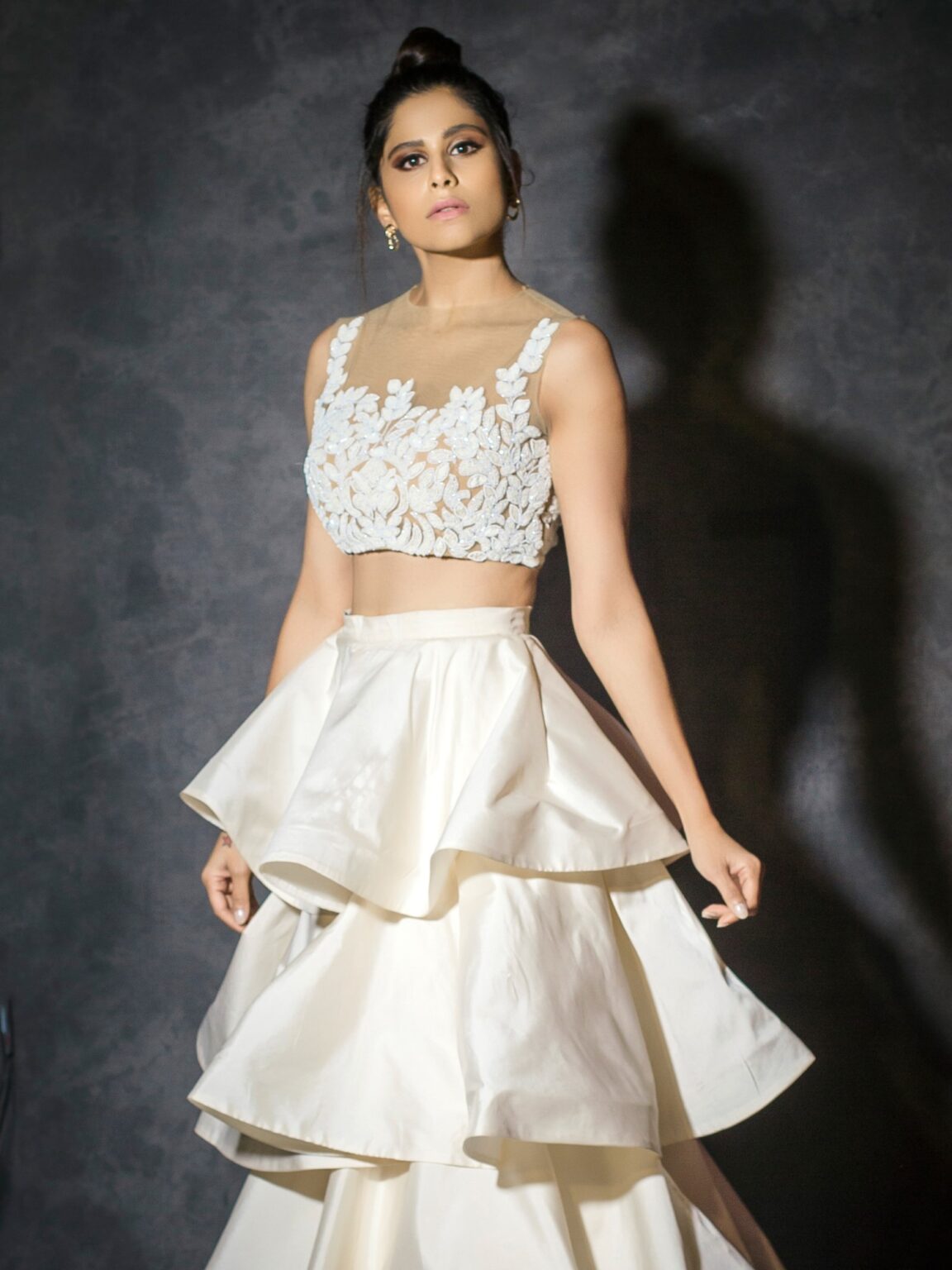 The skirt is a statement piece, featuring multiple tiers of ruffled or flared fabric that create a voluminous and dynamic silhouette. The layers add movement and a touch of drama to the overall look.