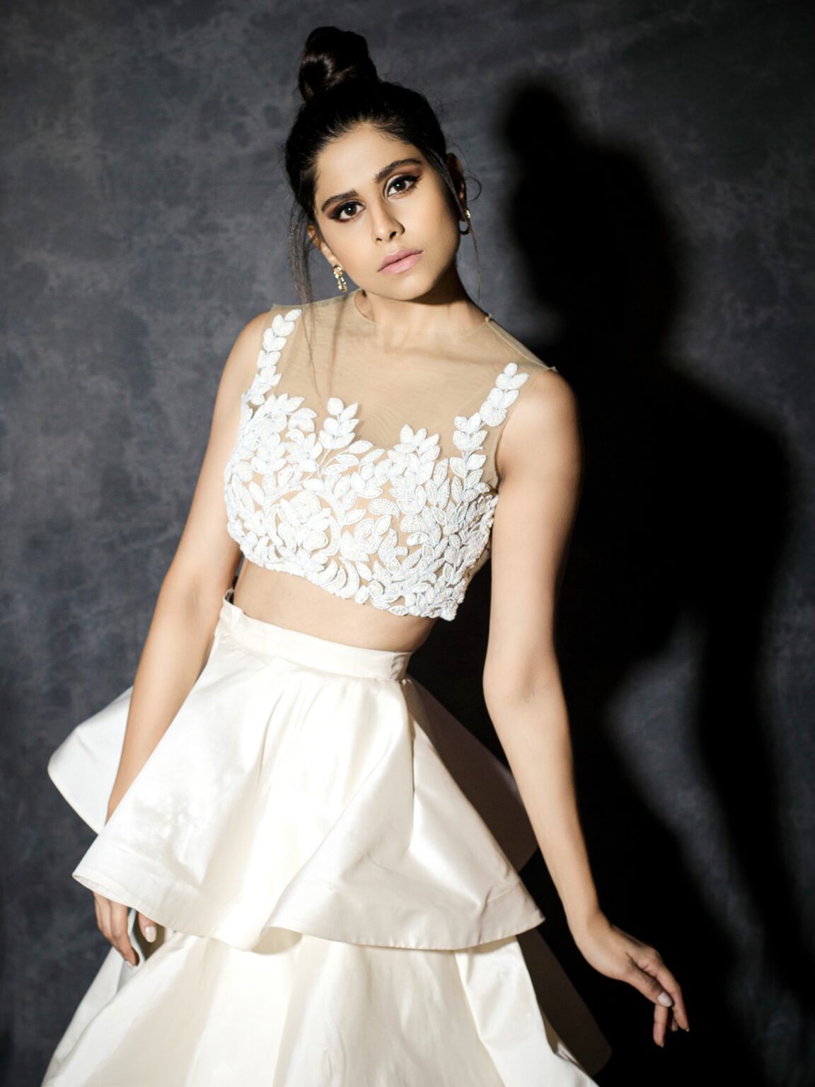 The sleeveless crop top is intricately designed with a delicate floral lace or embroidered overlay, possibly with a sheer fabric panel at the upper neckline for a subtle illusion effect. The fitted silhouette of the top accentuates the waist.