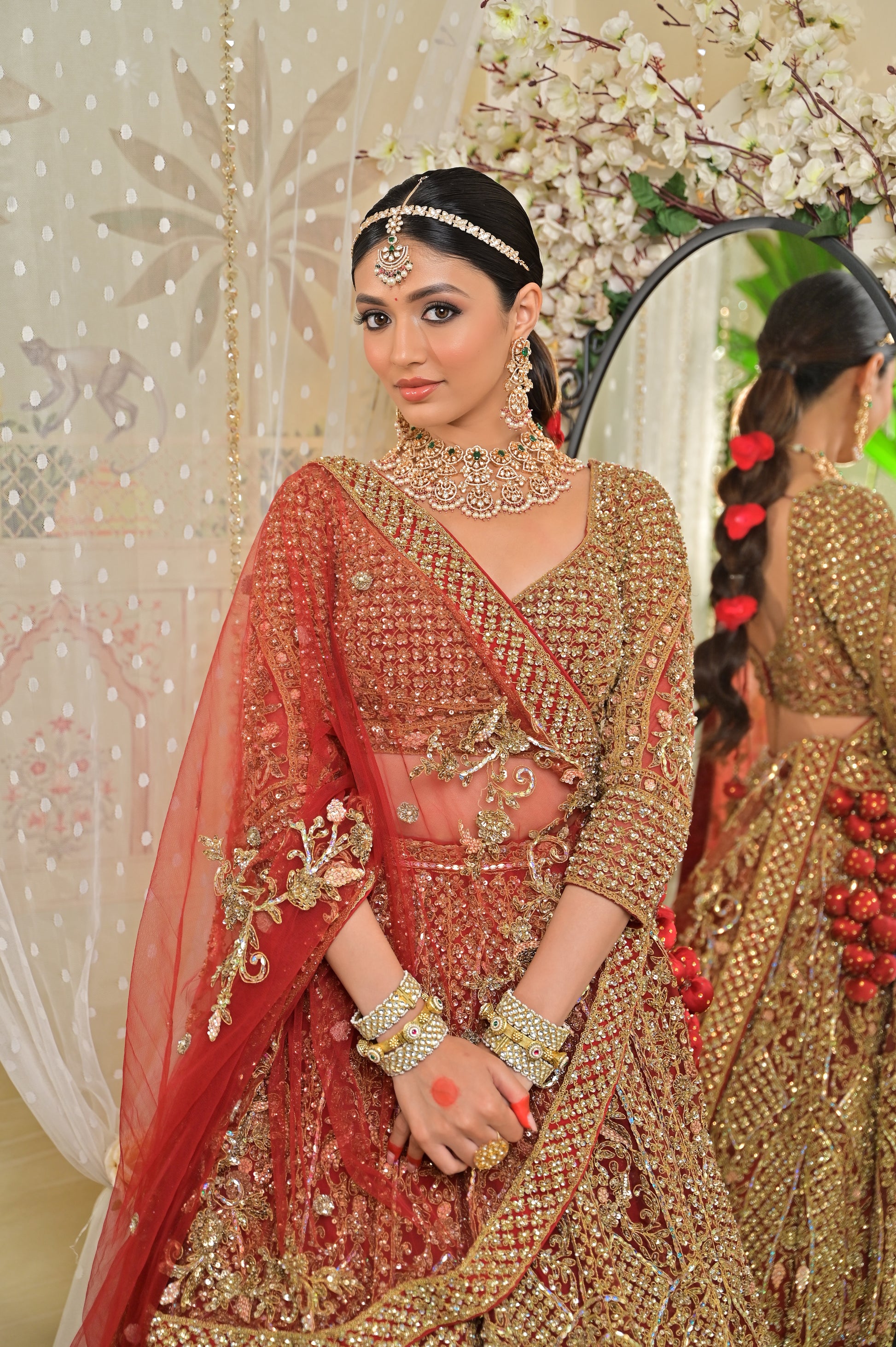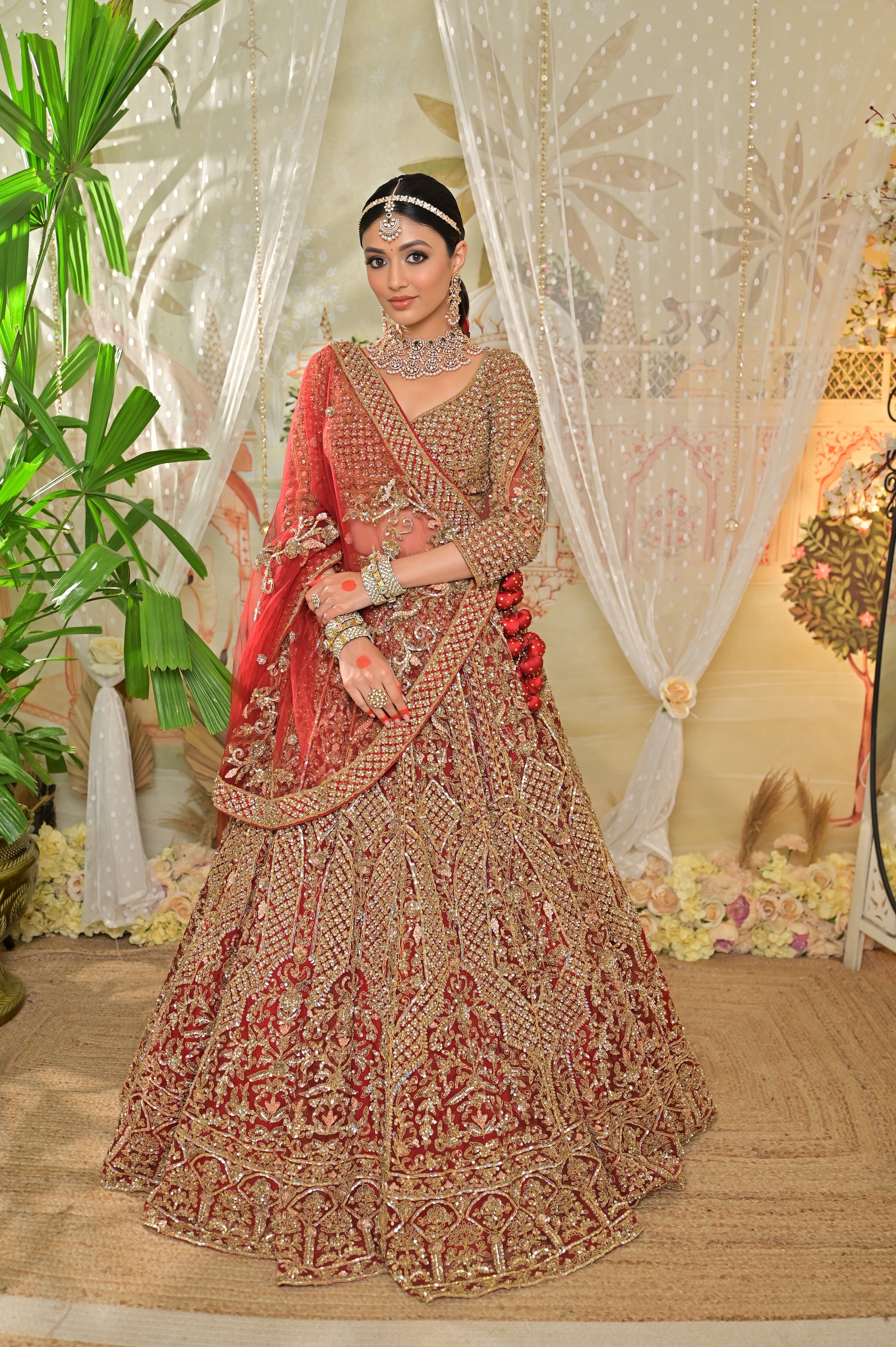 This outfit is a majestic red and gold bridal lehenga, exuding regal charm and timeless elegance. It features: