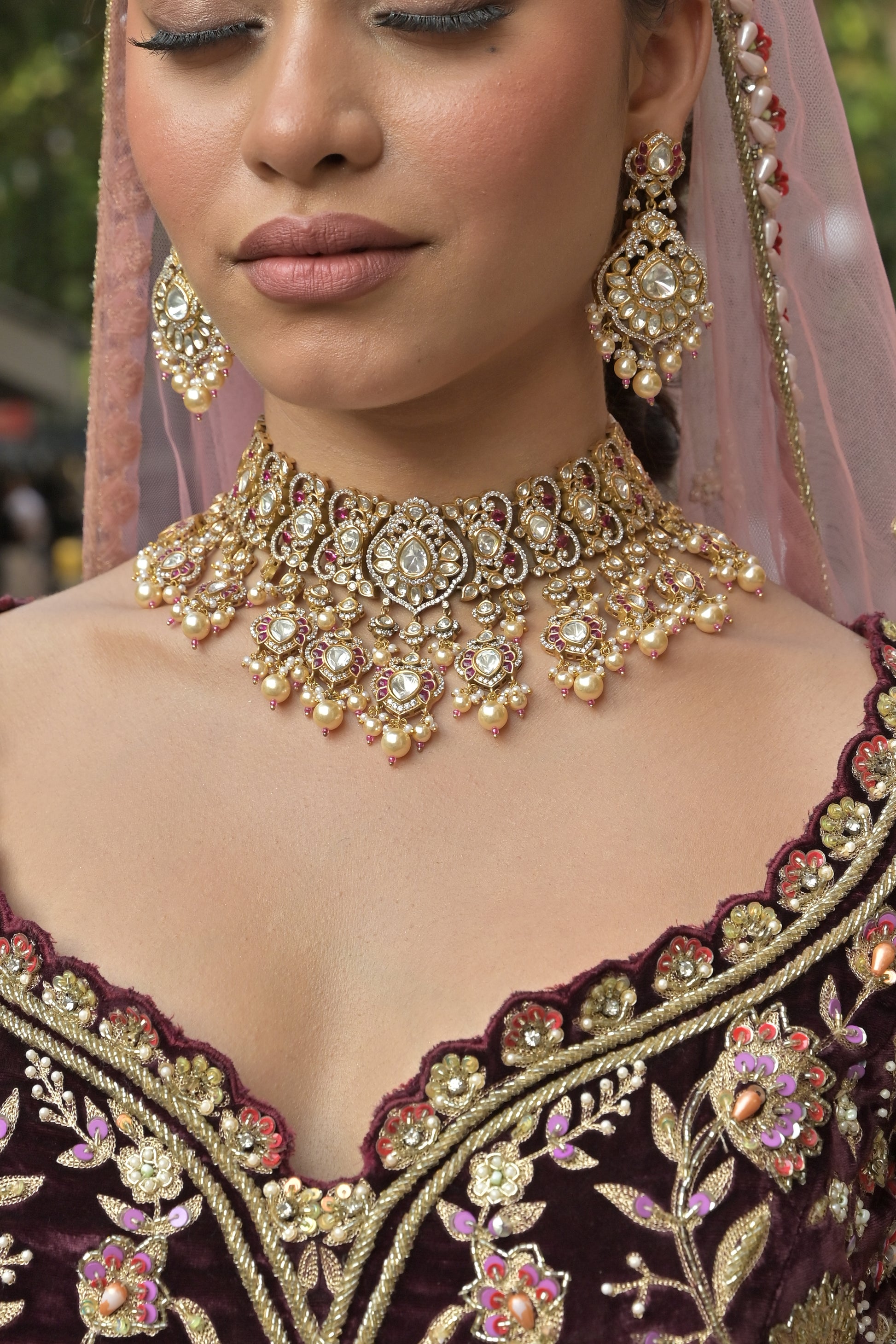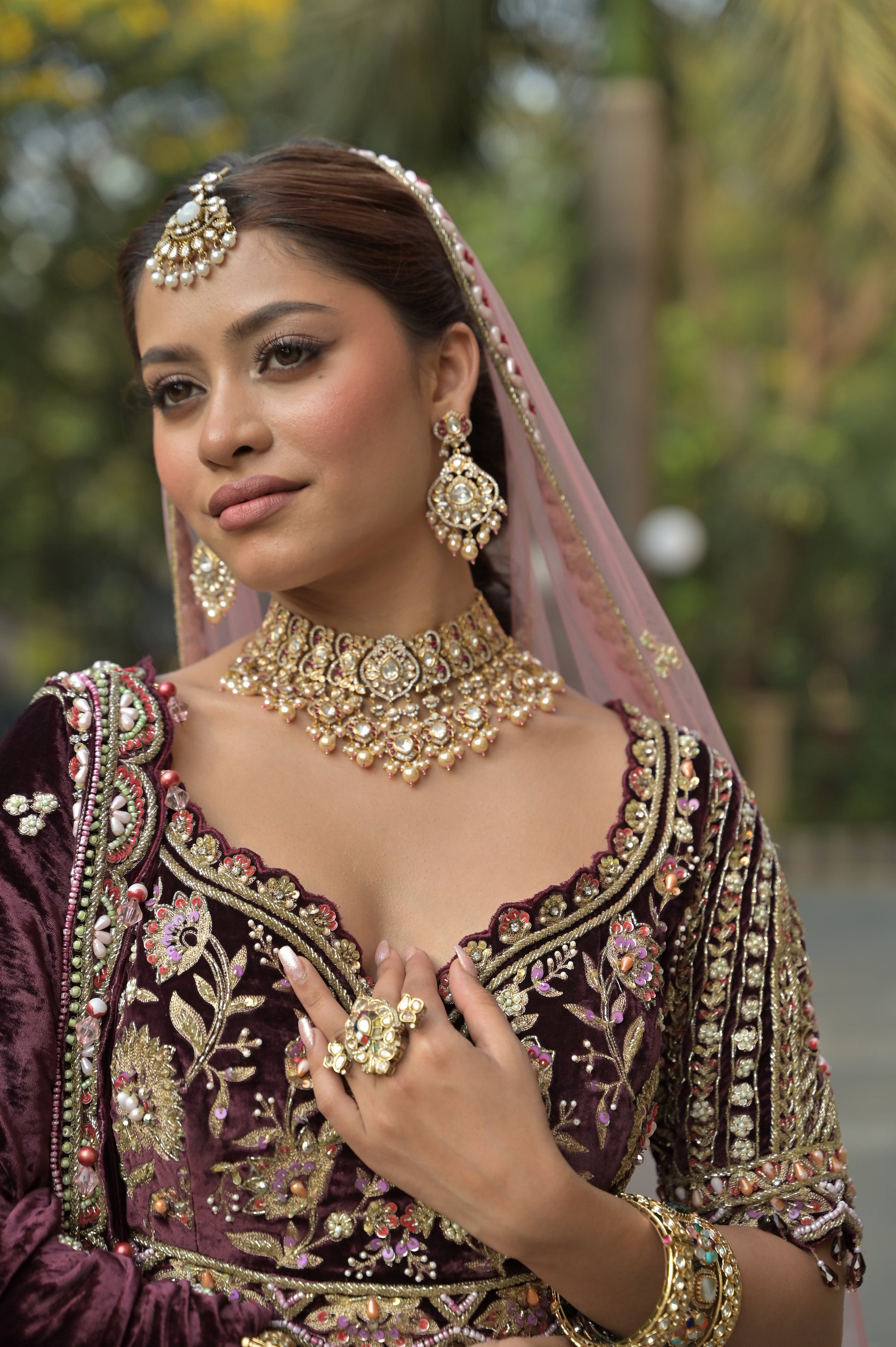 A richly embroidered blouse with intricate patterns in a luxurious deep maroon and gold palette, offering a regal look.