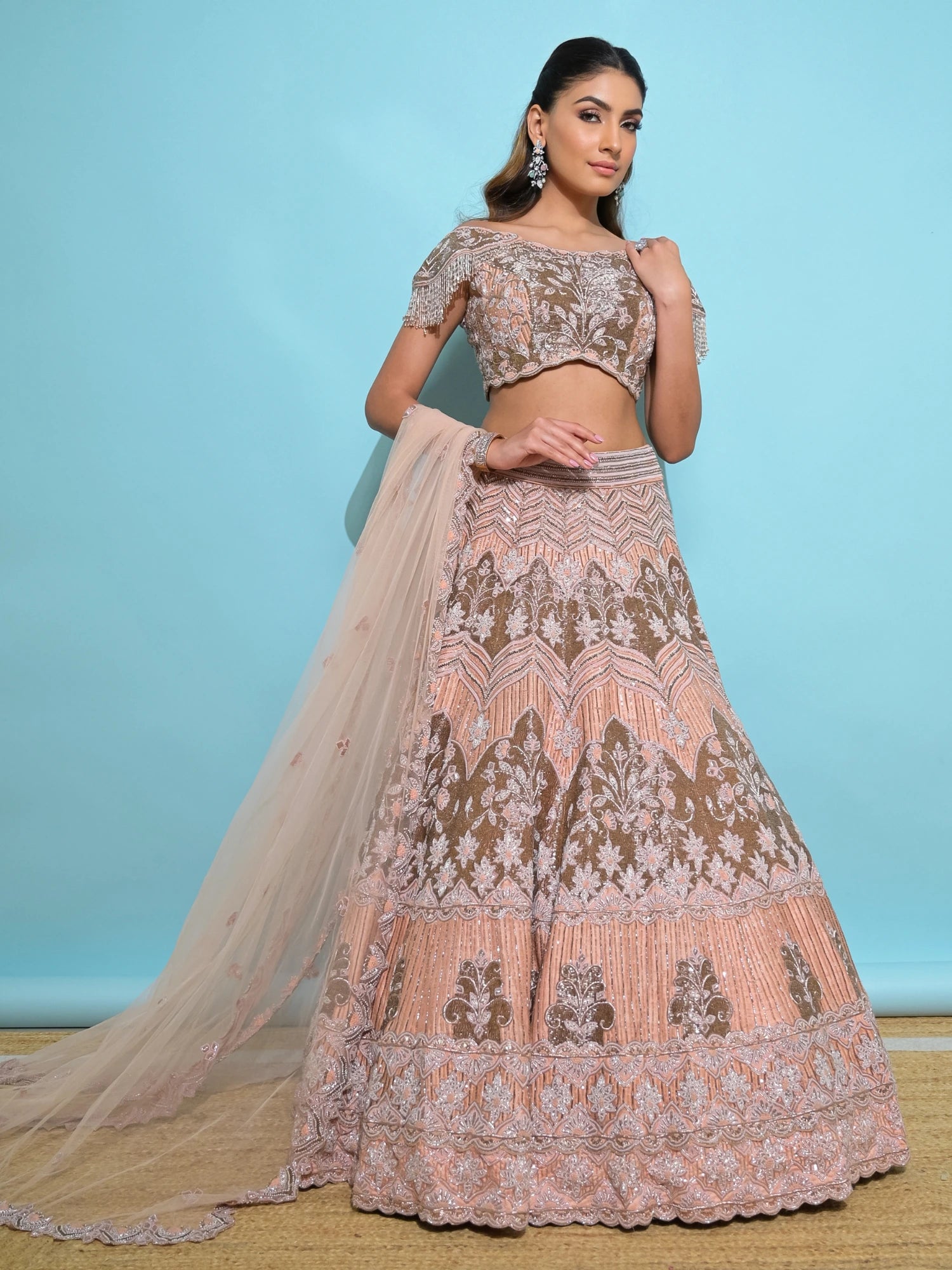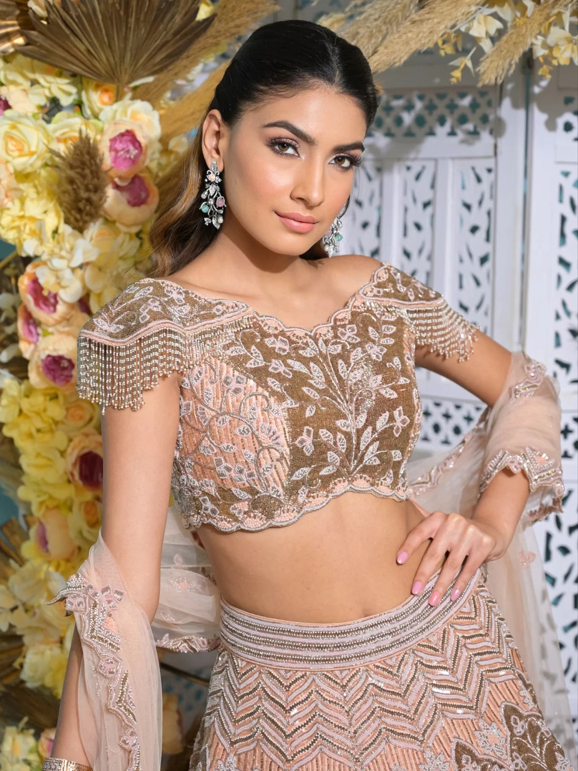Grace meets grandeur in this intricately crafted blush peach and antique gold lehenga set, ideal for wedding receptions, engagement soirées, or festive evenings. This regal ensemble is a celebration of timeless design and rich detail: