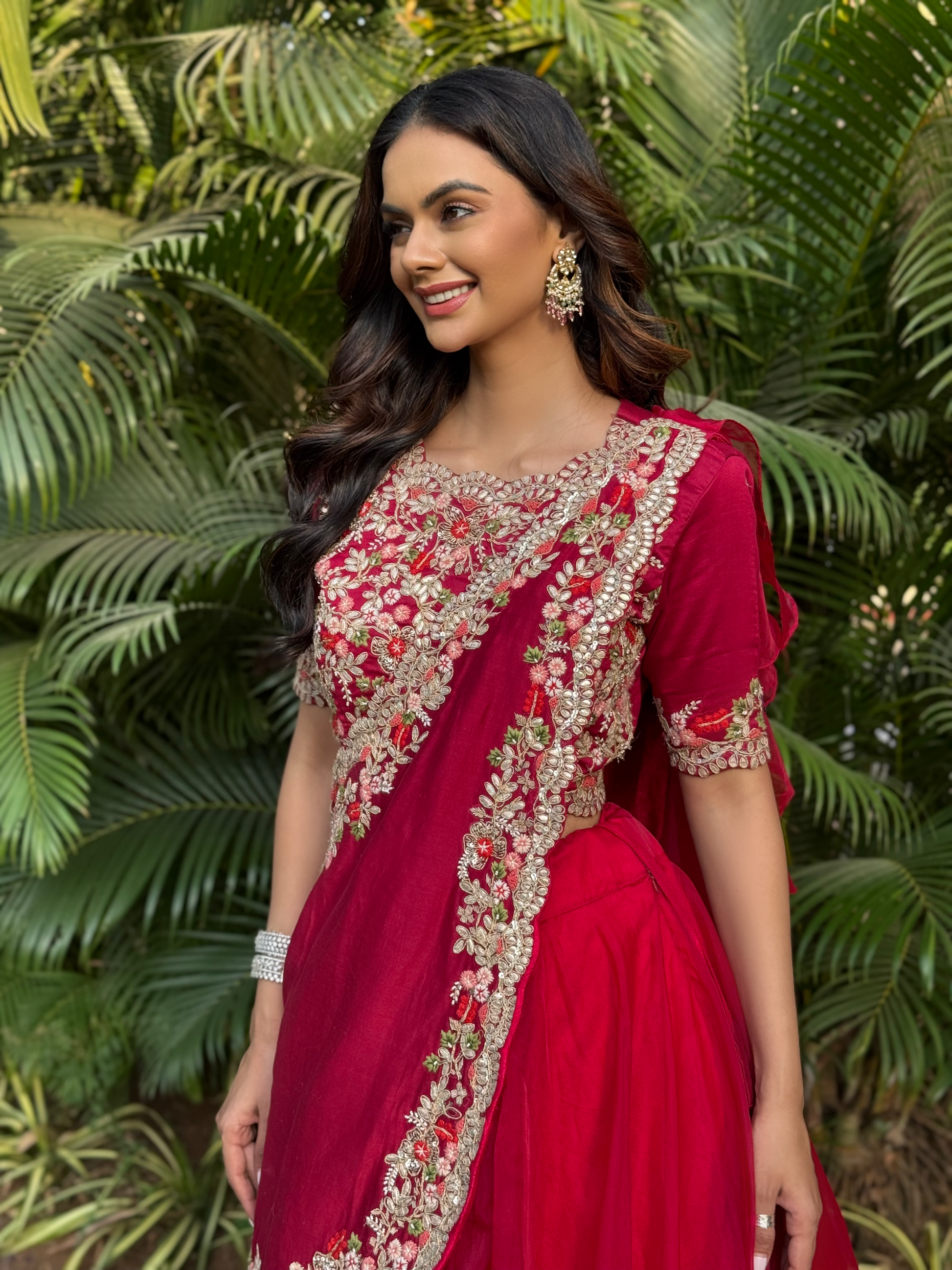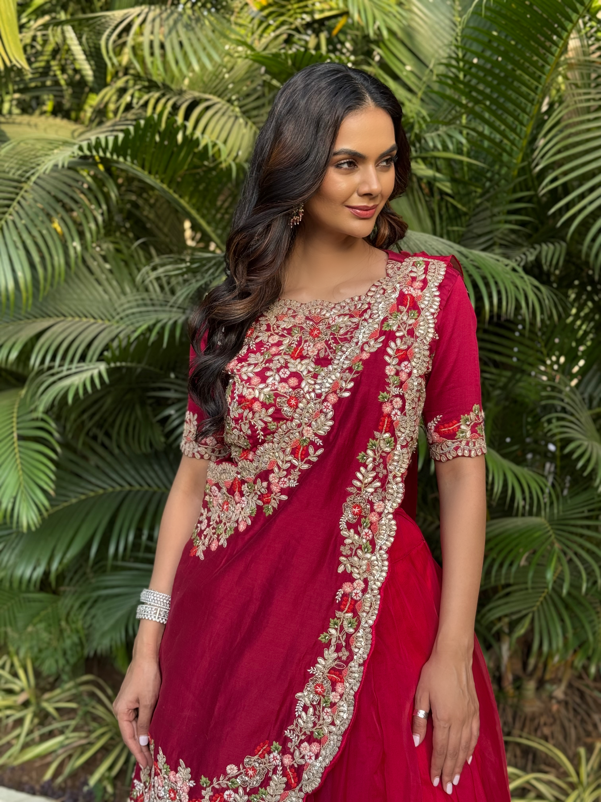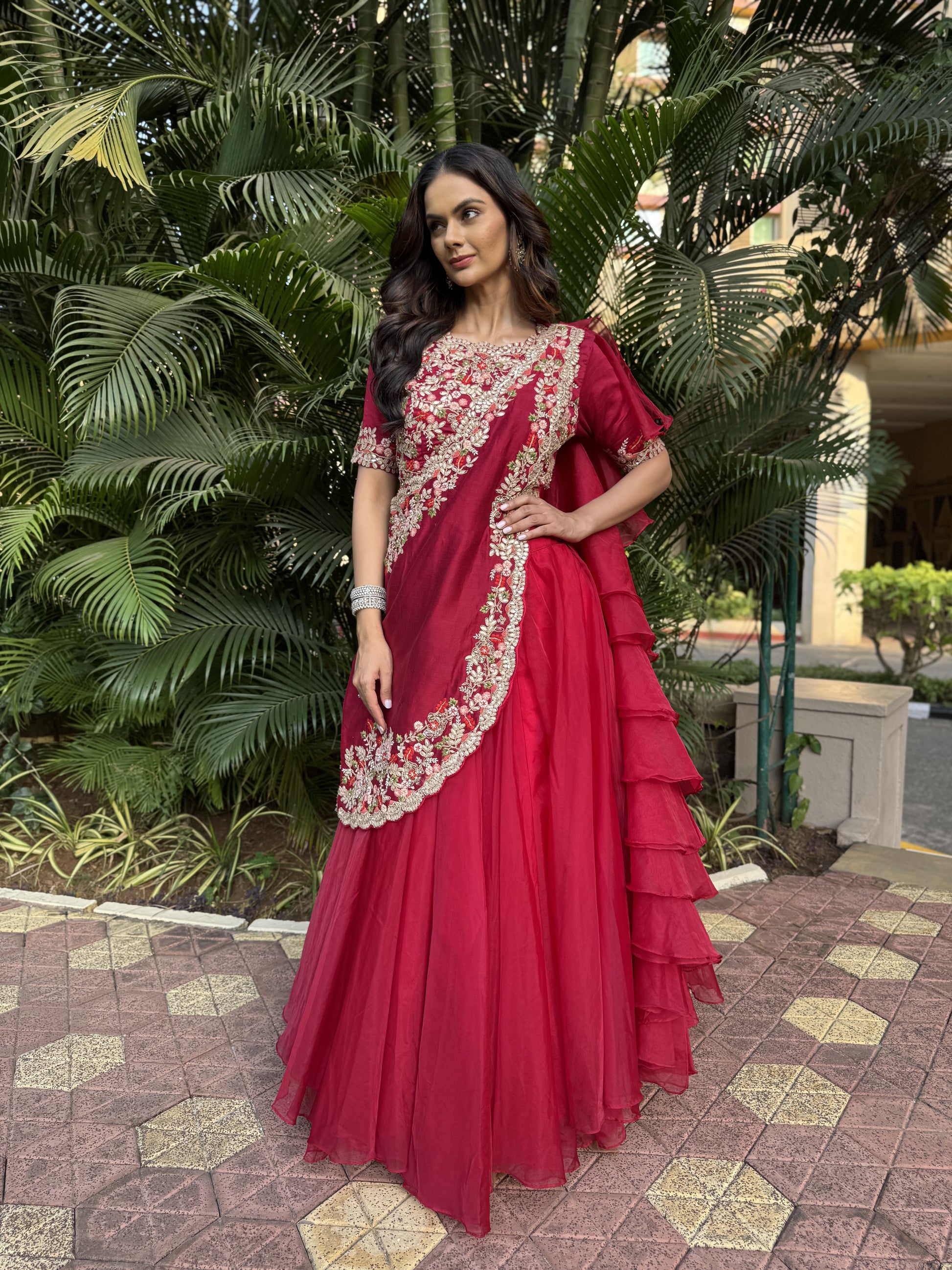 This elegant and contemporary ethnic outfit features a beautifully draped style in a rich maroon or deep red color. It appears to be a fusion of traditional and modern design elements.