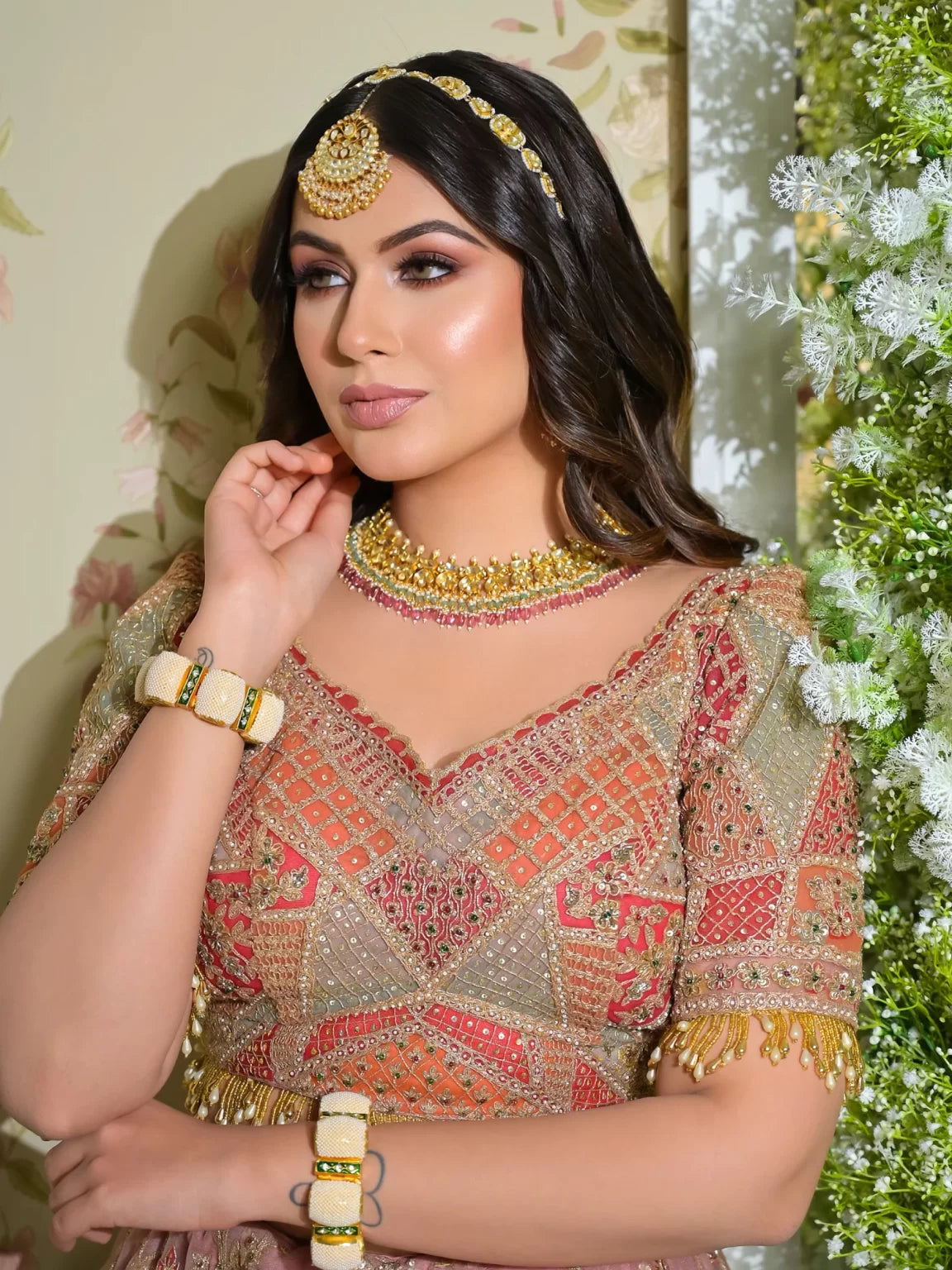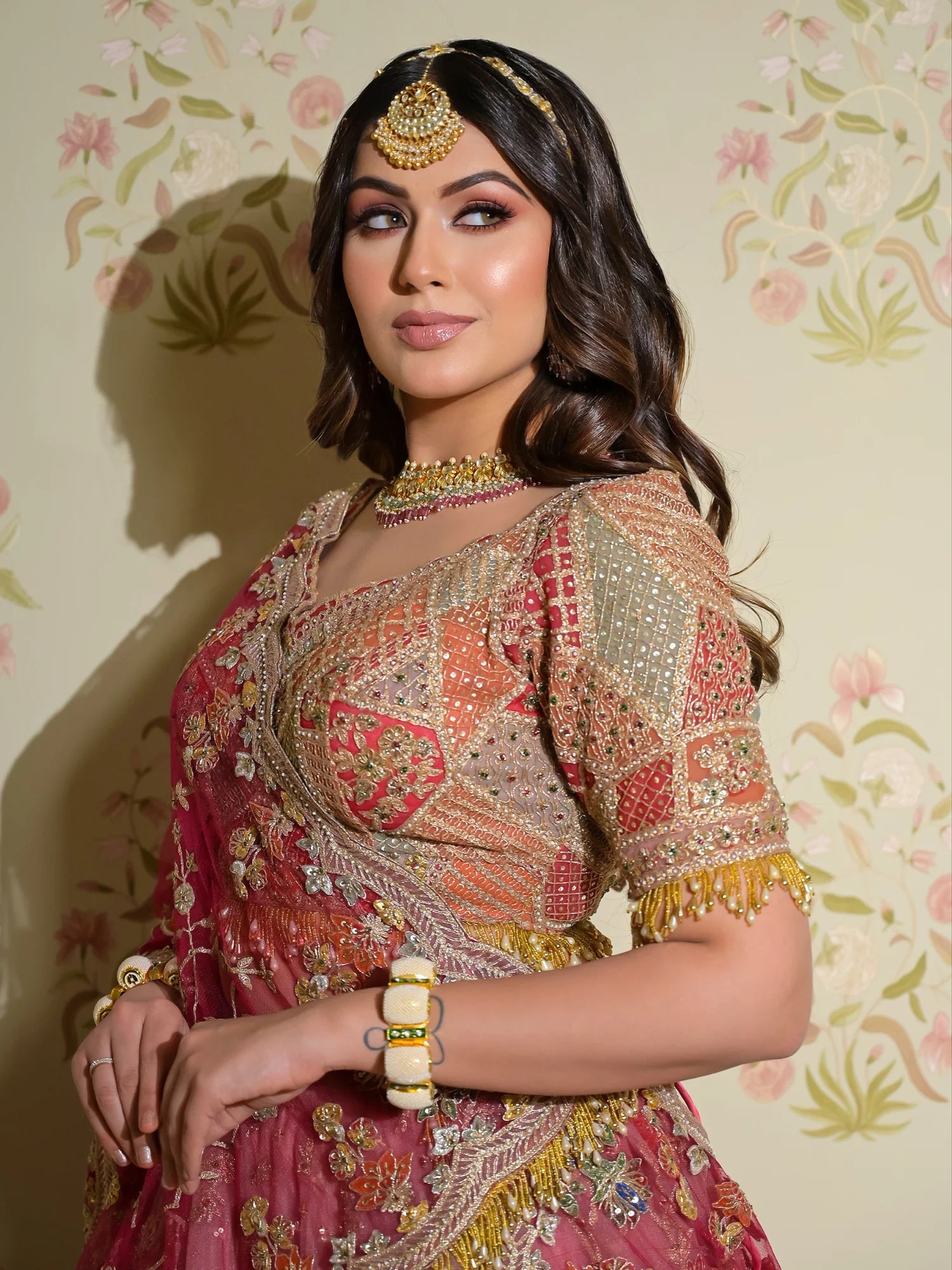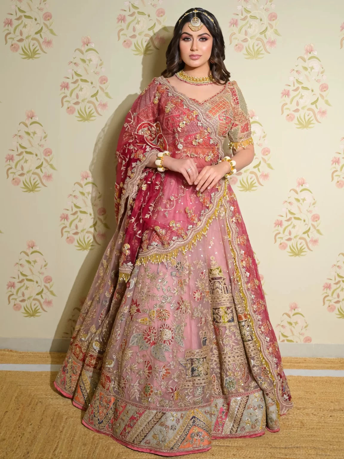 The choli, a fitted blouse, appears to be in a coordinating shade with similar intricate embroidery, featuring a V-neckline. A sheer dupatta, with a blend of pink and maroon and a heavily embellished gold border, is draped across the person's torso and over one shoulder. The dupatta also has smaller decorative elements scattered throughout.