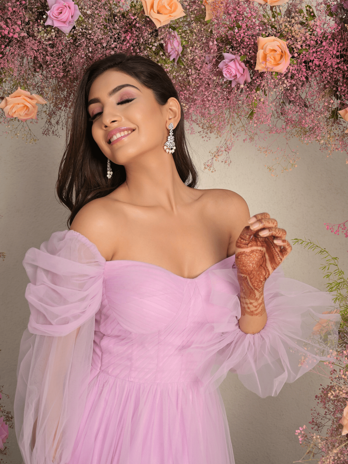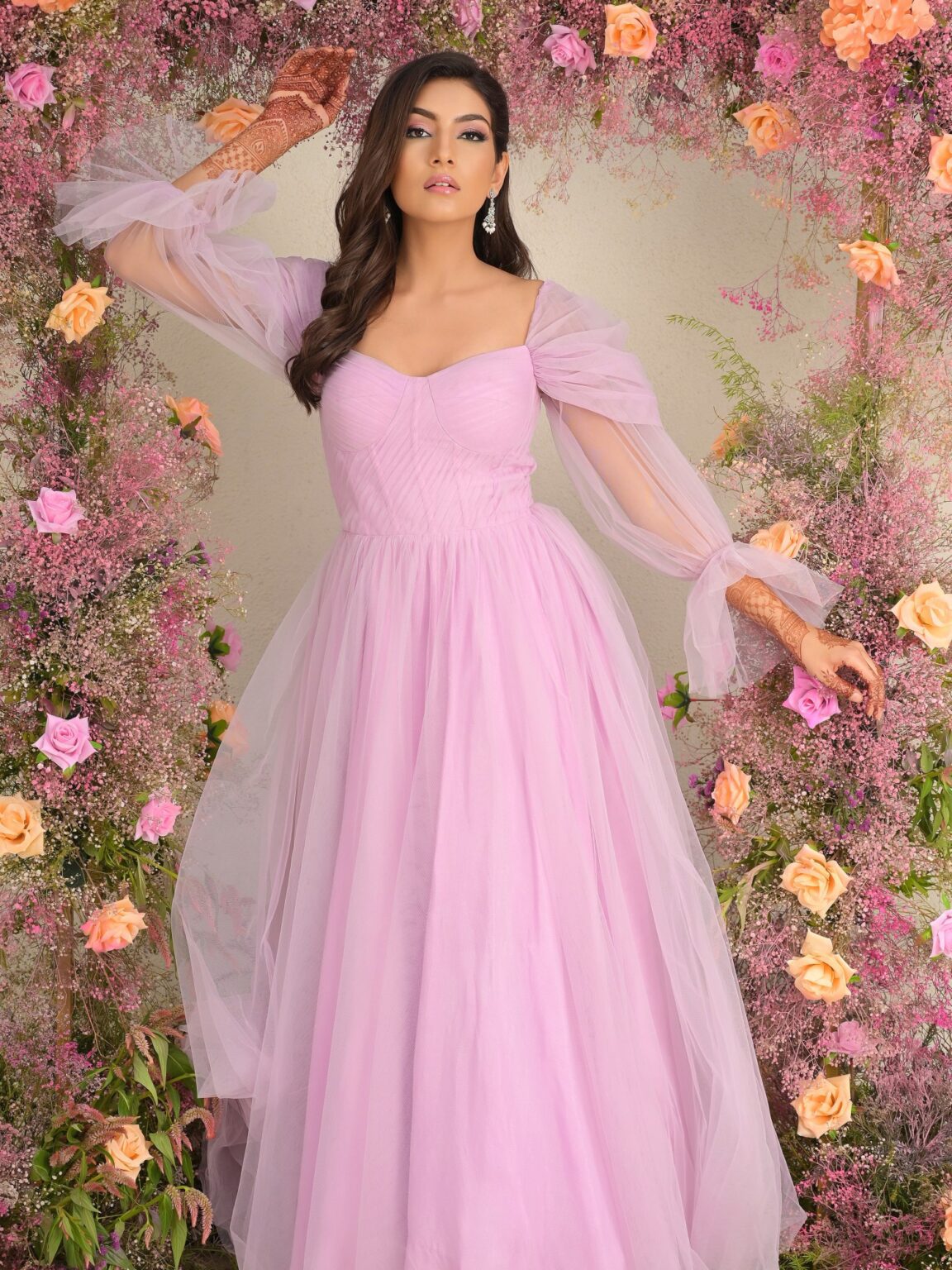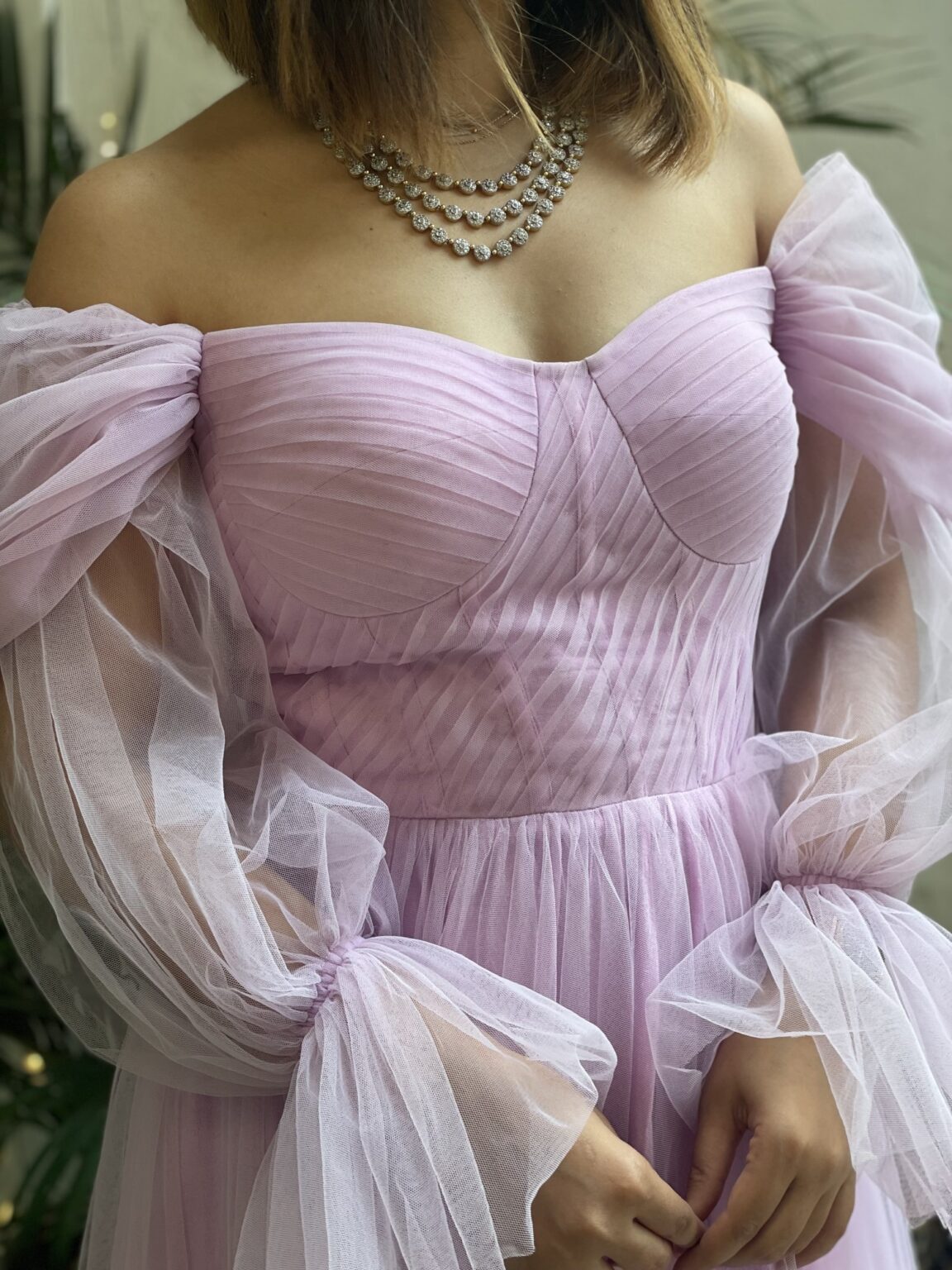 This elegant Lillac tulle gown features delicate fabric for a graceful touch, making it perfect for any formal occasion. The flowing design and intricate details create a timeless and sophisticated look. Elevate your style with this luxurious gown and make a statement at your next event.