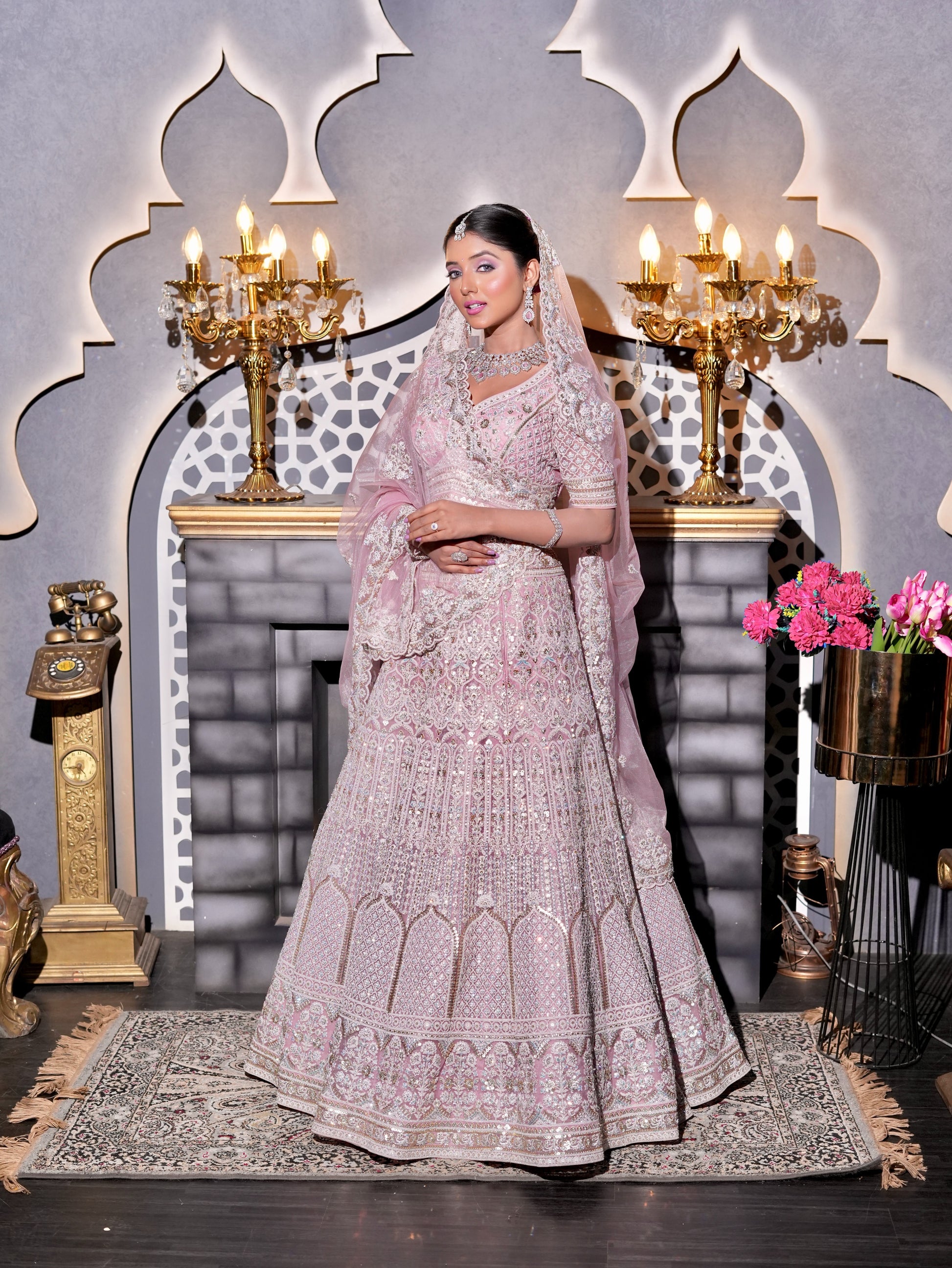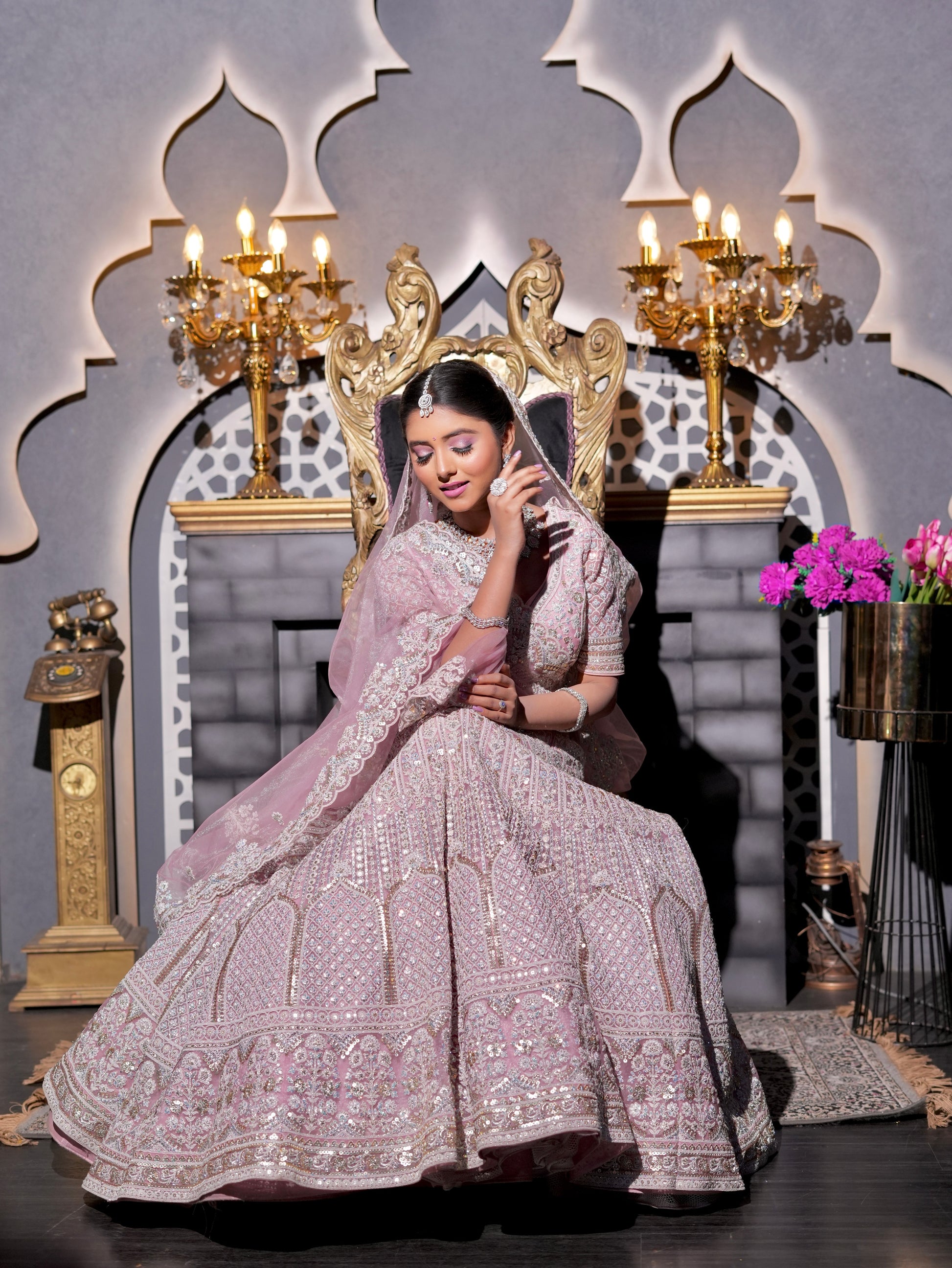 The Choli (Top): The top is a heavily embellished blouse in a delicate shade of dusty rose or light lavender. It features short sleeves and an ornate neckline, both richly adorned with intricate embroidery, possibly including sequins, beads, and threadwork in silver or a lighter shade. The fitted silhouette is characteristic of bridal wear.