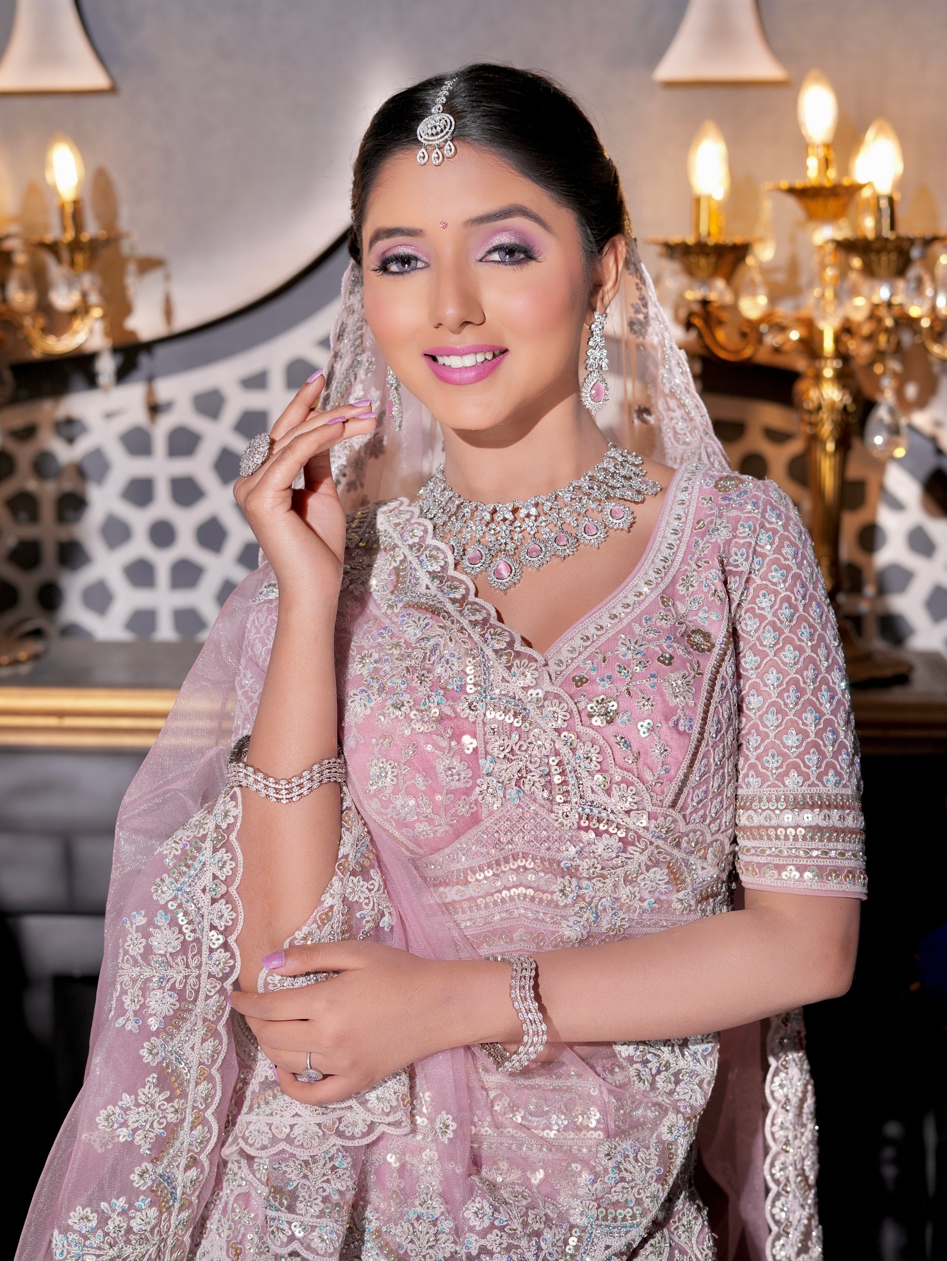 The Dupatta (Veil/Scarf): A sheer dupatta in a lighter shade of pink or lavender is draped over the head and shoulders in a traditional bridal style. It features a matching embroidered border that complements the lehenga and choli. The dupatta adds a layer of grace and completes the traditional bridal look.