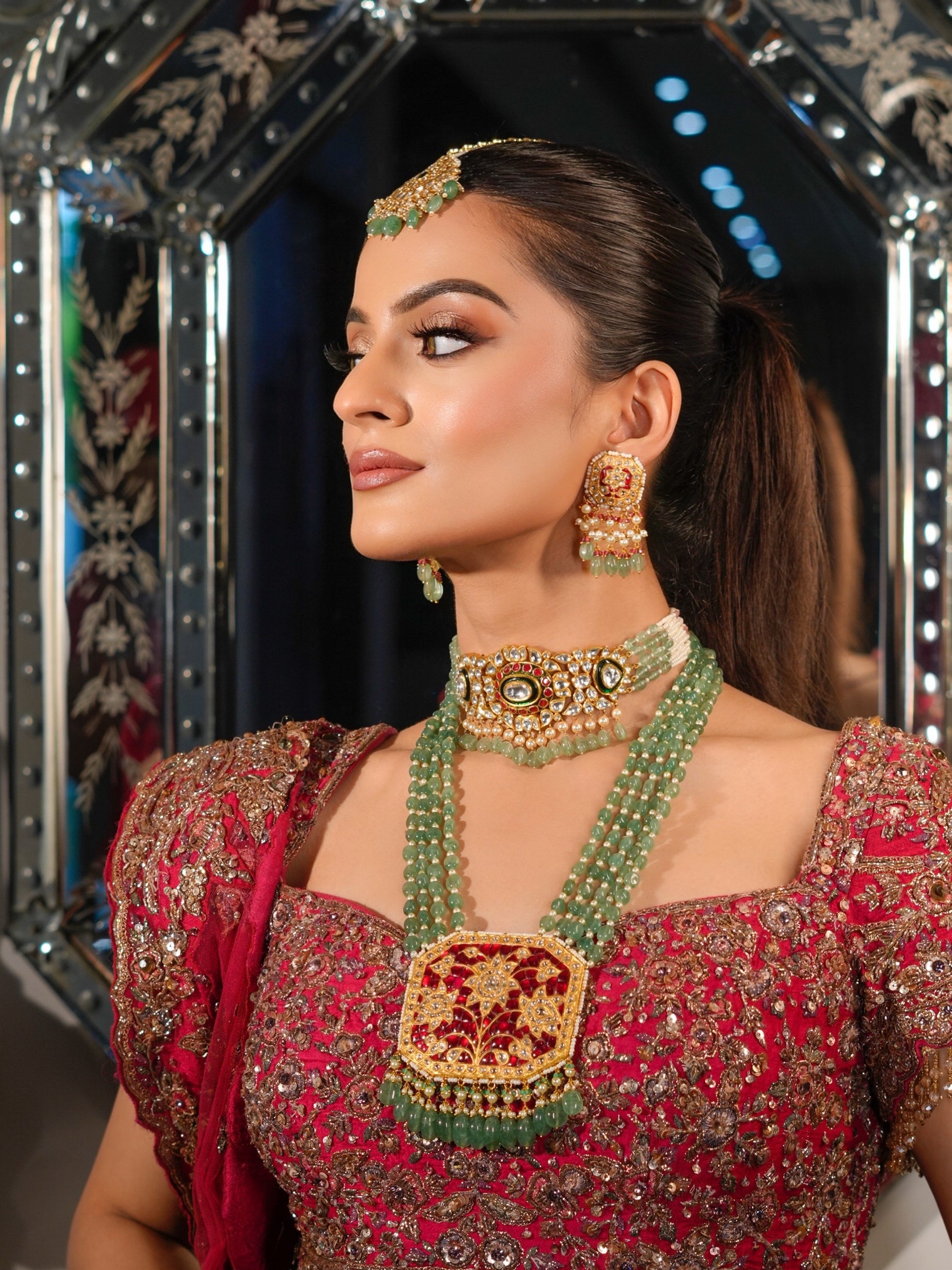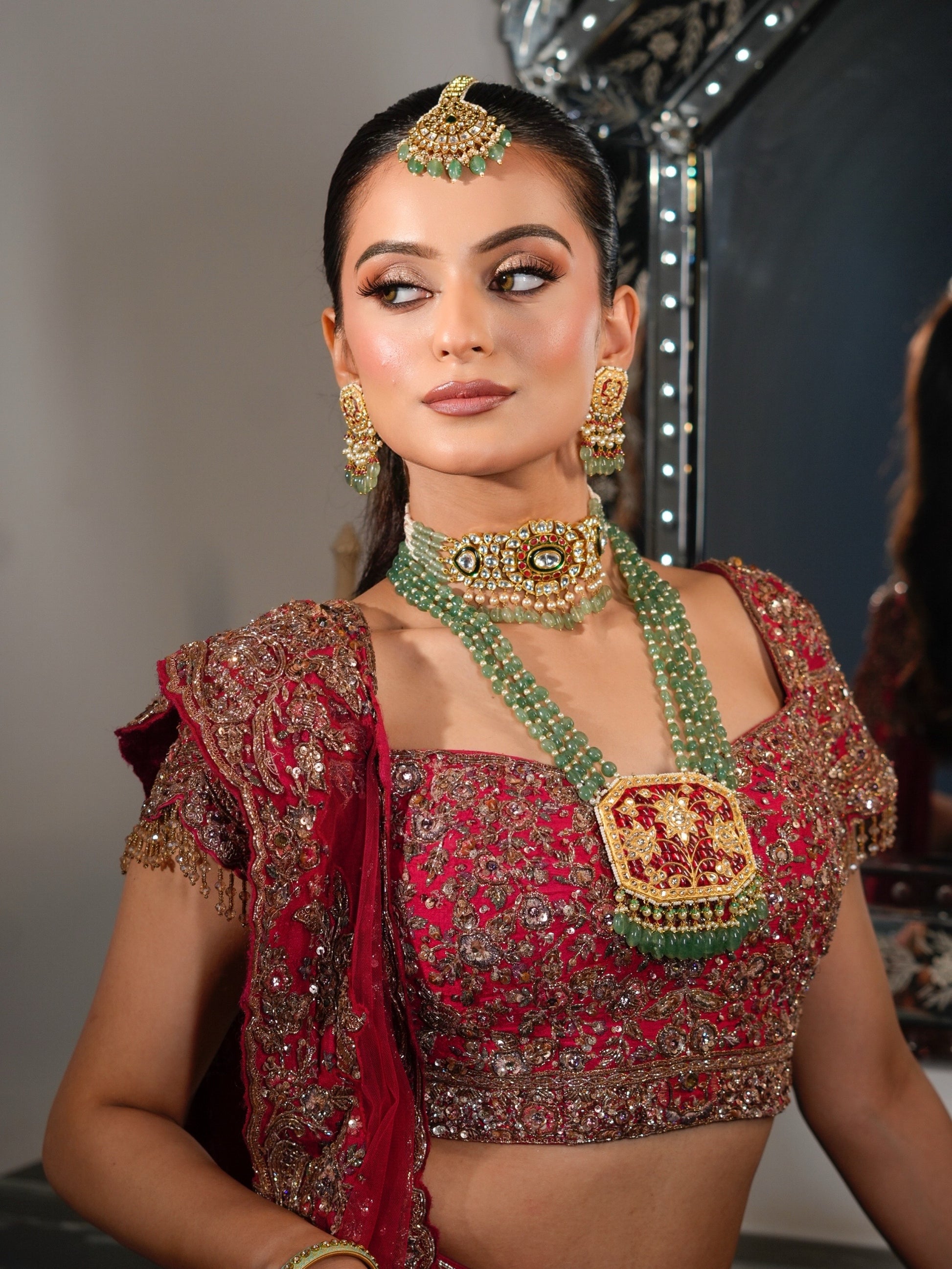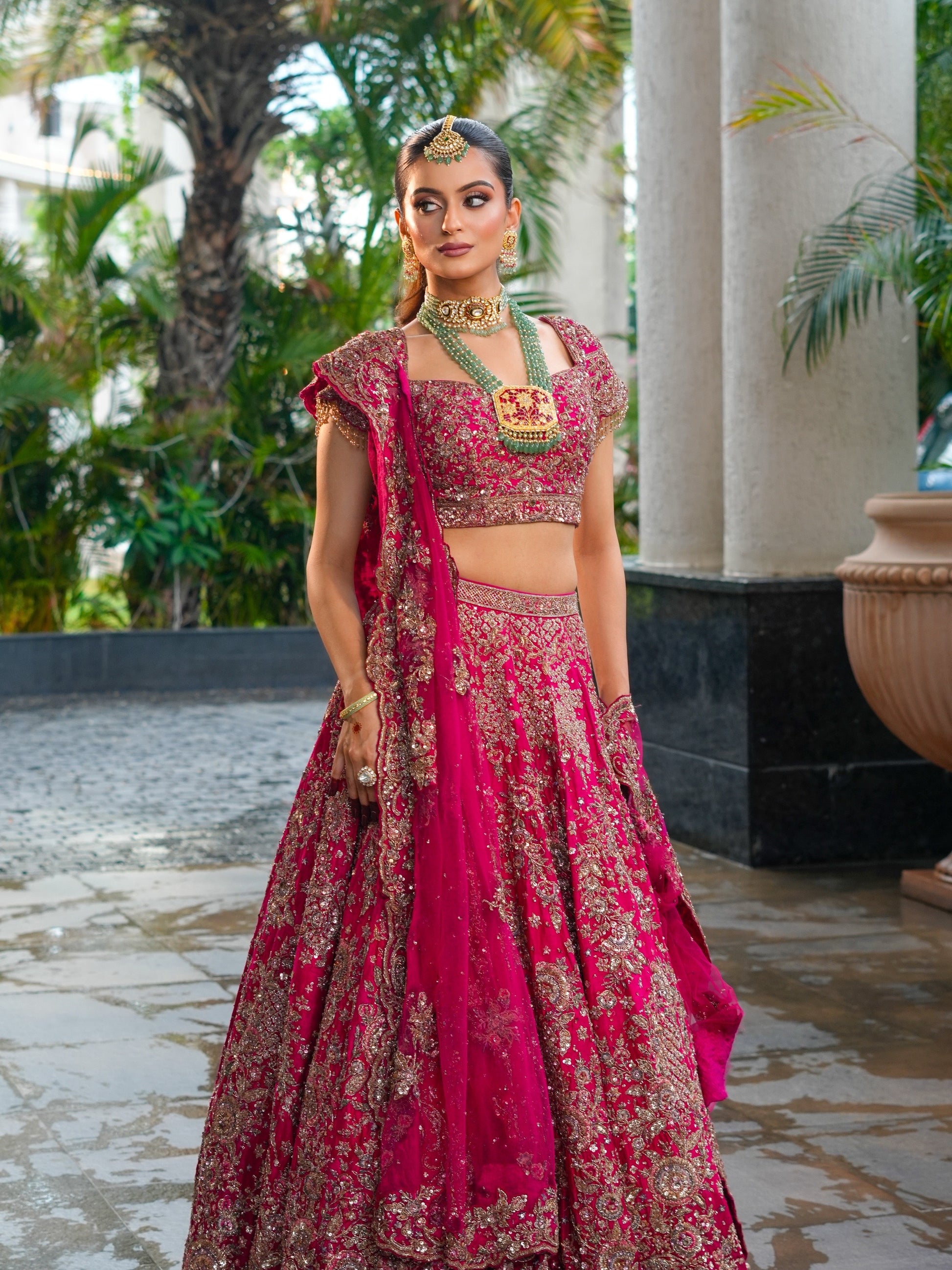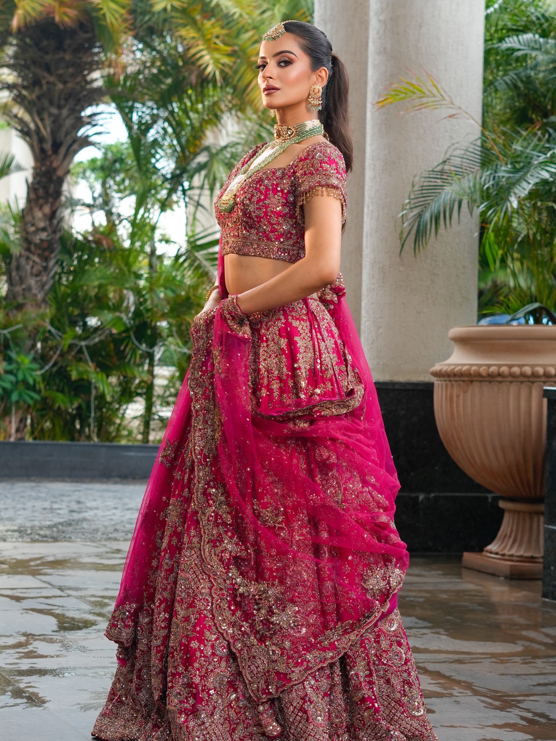 This is a stunning red bridal lehenga set, designed for a bride who loves timeless elegance and intricate craftsmanship. The ensemble includes: