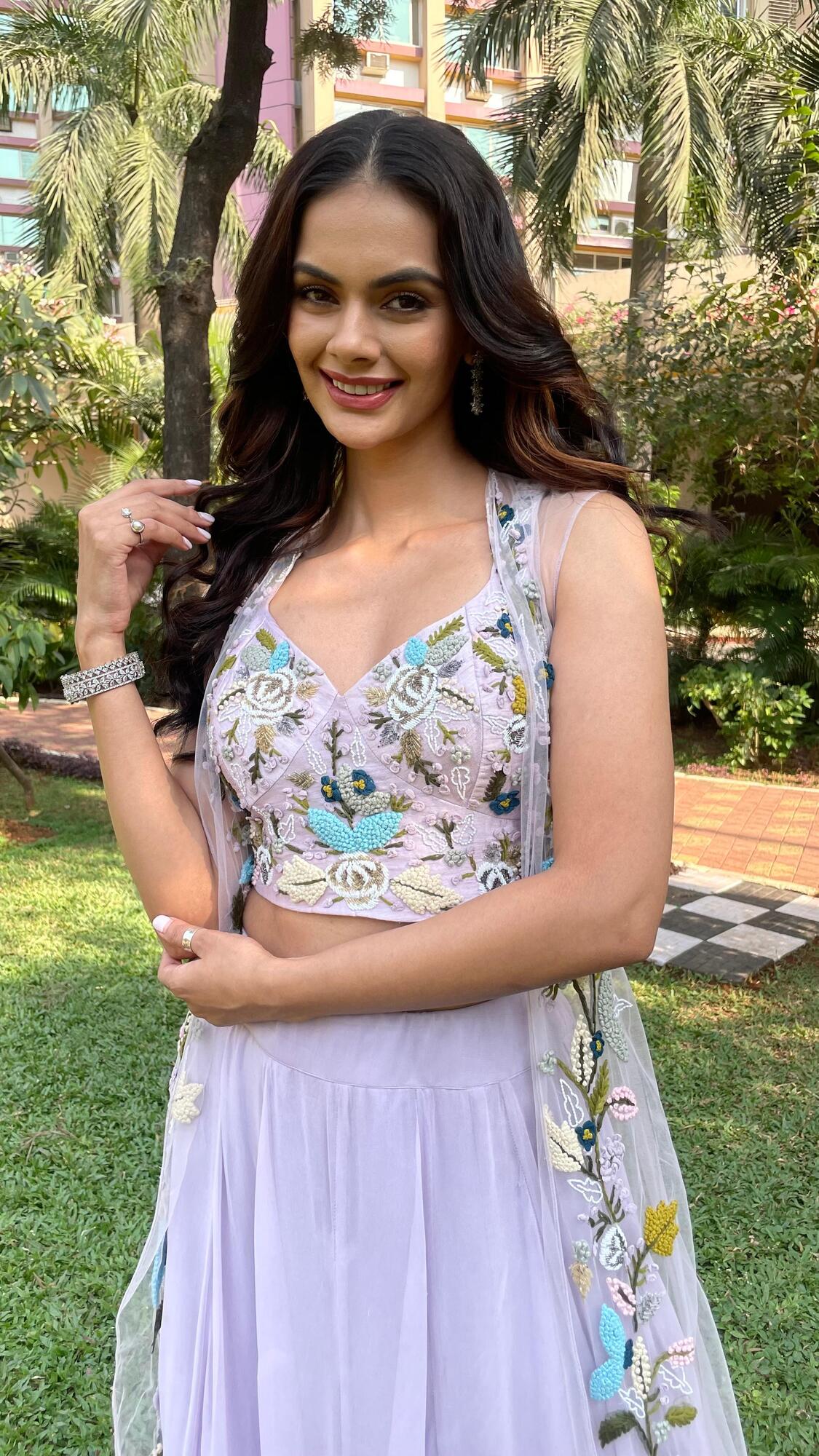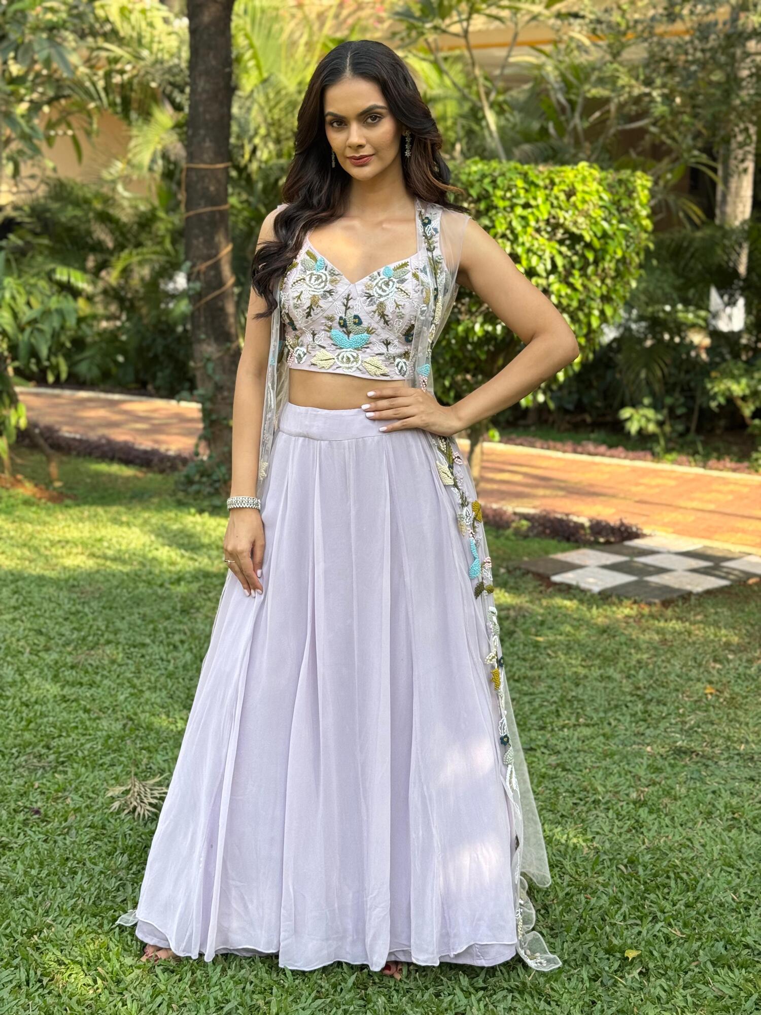 The flowing lehenga (skirt) is a soft, solid light grey or lavender shade, crafted from a fabric that drapes gracefully. It has a subtle sheen, suggesting a luxurious material like silk or a similar blend. A sheer dupatta (scarf or veil) in a matching light color is draped over one shoulder, featuring a delicate border with similar floral embroidery as seen on the choli, adding a cohesive touch to the ensemble.