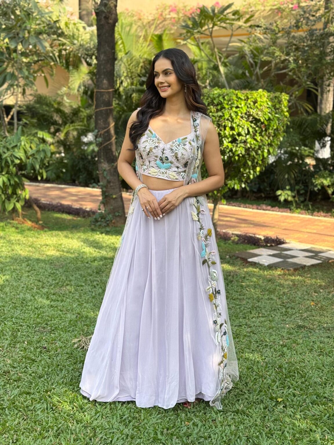 - Flowing, solid light grey or lavender lehenga with a subtle sheen