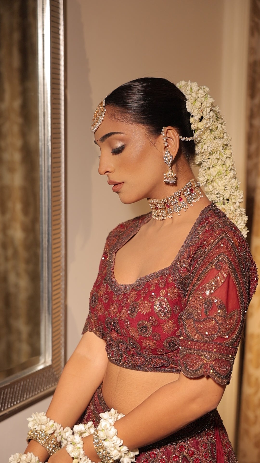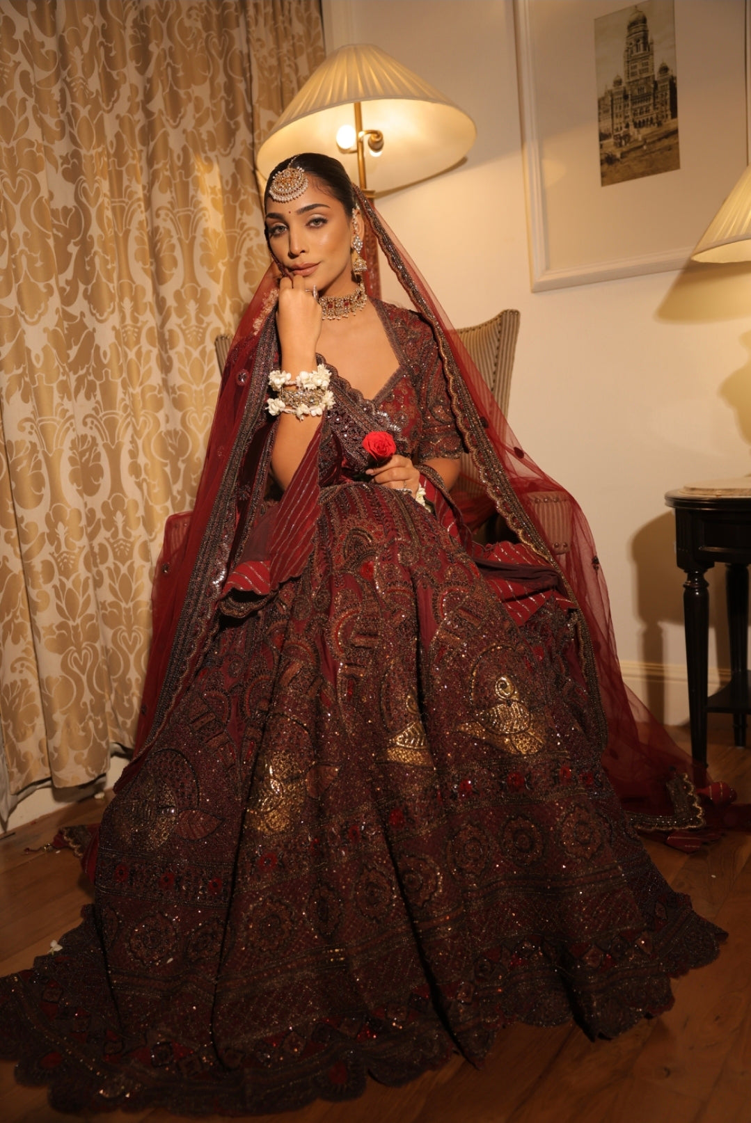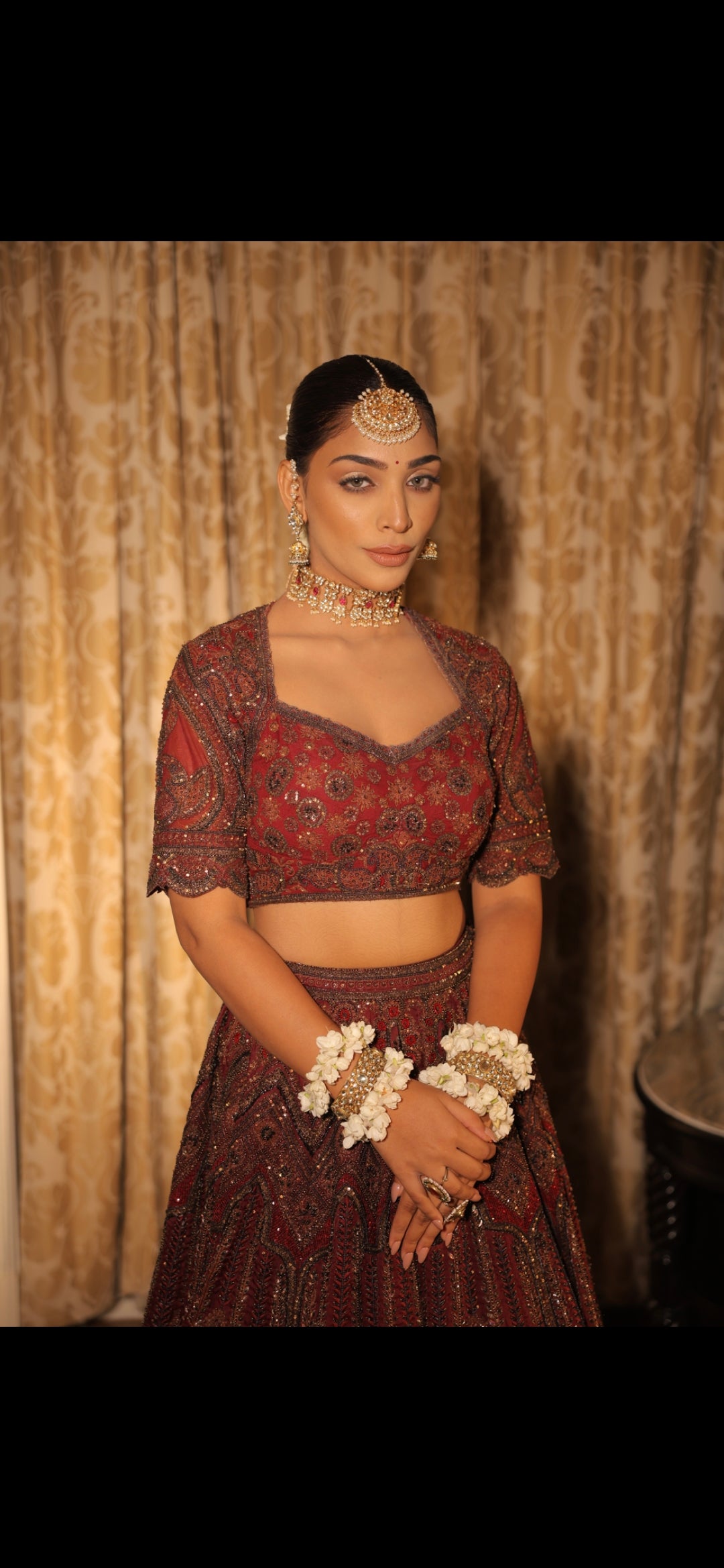 Elevate your bridal elegance with this luxurious maroon velvet lehenga, adorned with exquisite zari and sequin embroidery. The outfit features a regal flared skirt with traditional motifs, complemented by a matching velvet choli and a sheer dupatta bordered with detailed embellishments. Perfect for brides who want to blend timeless tradition with royal sophistication.