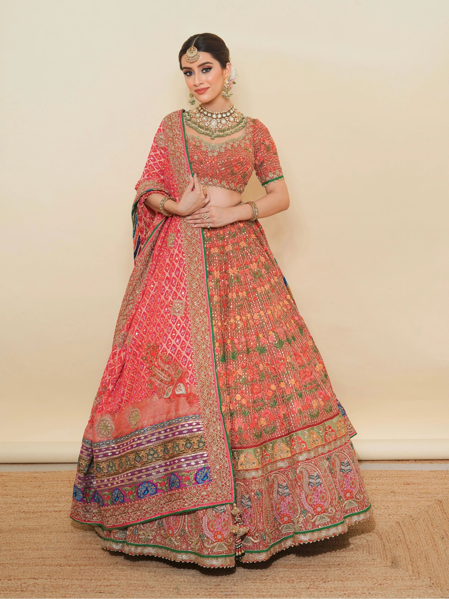 This vibrant multicolor lehenga is a stunning choice for festive occasions, weddings, and cultural celebrations. It features: