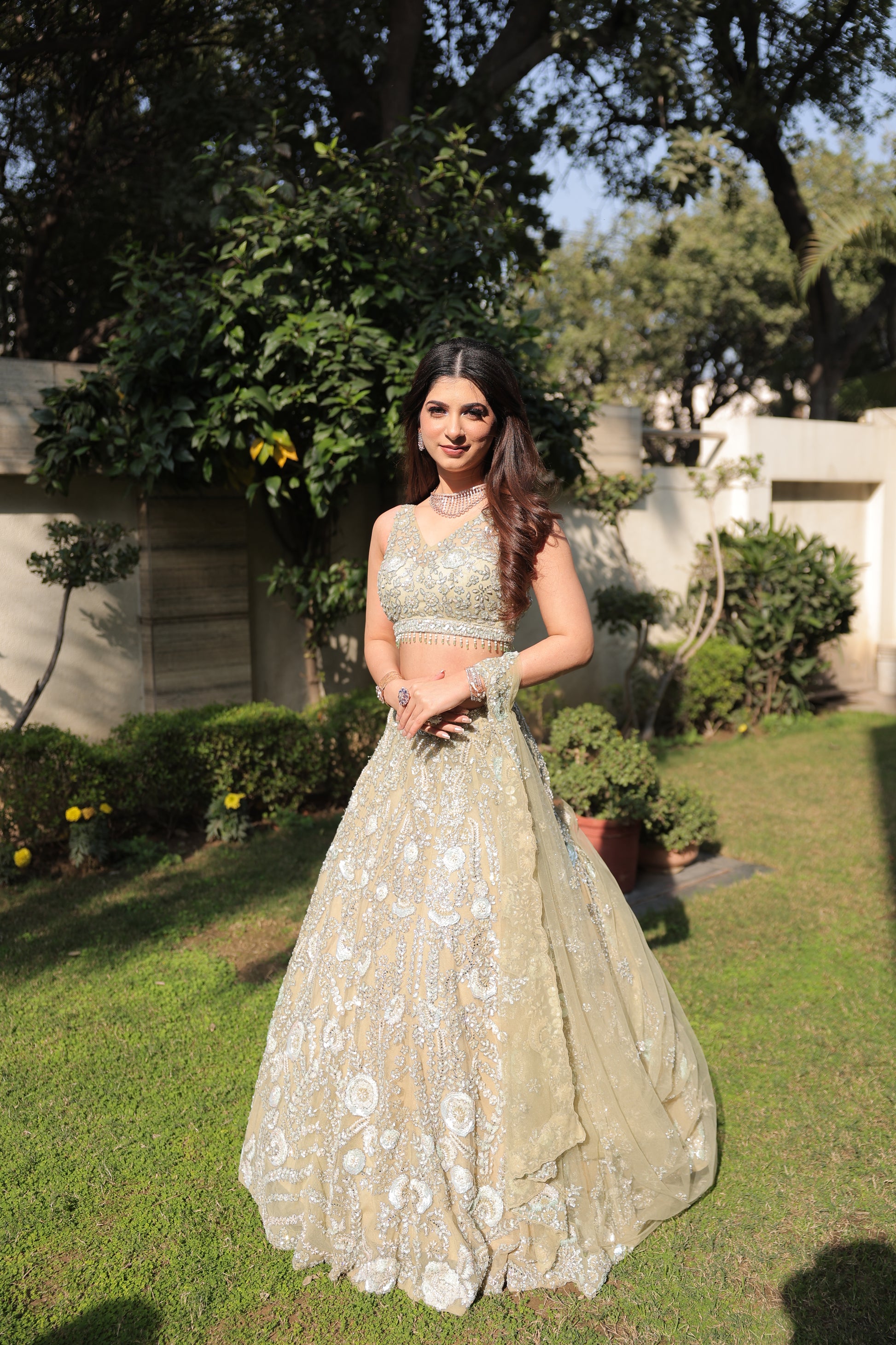 This outfit is a stunning pastel gold lehenga set, designed for a graceful and elegant look, perfect for daytime weddings and festive celebrations. It features: