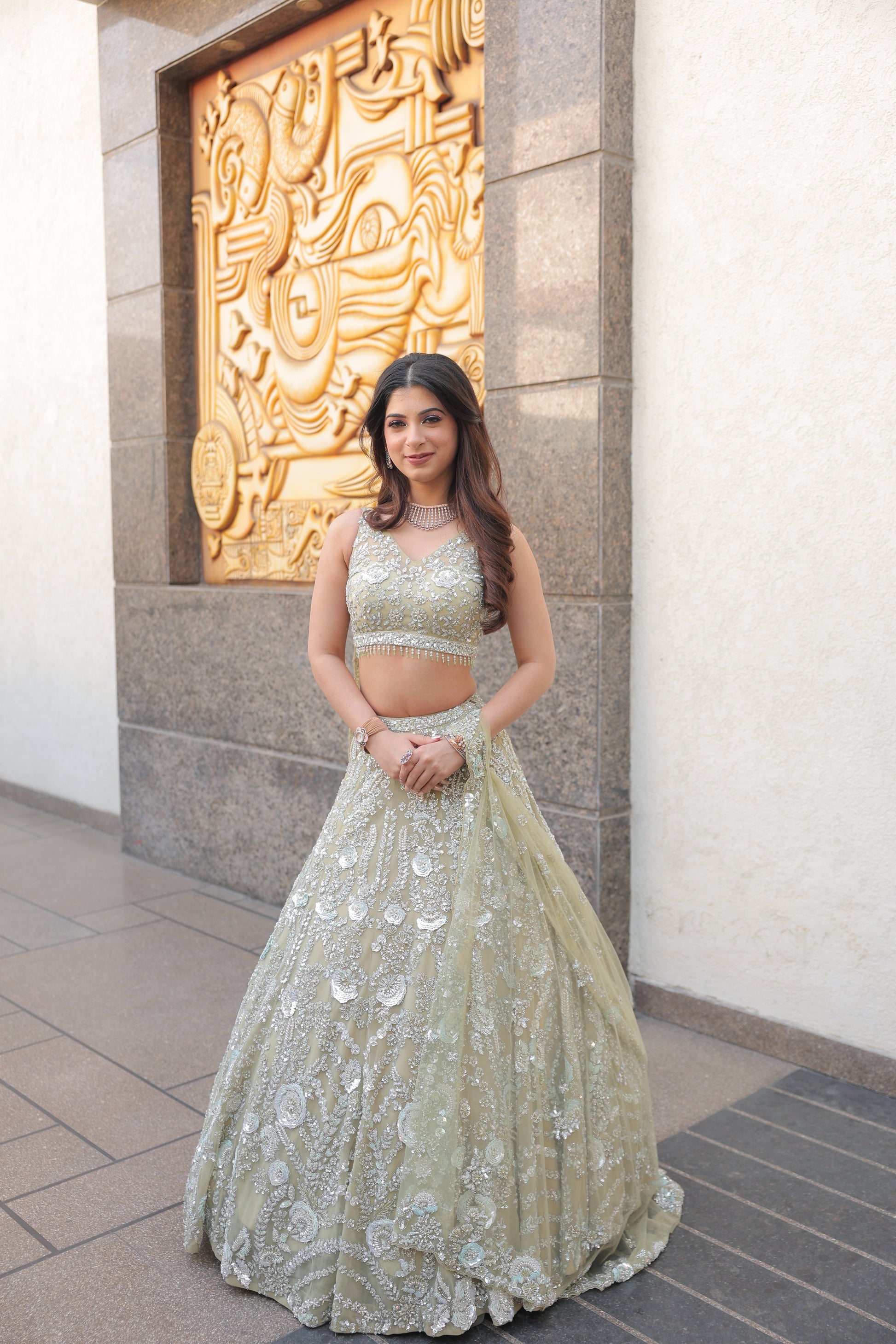 A heavily embellished lehenga with intricate silver and gold embroidery, sequins, and beadwork, creating a dazzling effect.