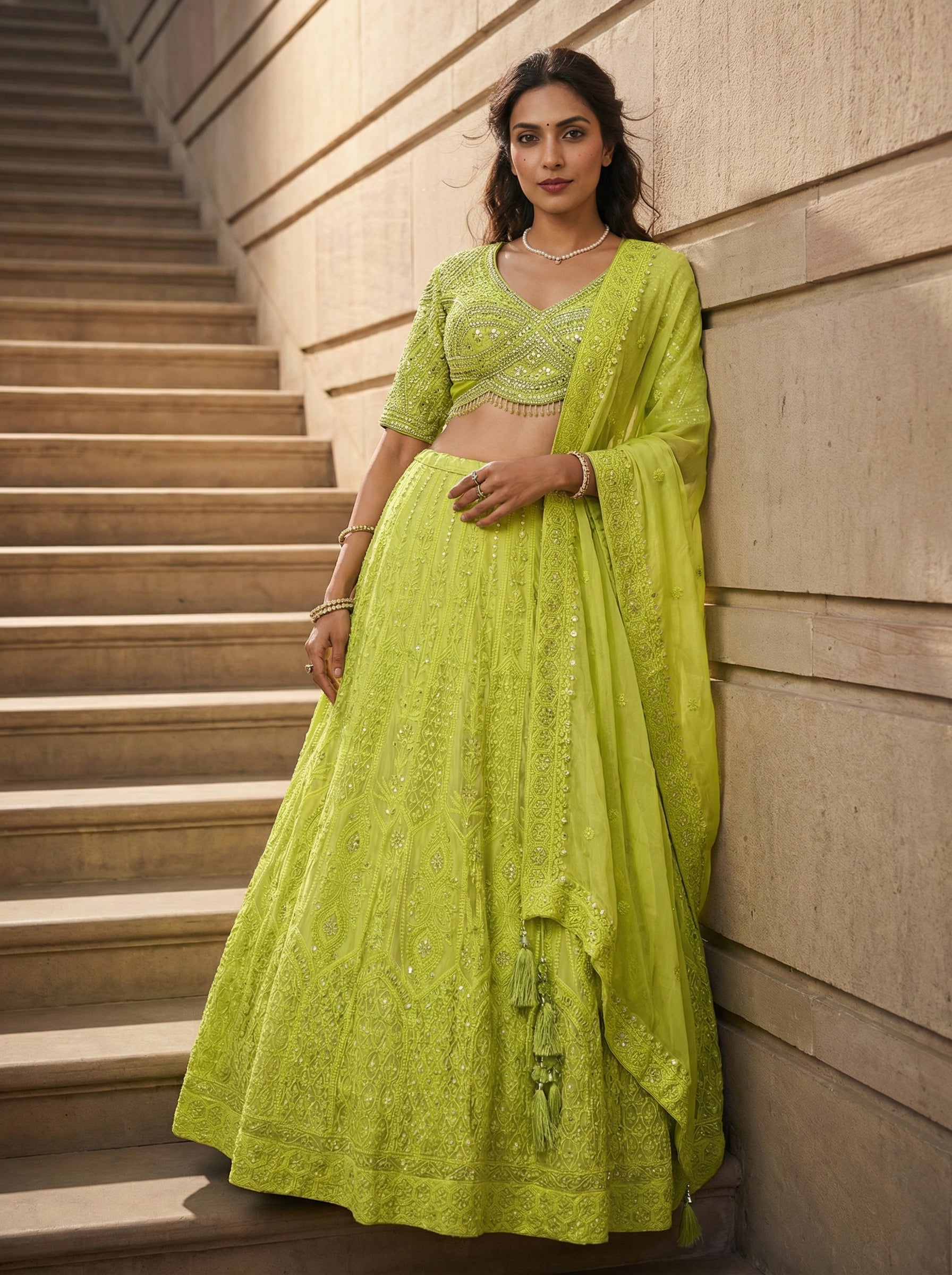This vibrant lime green lehenga is a stunning choice for festive occasions. The ensemble features a beautifully embellished choli (blouse) with a flattering V-neckline and what appear to be full, flowing sleeves. The intricate embroidery or sequin work catches the light, adding a touch of sparkle.