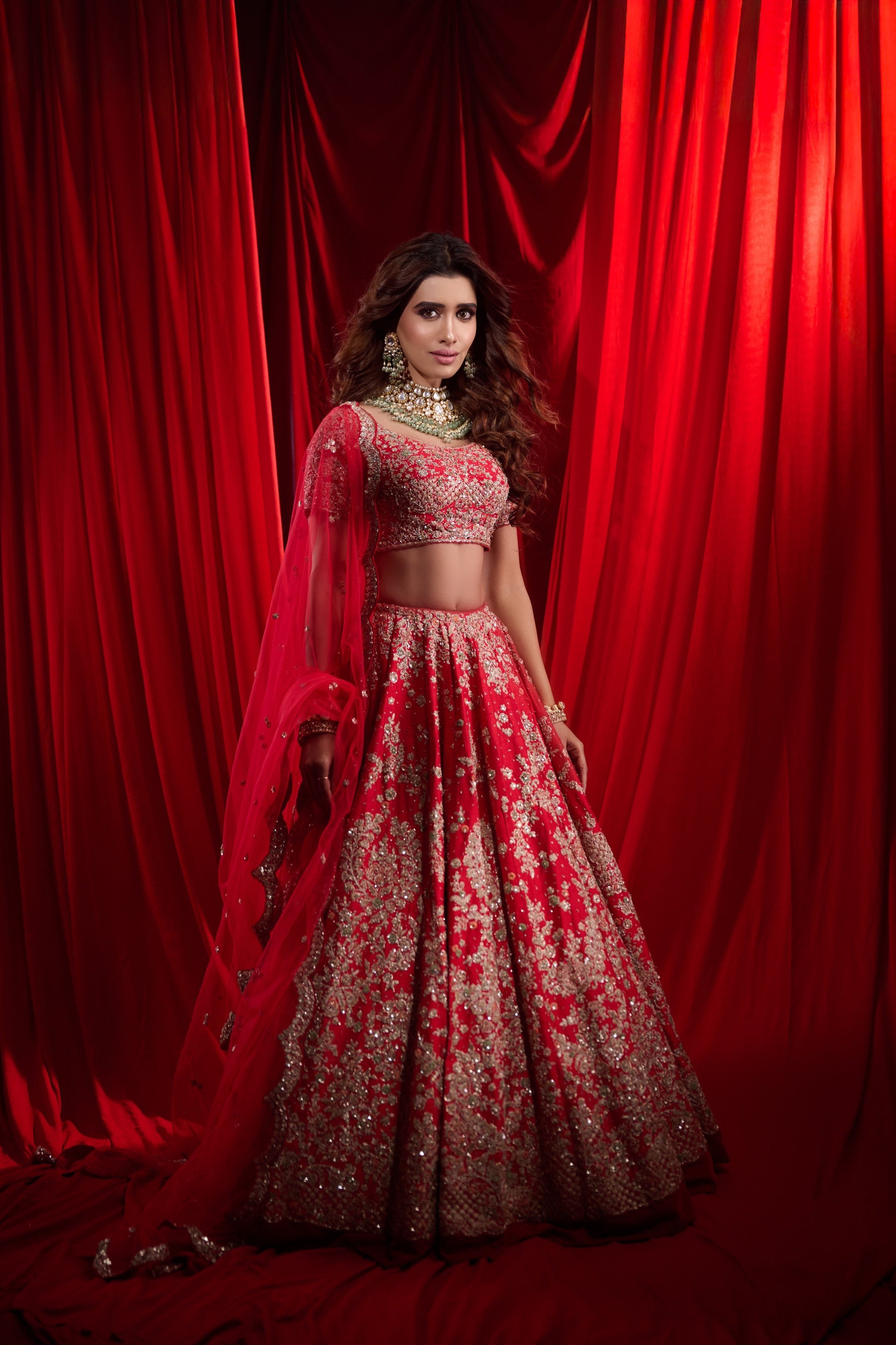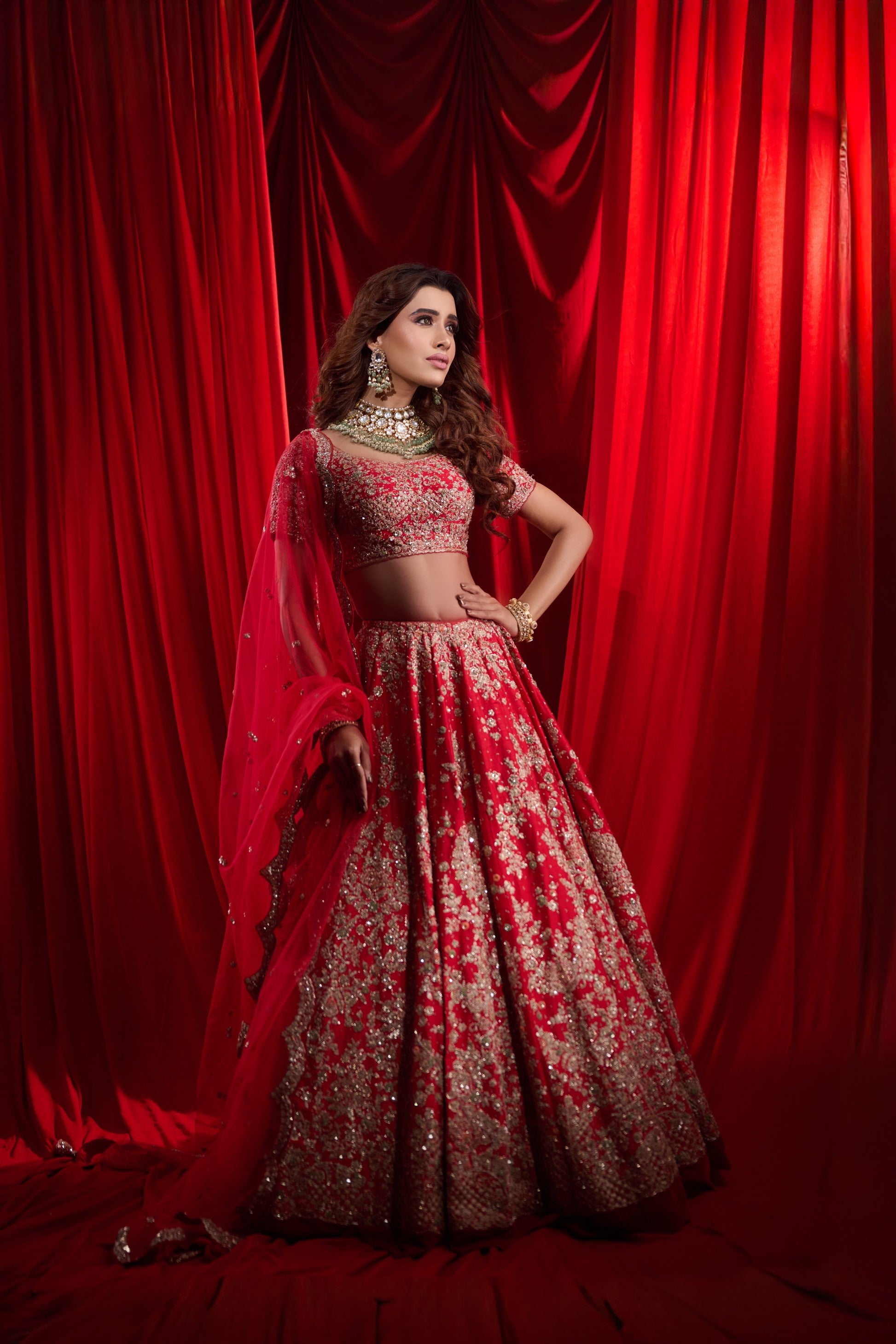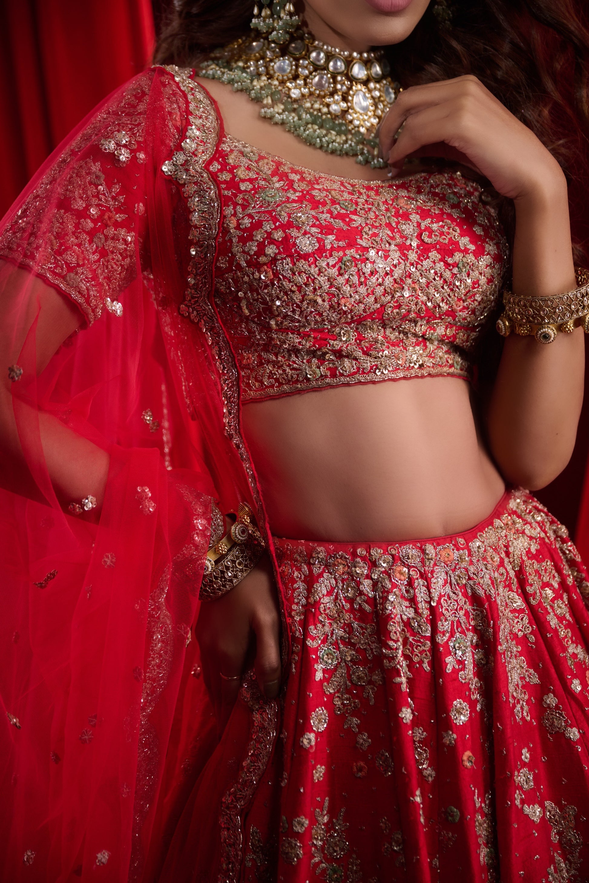 A fierce ode to tradition, the Radical Bloom Lehenga by Dolly J is a bold bridal statement. Crafted in a fiery red base, it features exquisite all-over floral embroidery in shimmering gold thread and sequins. The fitted blouse and voluminous skirt come together to create a look that’s both regal and radiant — made for the bride who owns the spotlight.