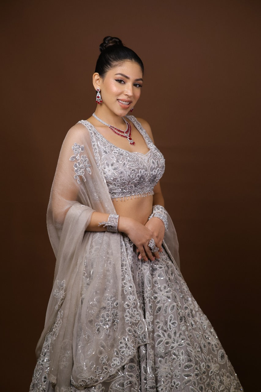 This silver-grey embellished lehenga is the epitome of modern glamour, designed for fashion-forward brides and wedding guests.