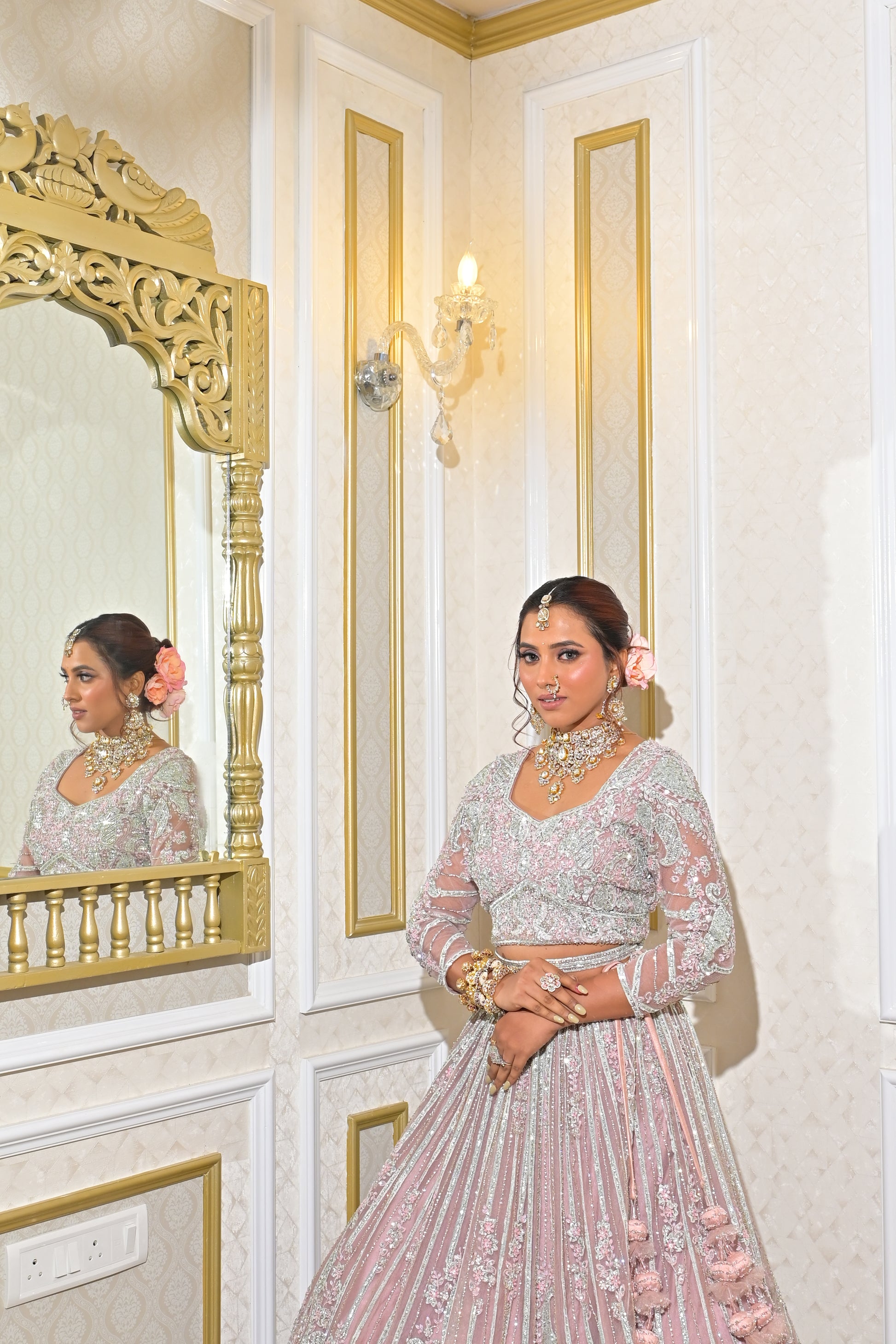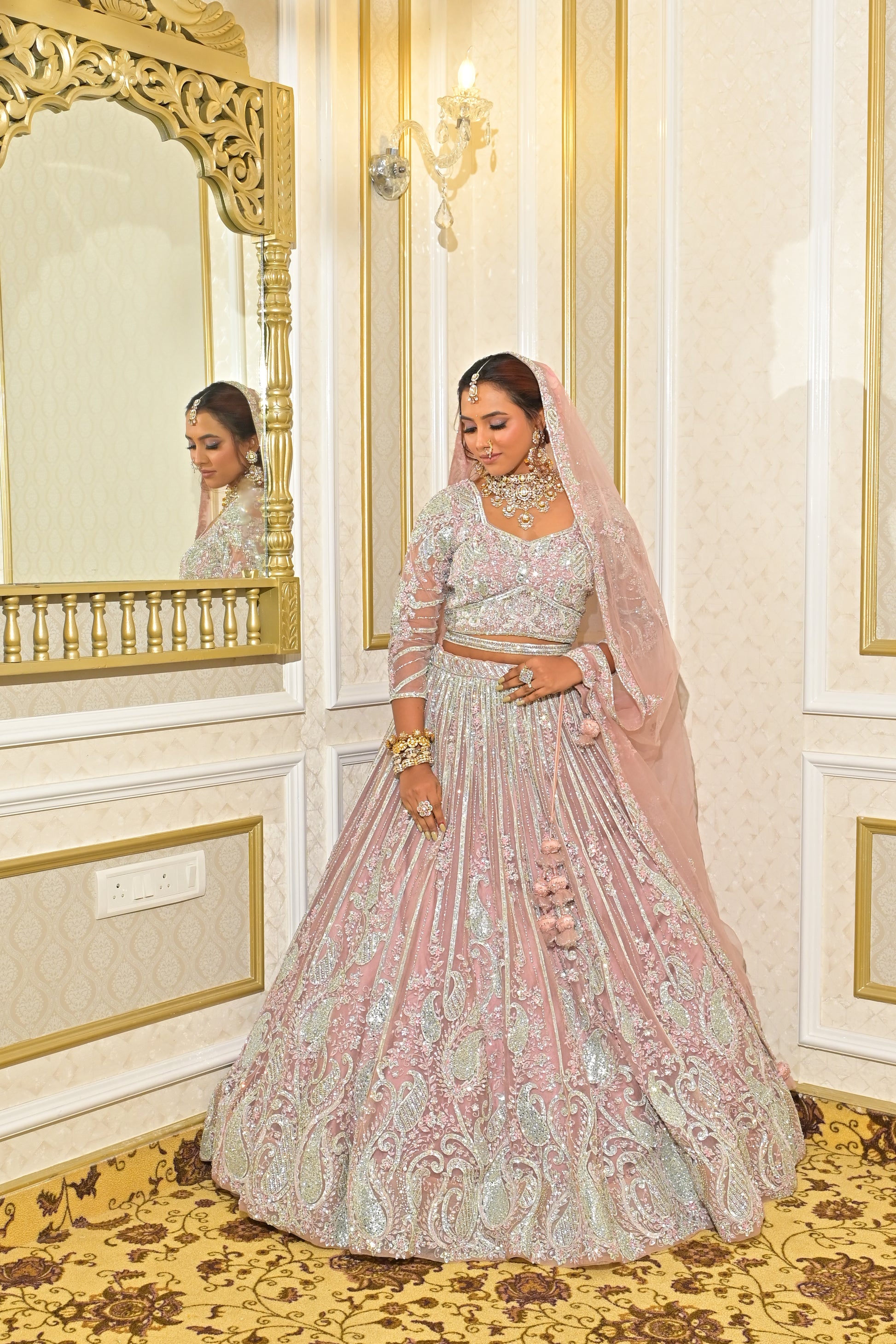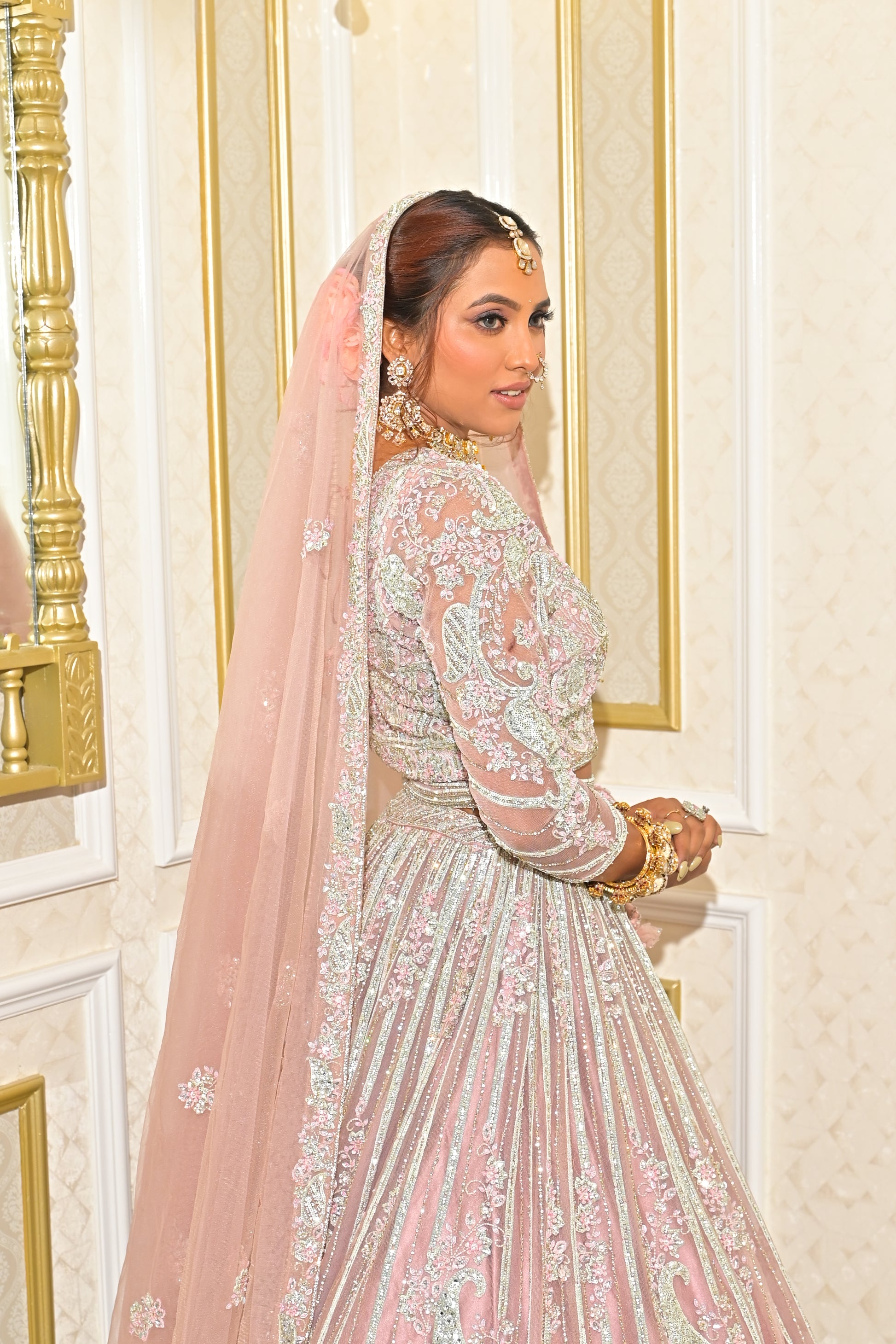 This blush pink bridal lehenga is a breathtaking masterpiece designed for the modern bride who adores elegance and grace.