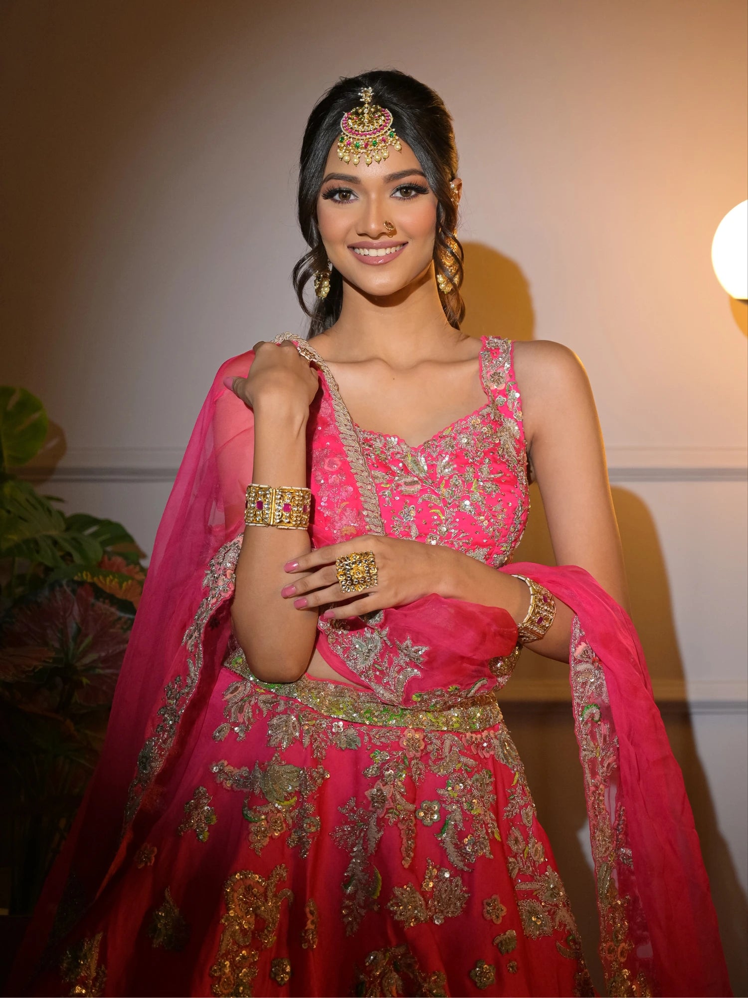 This vibrant hot pink lehenga is a dazzling choice for festive occasions. The ensemble features a beautifully embellished sleeveless choli (blouse) with intricate detailing, possibly involving embroidery, sequins, or beadwork, that adds a touch of sparkle and traditional charm.
