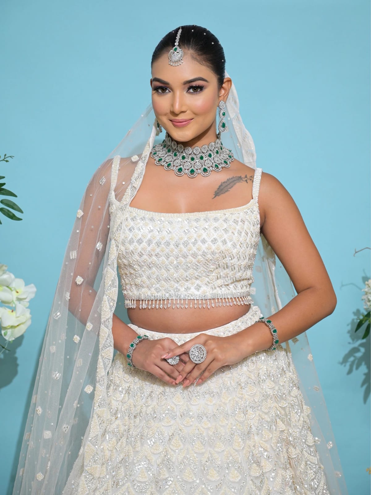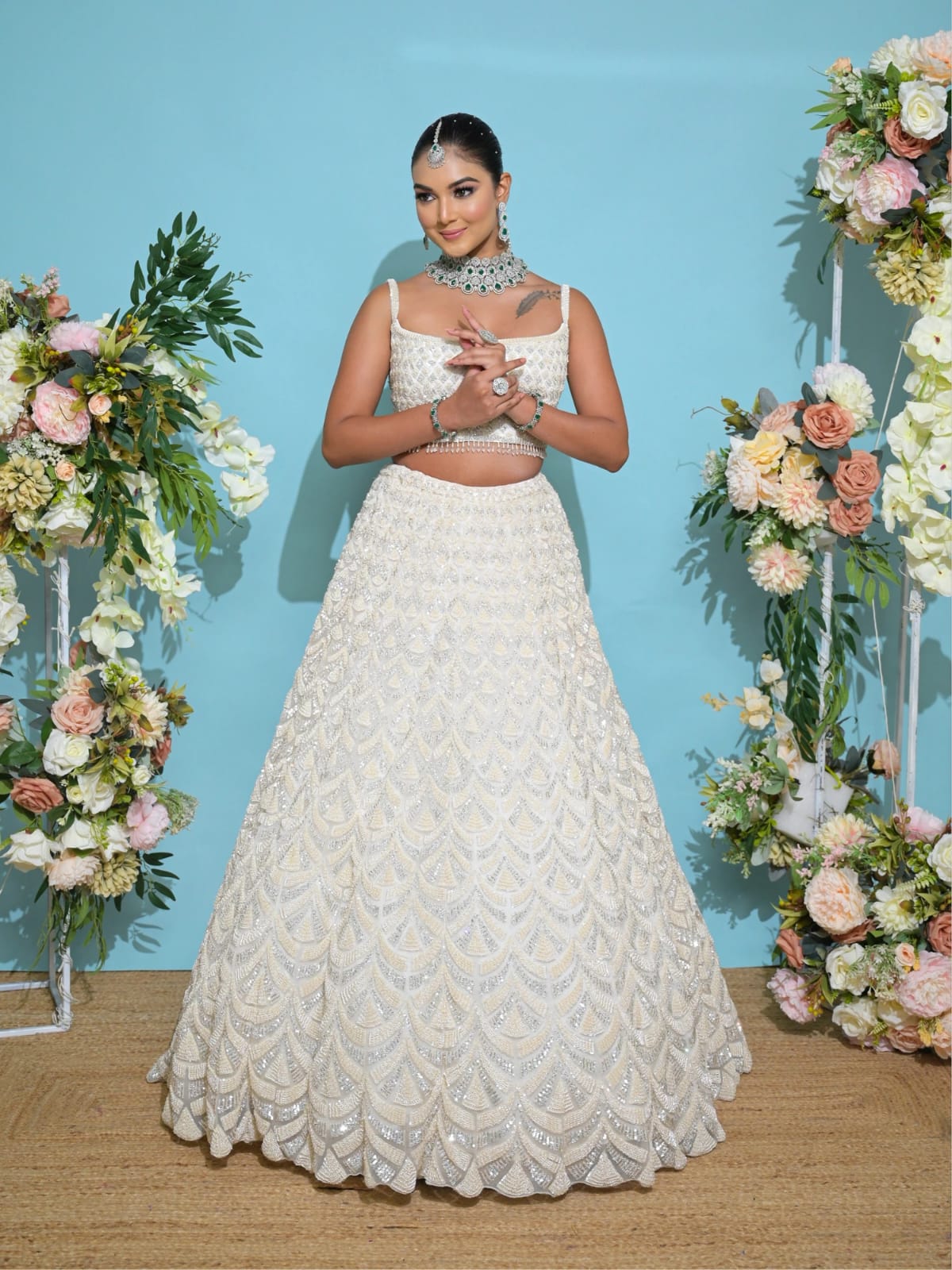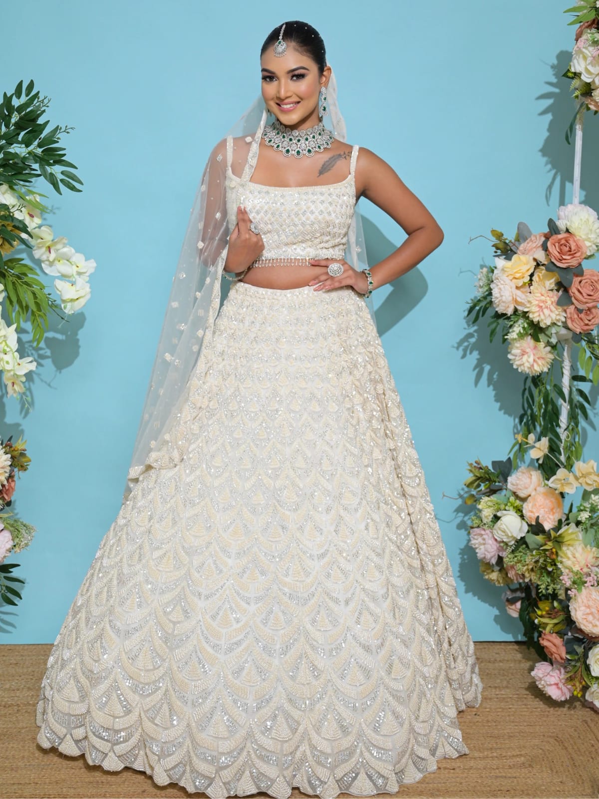 Make a show-stopping entrance in this ethereal ivory lehenga by Seema Gujral. Adorned with geometric sequin and pearl embroidery over luxe net fabric, this ensemble sparkles with every step. The structured blouse and sheer dupatta with pearl butis add modern elegance to this timeless silhouette — perfect for receptions, engagement parties, or contemporary bridal looks.