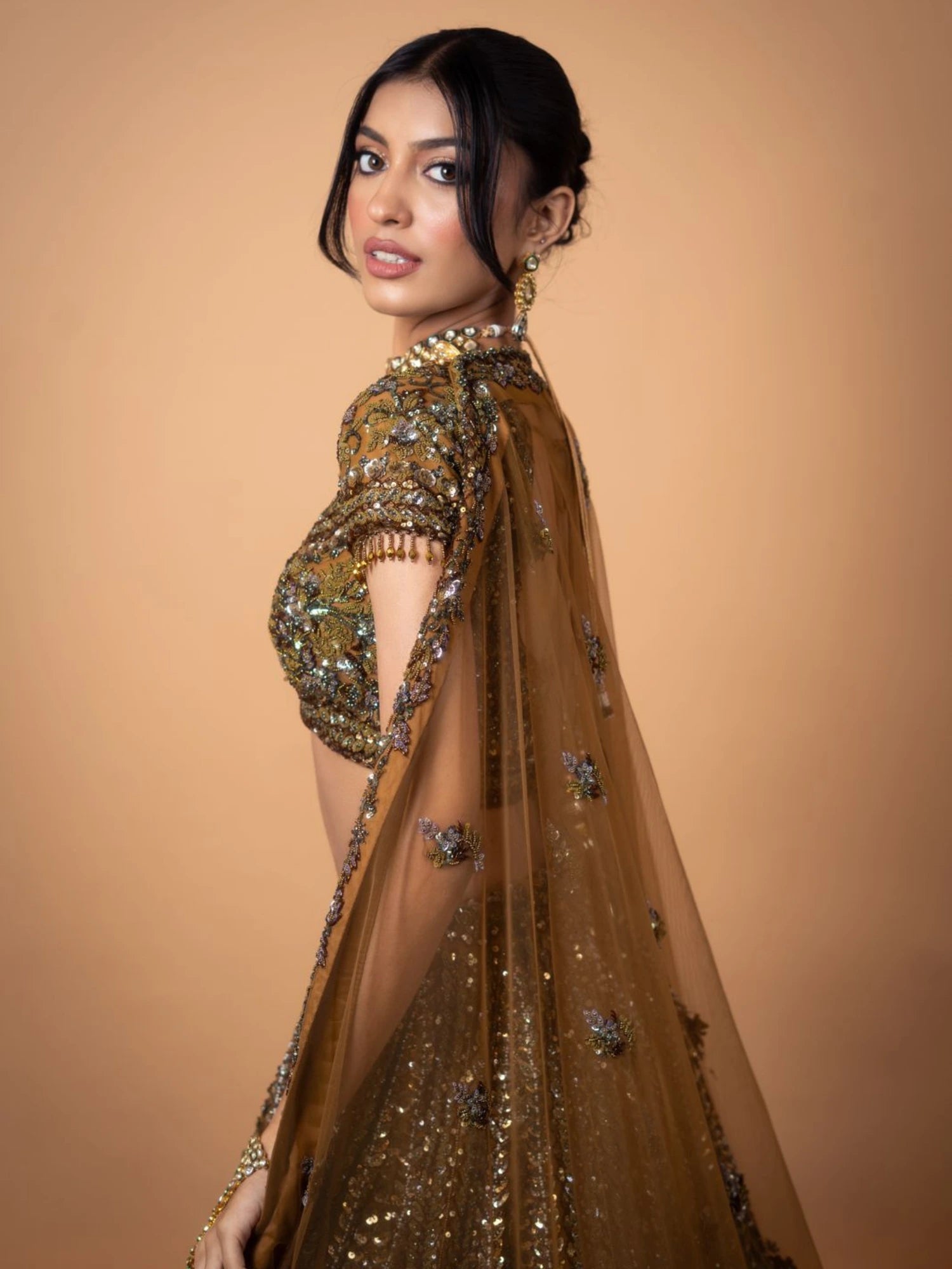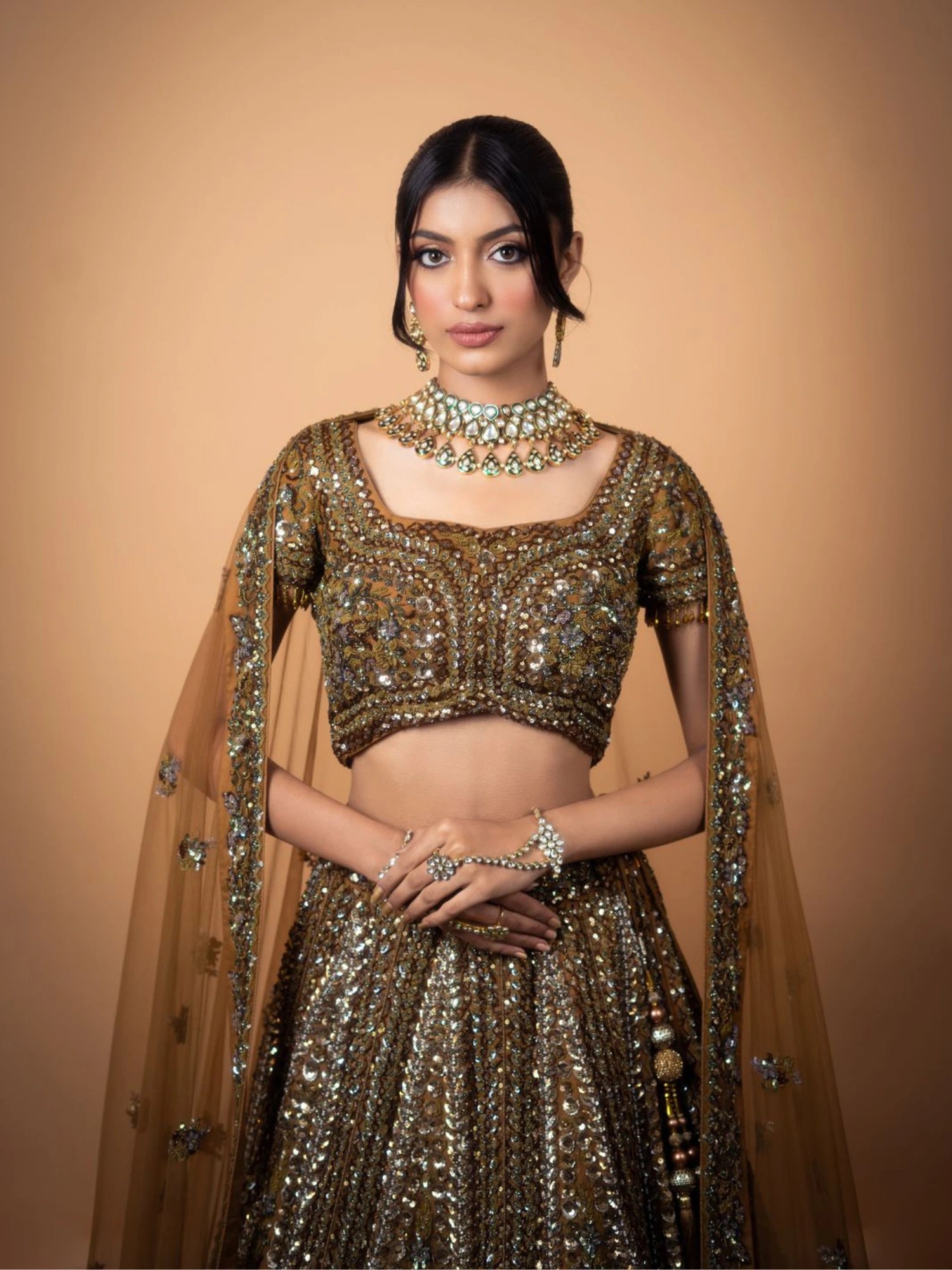 The choli, a short-sleeved blouse with a square neckline, is also richly embellished with matching gold and dark metallic work. A sheer dupatta in a coordinating dark olive or bronze hue is draped over the shoulders and arms, also featuring scattered embellishments and a decorative border.