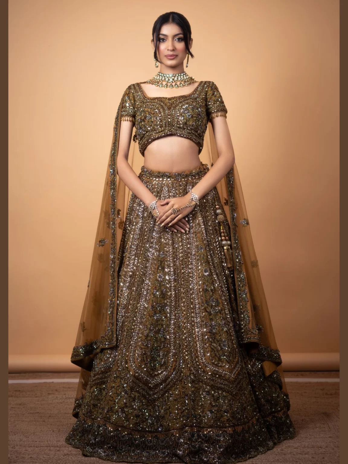 A person is elegantly posed in a heavily embellished, dark olive green or bronze-toned lehenga choli. The lehenga, a voluminous skirt, is densely covered in intricate gold and possibly darker metallic embroidery or sequins, creating elaborate patterns throughout. The hemline features a particularly ornate and wide border.